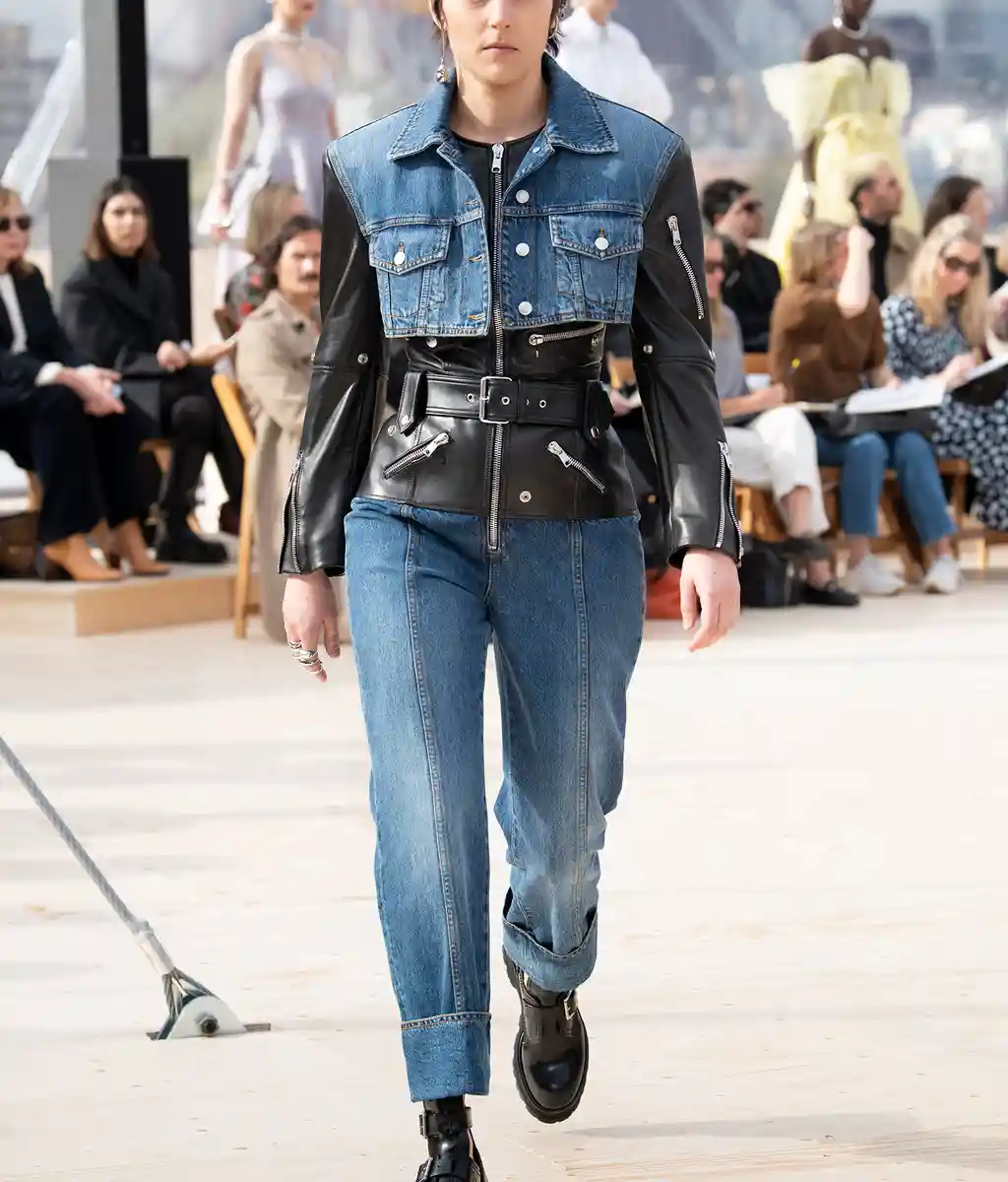 The balancing act went further: buttery tailored jackets with heavy black boots, pretty skirted dresses worn with cold, armour-like accessories and frilly, ruched dresses tightly belted at the waist with a harsh zip placed down the centre. And there was leather – lots of it – paired with frothy tulle or denim, and corseted tops with ballooned skirts flowing out of them.