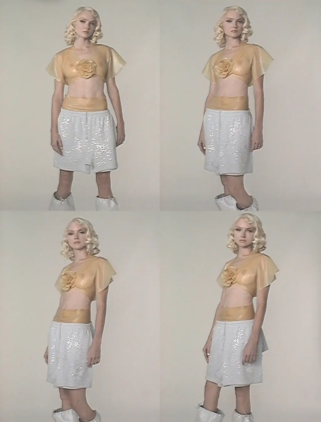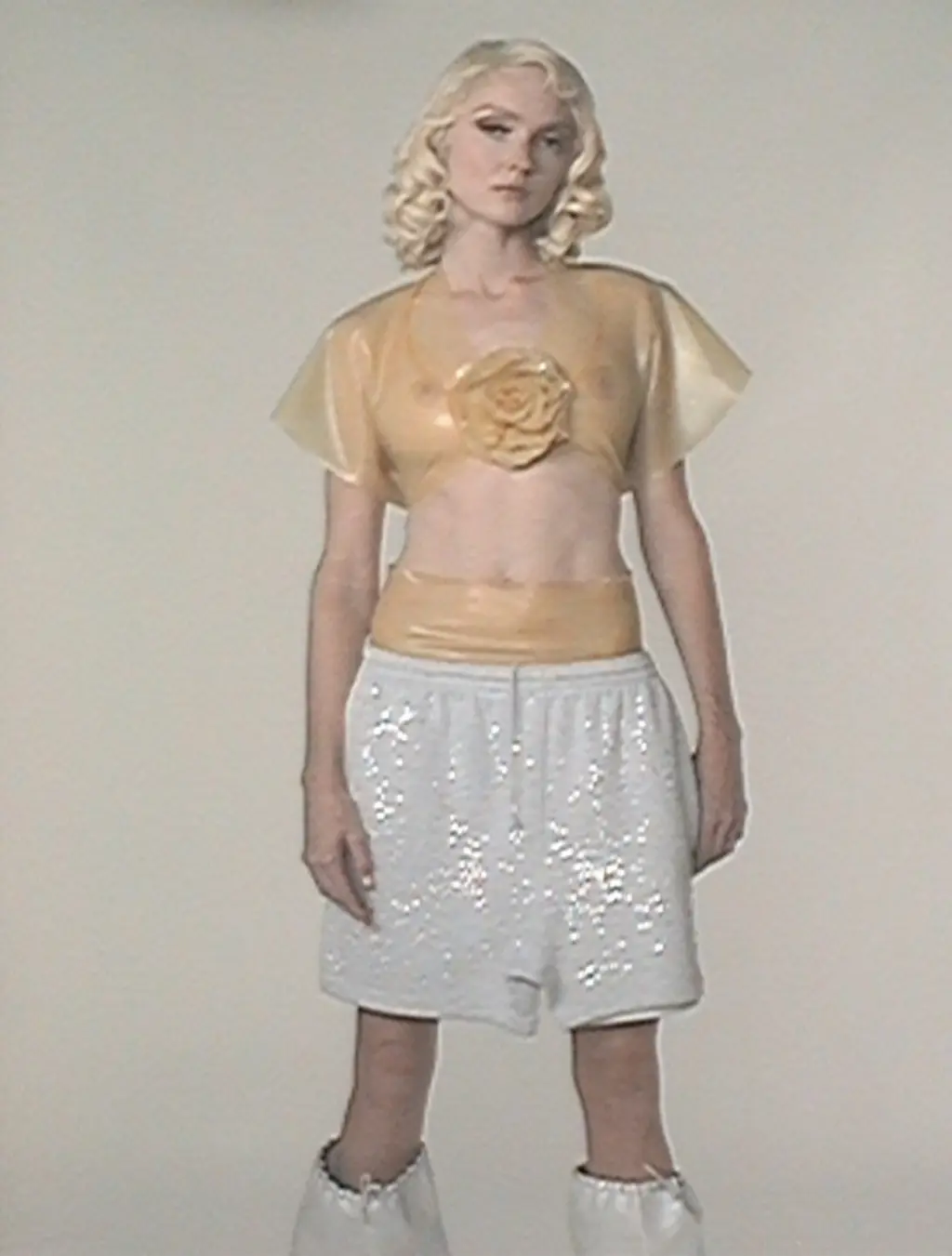 August: Our starting point is always the materials, so we sourced things that reminded us both of this pop star or showgirl character. You know: sequins, pearls, mini shorts and skirts. We combined these with the idea that [Allina] immediately grows old and becomes outdated. So we also worked with old women’s pyjama-like nightgowns and tin cookie jars; elements that referred to Allina as an old woman, thinking about who she once was. If we started the collection with a perfect pop star, this bit was about her falling apart.