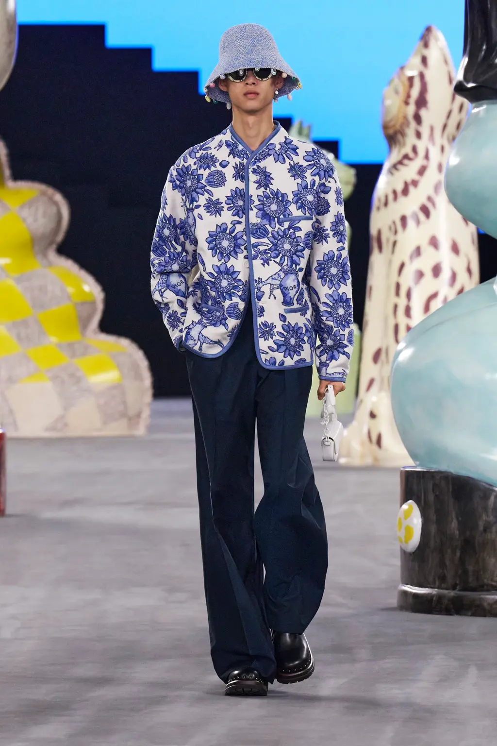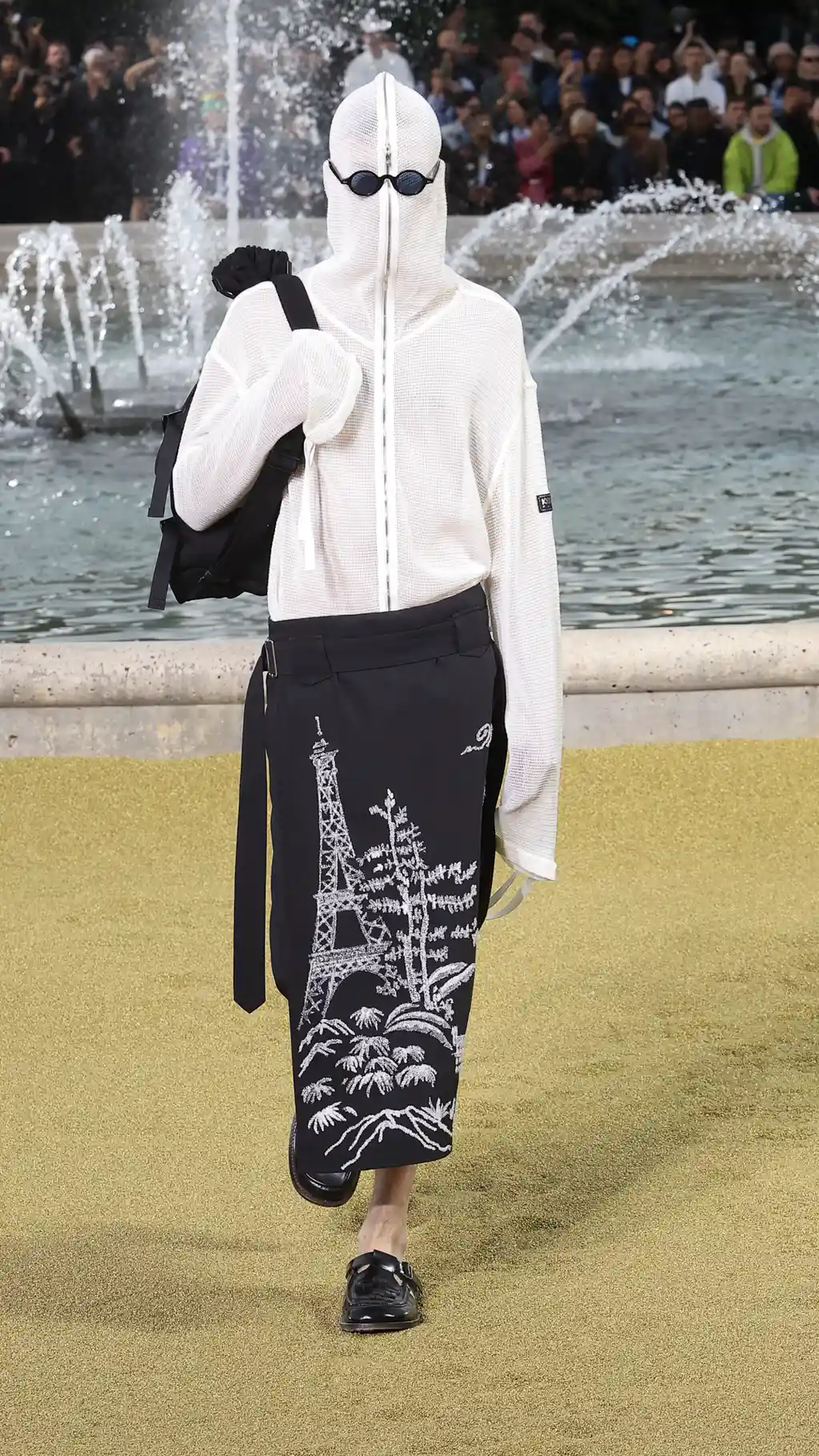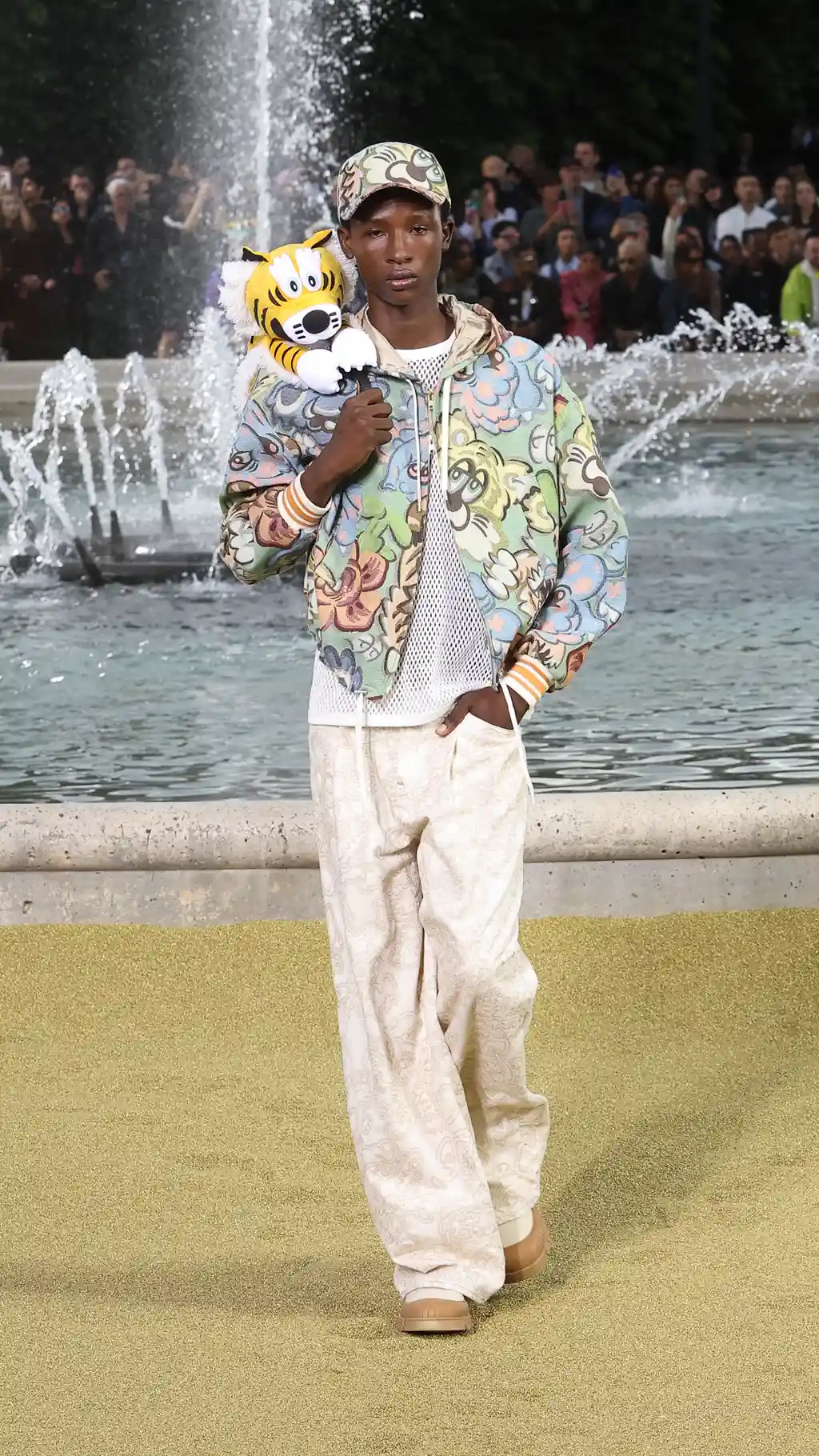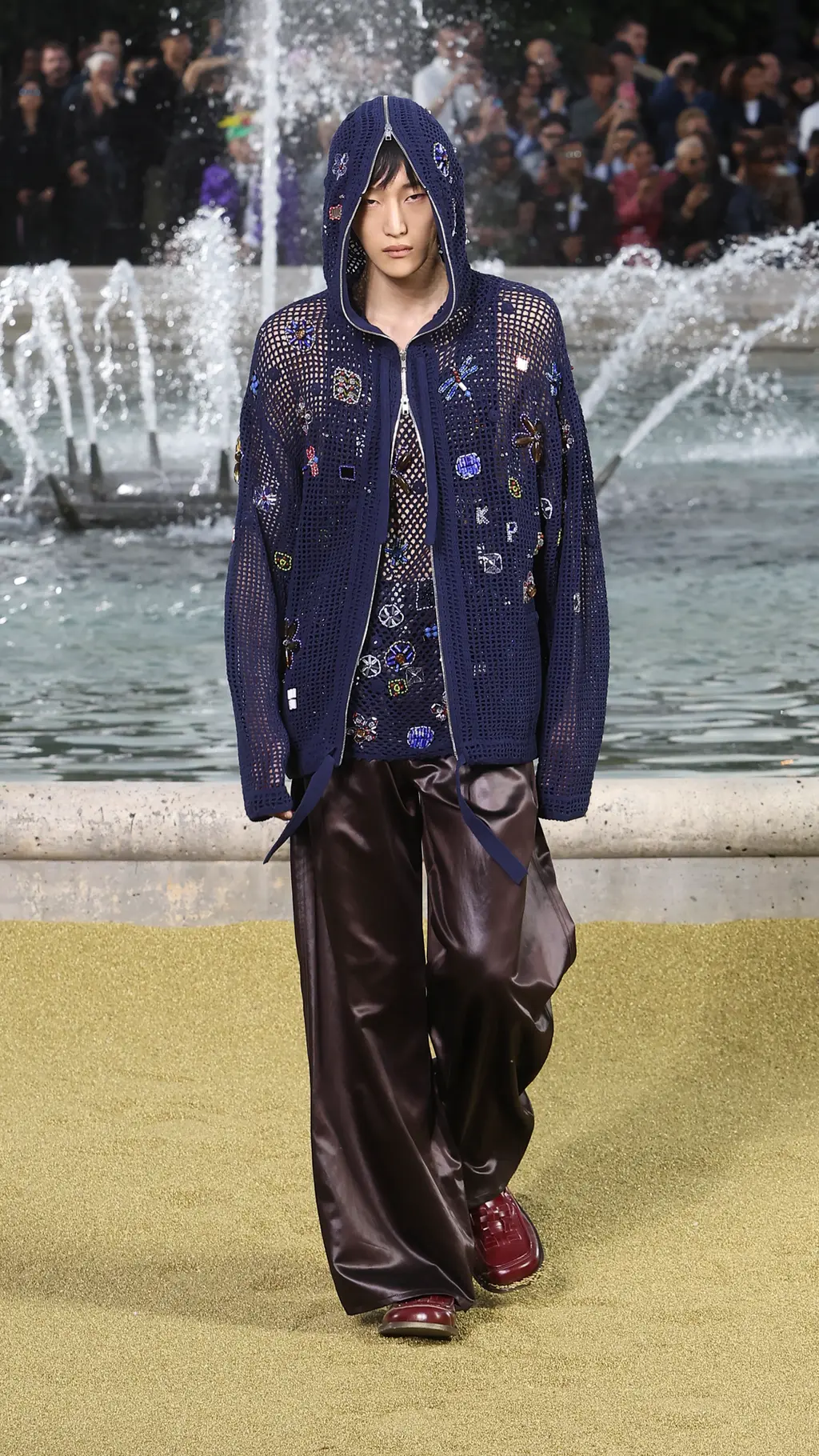 One to remember from artistic director Nigo. Held on the grounds of the Palais-Royal during golden hour, the collection saw peonies emblazoned on jacquard prints, knit hoodies embellished with glass hand-beading, beach-ready platform thong-slippers (!), and kaleidoscopic bleached denim, with a dash of washed-out leathers. Fun bits included a toy lion perched on a model’s shoulder, and a another with a hoodie zipped up, covering their face.