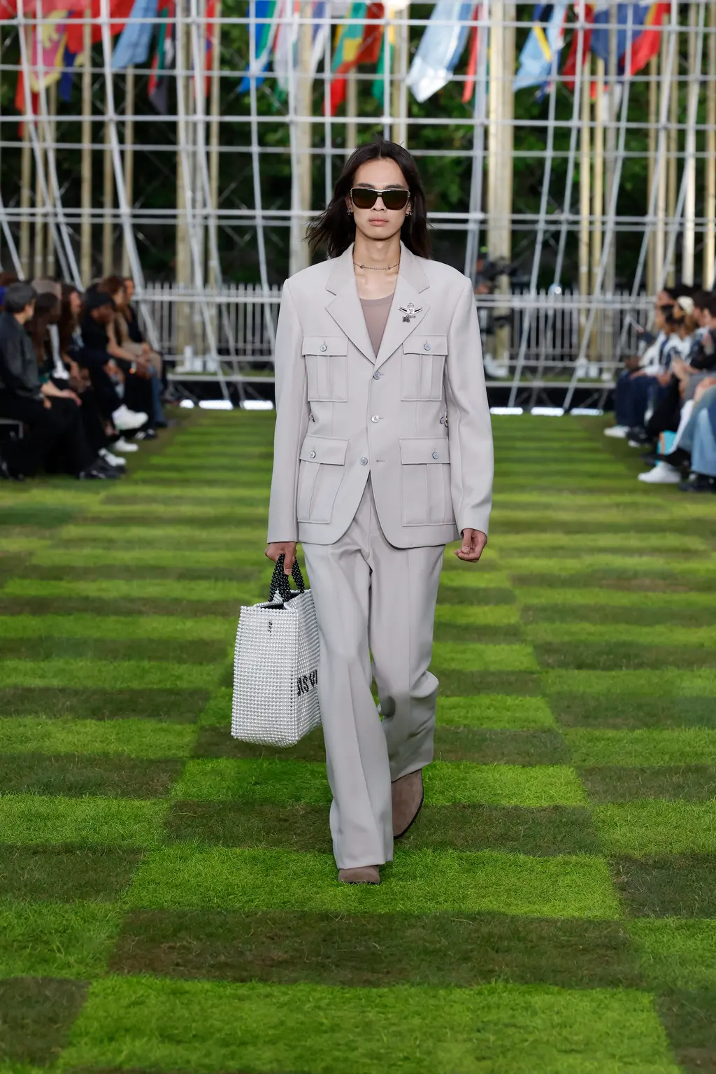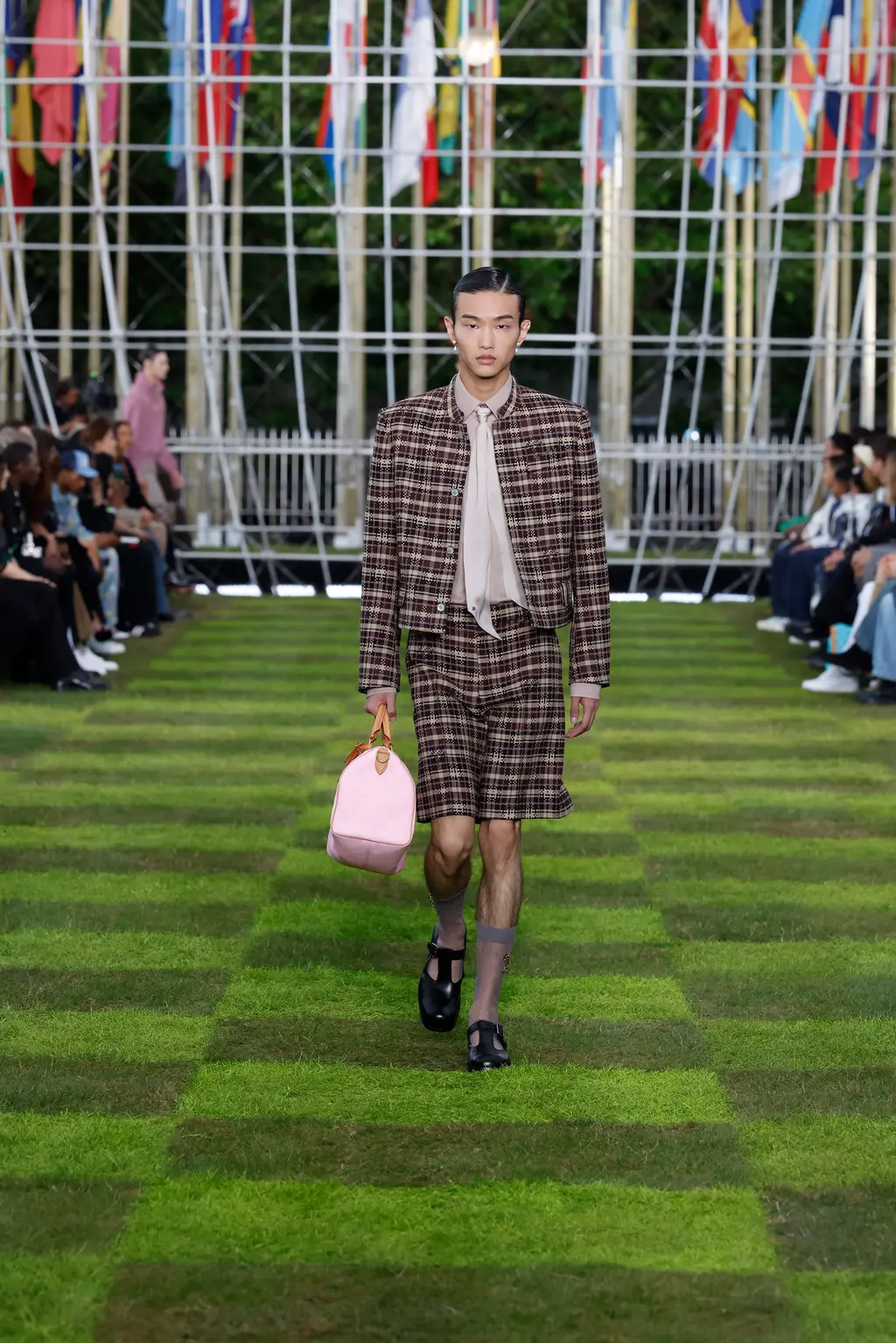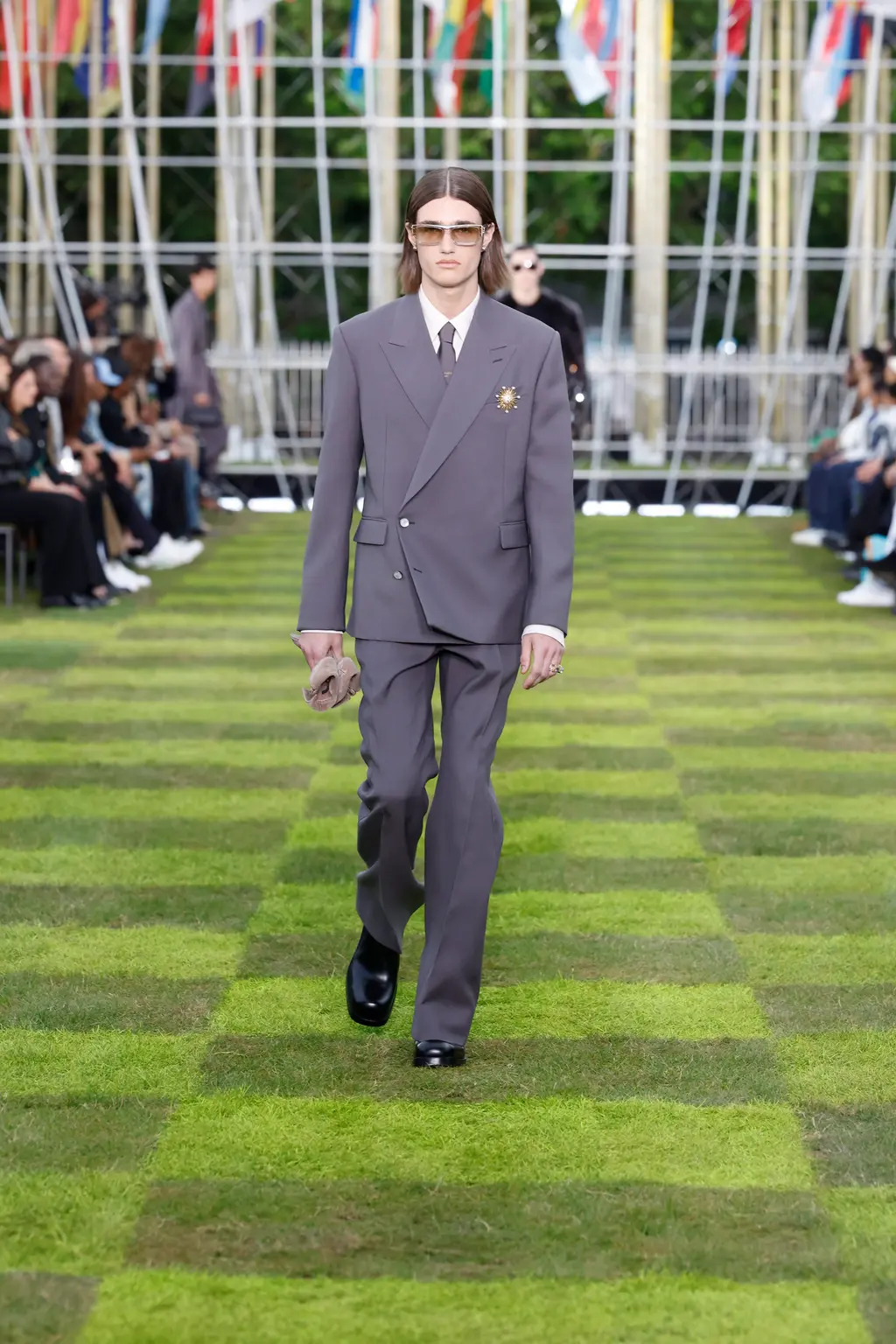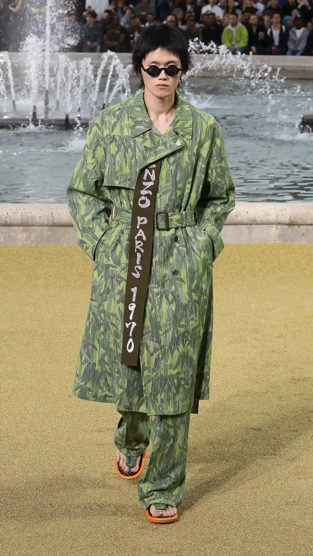 One to remember from artistic director Nigo. Held on the grounds of the Palais-Royal during golden hour, the collection saw peonies emblazoned on jacquard prints, knit hoodies embellished with glass hand-beading, beach-ready platform thong-slippers (!), and kaleidoscopic bleached denim, with a dash of washed-out leathers. Fun bits included a toy lion perched on a model’s shoulder, and a another with a hoodie zipped up, covering their face.