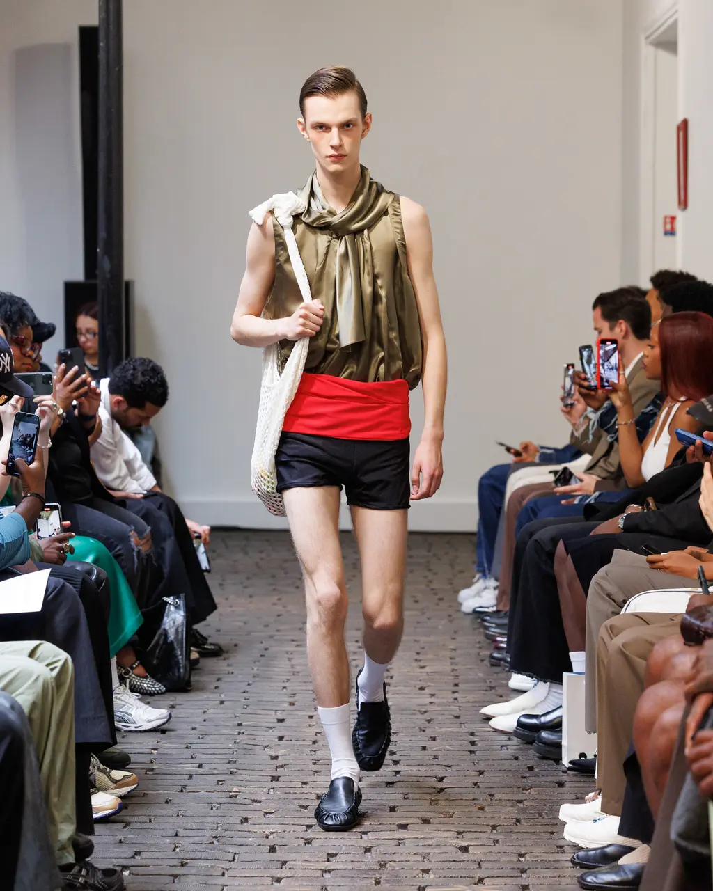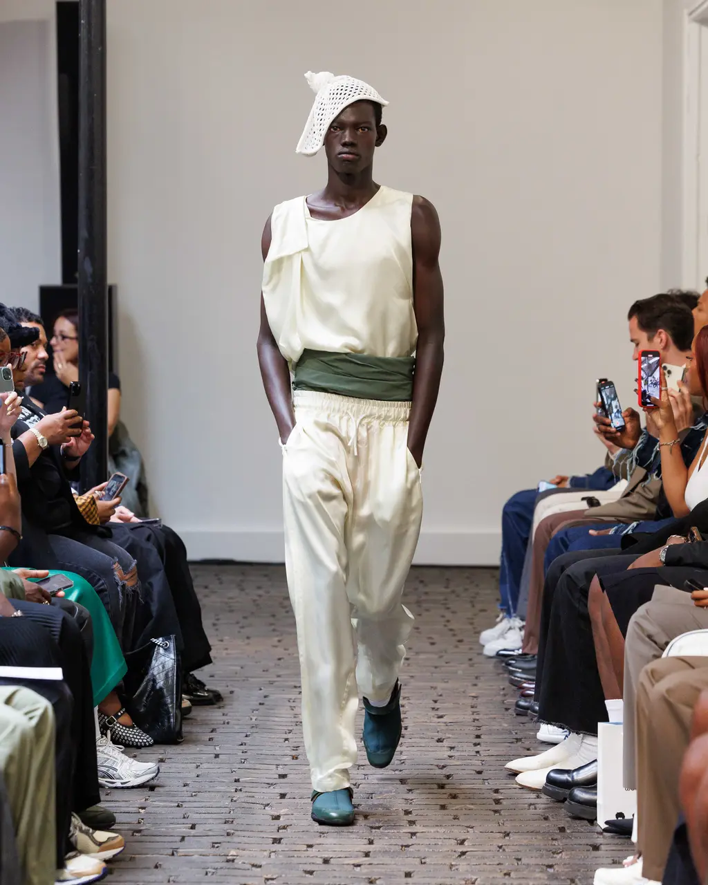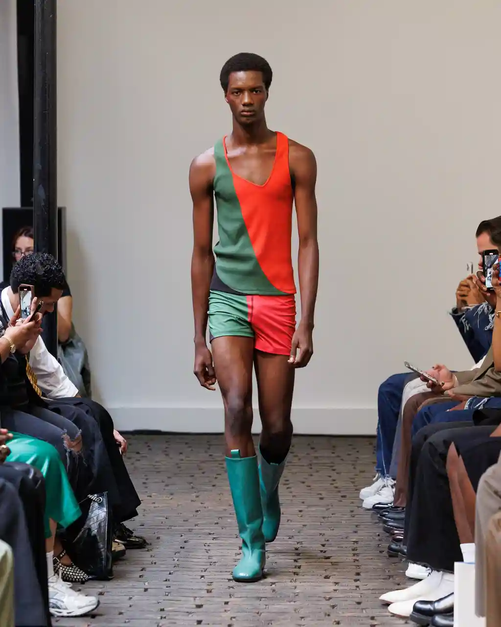 It was very pointedly a story about the ease, casualness, and elegance of by-the-sea attire. Wales Bonner was ready to escape to sunnier climes and, honestly, same. According to the 32-year-old South Londoner, dusk is when things get interesting. Designs included mini swim shorts in red and white, embellished ivory flats, boxy striped T‑shirts, sweater vests, and floral blazers. The head-turning cowhide velcro trainers and a glimpse of more from her longstanding Adidas collaboration, immediately caught the eyes of front-row guests A$AP Nast and Brent Faiyaz.