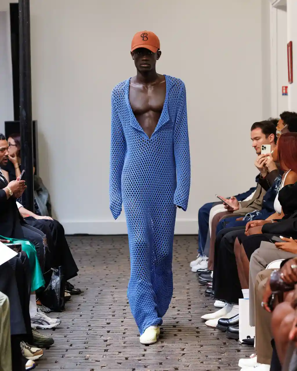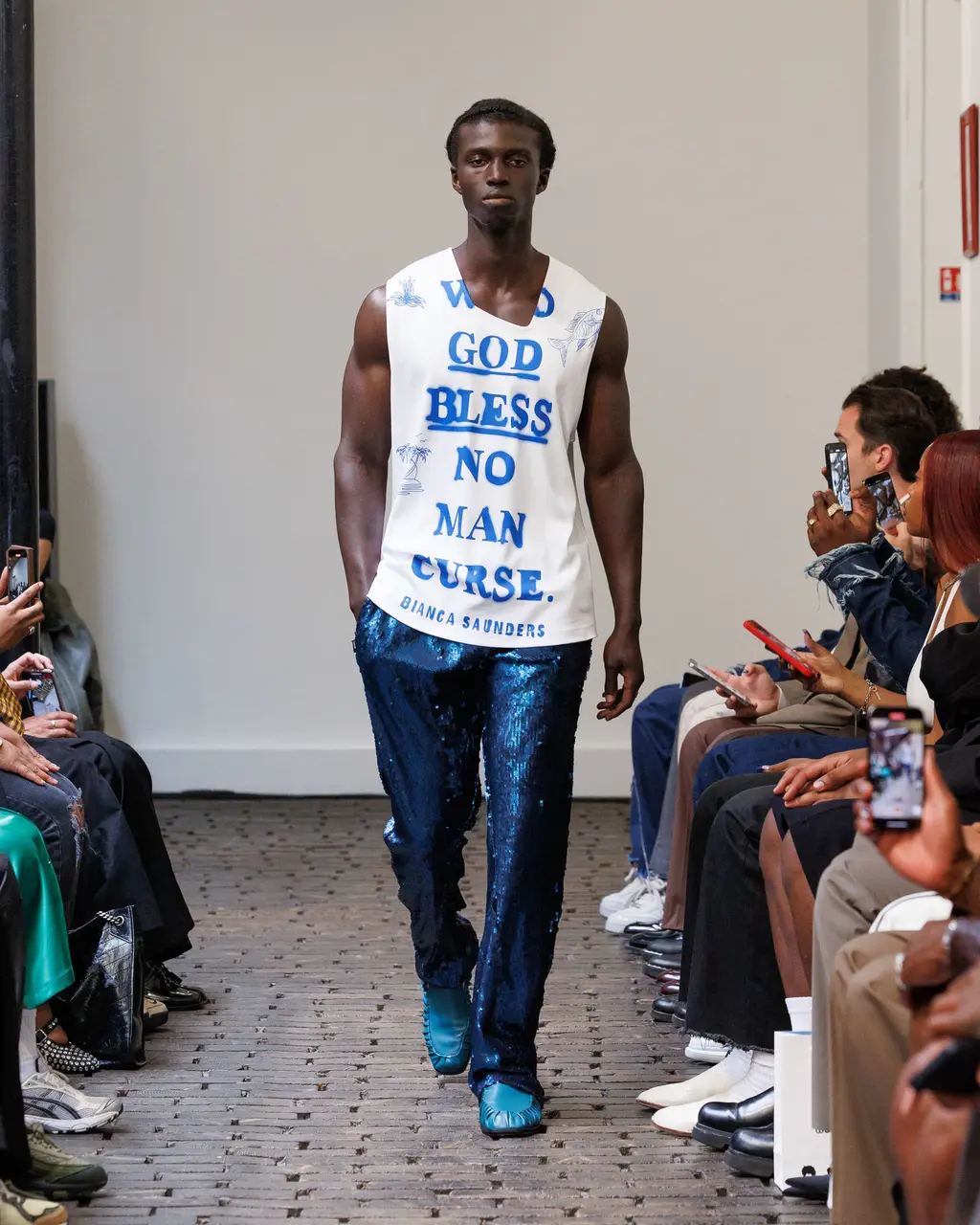 An amalgamation of hallmark British tailoring and a celebration of her roots encapsulates the young designer’s latest line. An exciting line-up of knitted two-tone sets, hats, and vests exhibiting common phrases from Caribbean households and gaudy sayings from key chains ran throughout. Eye candy came in the shape of sequin tracksuits mirroring the sky in the dead of night, amorphous ripple print shirts mimicking the shape of a male body, knitted hats, wool-blend trousers, and shorts, in cupro and poplin, honour Jamaican school uniforms. Saunders partnered with Portuguese footwear company Valuno to fashion six shoe styles ranging from mid-calf boots to distressed loafers. The South London-based creative’s longtime friend and Royal College of Art peer Saul Nash worked on movement direction, too.
