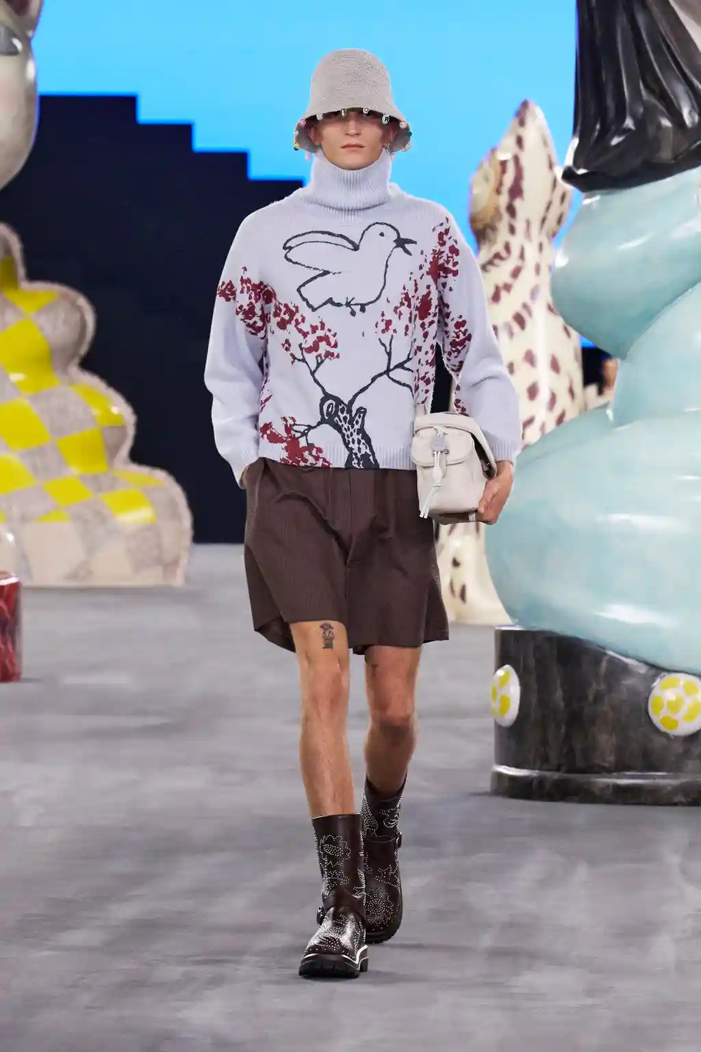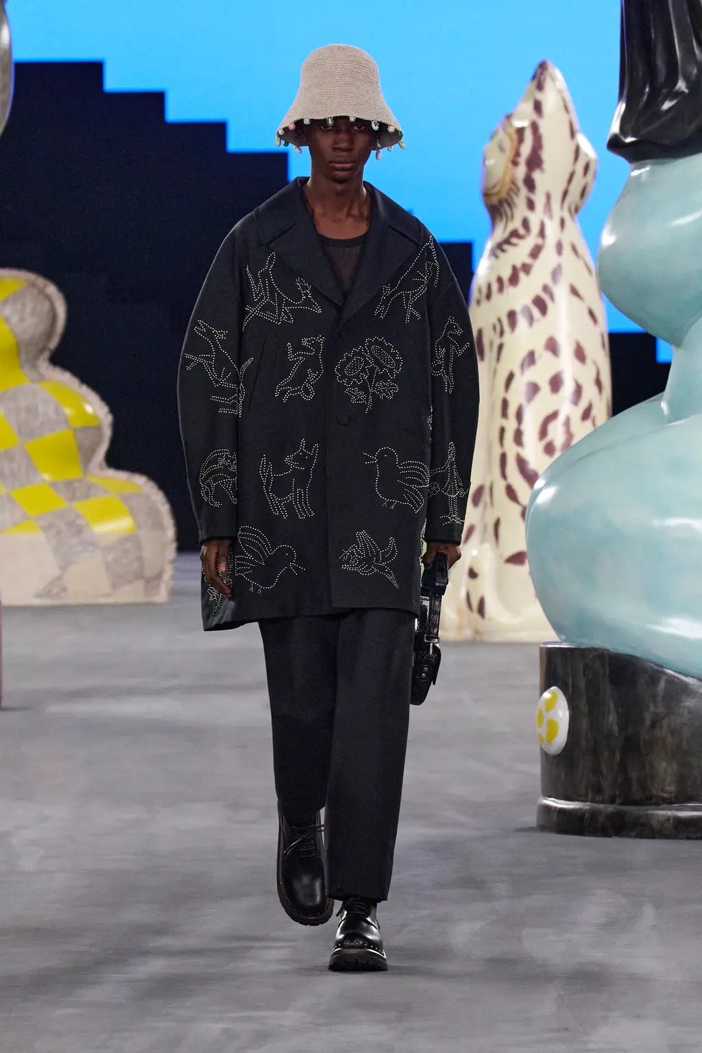 Blown-up sculptures of South African artist-potter Hylton Nel’s work were spread throughout the vast catwalk. Illustrations of animals by Nel were embroidered onto polished suits and intarsia knitwear. Blues, pinks, whites and navys worked themselves into the collection, while tons of hair-gel emulated a wet-look hair. It was the accessories that had everyone gawping: particularly the glossy ceramic collars, elevated outerwear, and studded boots.