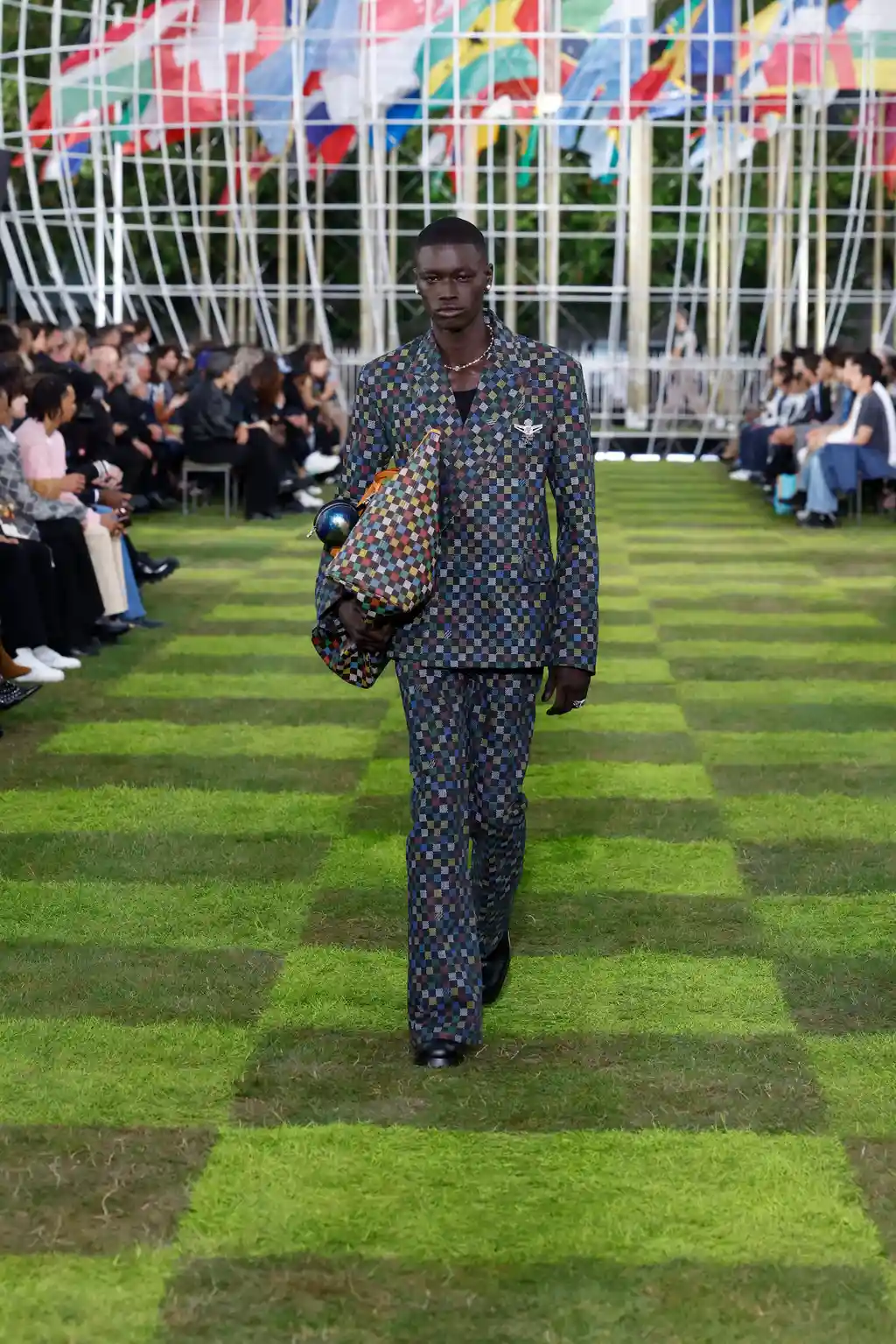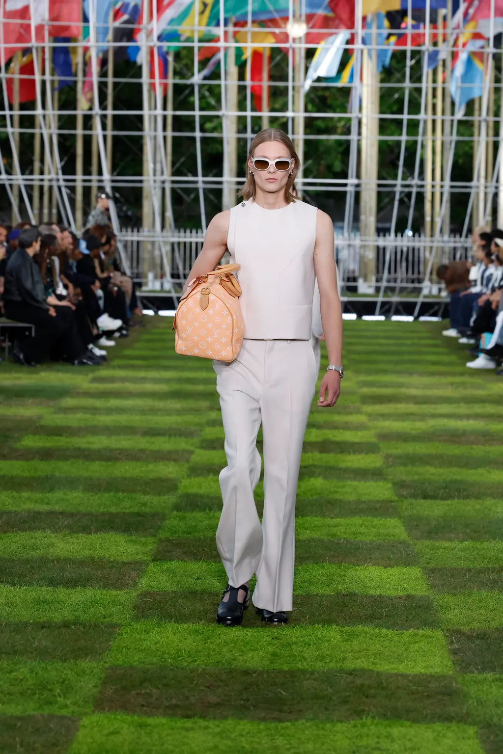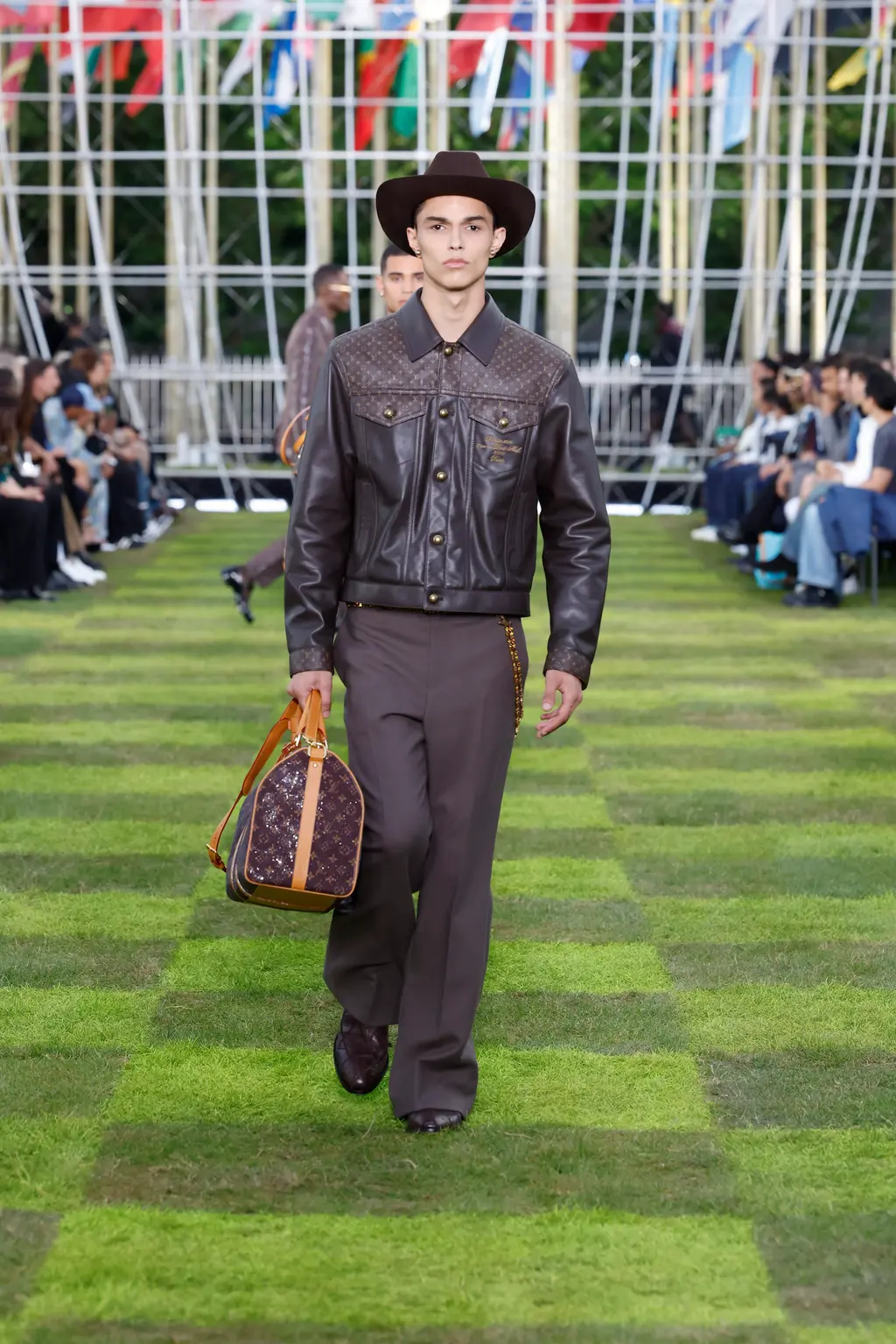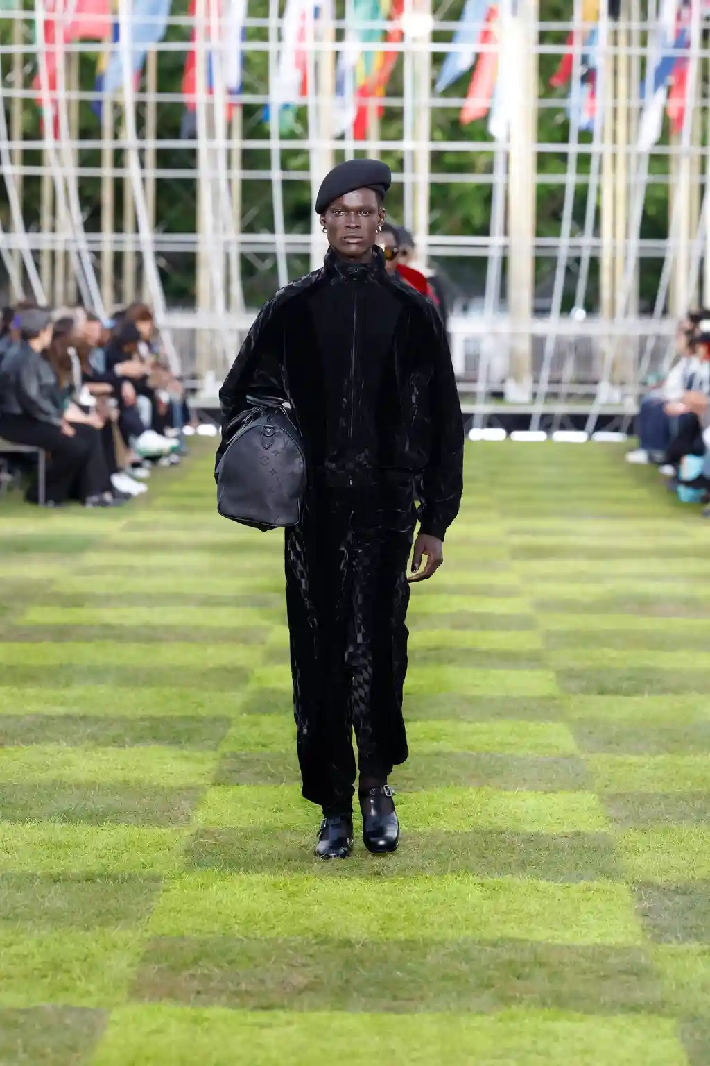 Escapism was at the heart of Pharrell’s moodboard this season. Transfixed by the idea of globe-trotters, he set about crafting a collection that transported the audience to far-flung corners of the world. Via a spectacular production, Williams ruminated on archetypes of travellers reflected by aviator-style bombers, large trunks and neckerchiefs tied around models’ necks. Guests invites came via engraved Louis Vuitton Apple AirTags – a must-have for any sightseer. Transparent, cherry red garments with LV monogramming slapped across trunks, raincoats, briefcases and hoods, piqued the interest of attendees. As the collection continued, Pharrell only amped up the glamour.
