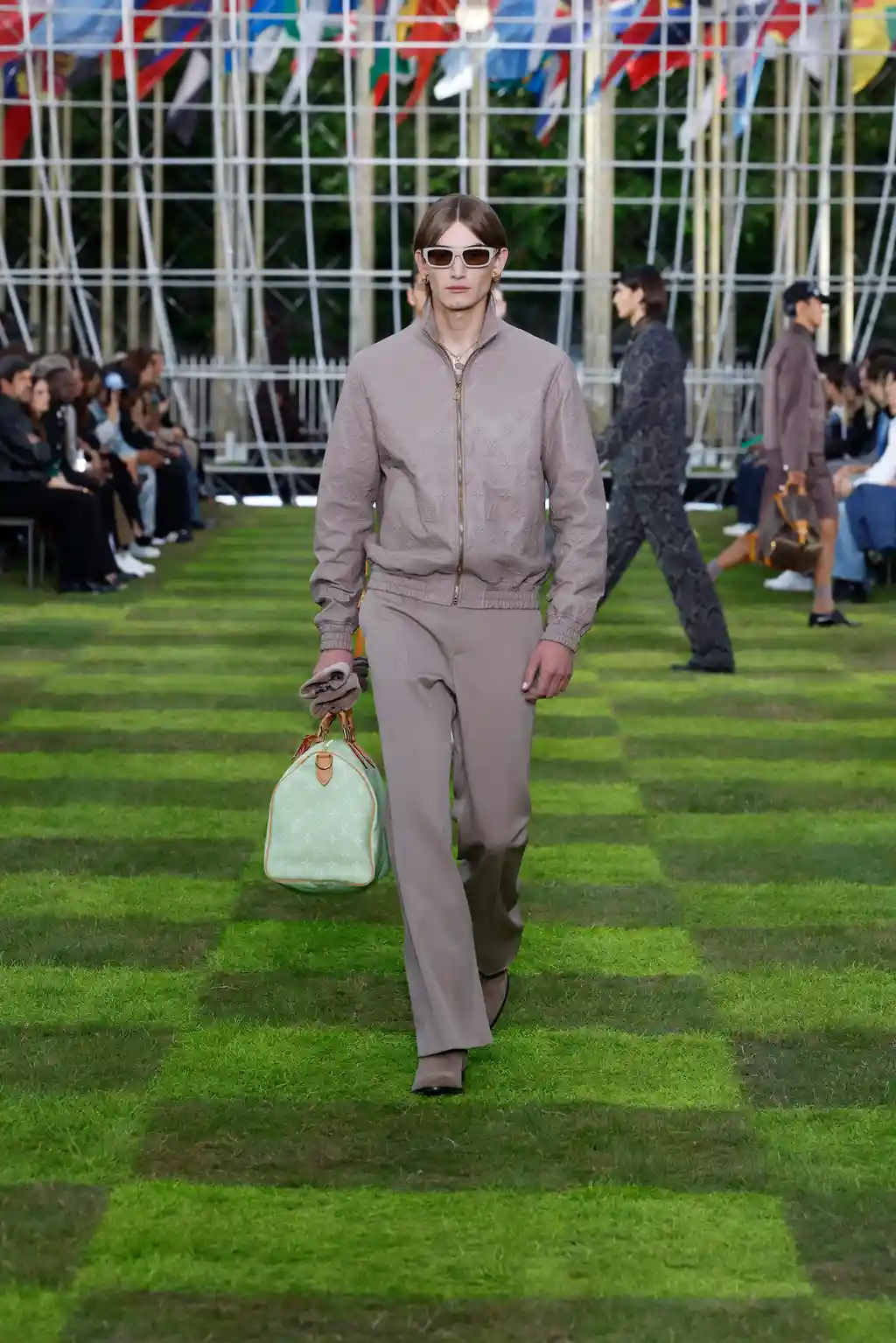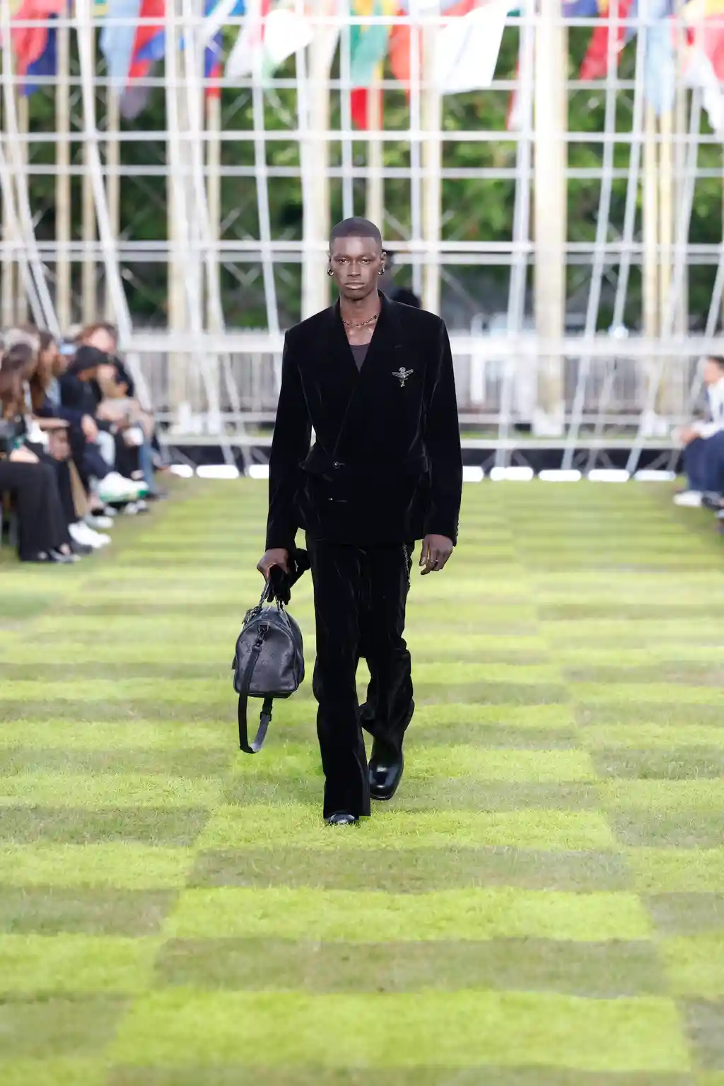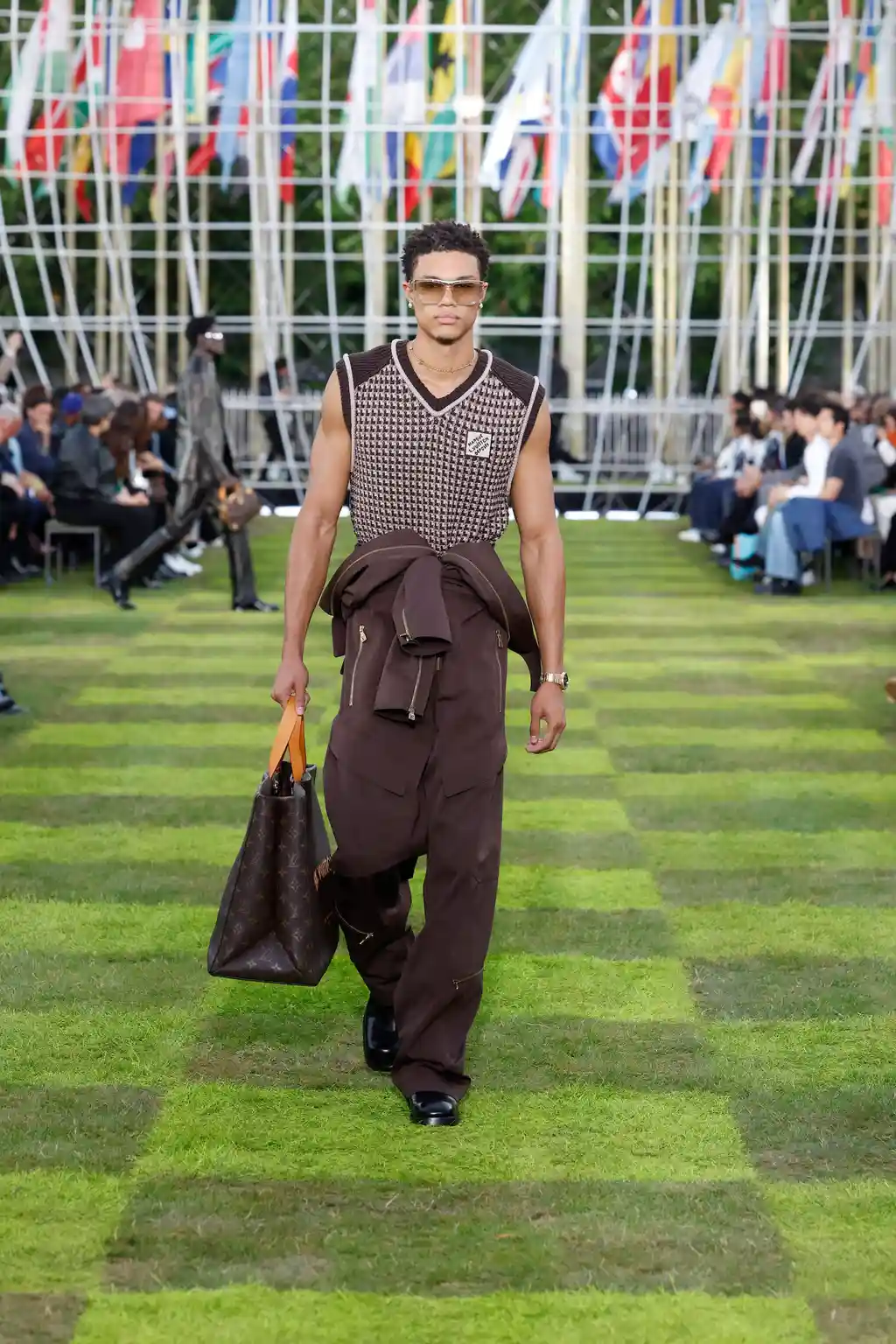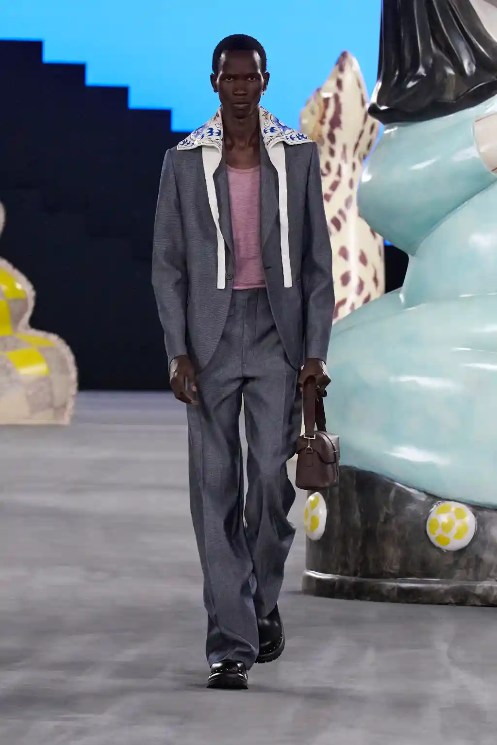 Escapism was at the heart of Pharrell’s moodboard this season. Transfixed by the idea of globe-trotters, he set about crafting a collection that transported the audience to far-flung corners of the world. Via a spectacular production, Williams ruminated on archetypes of travellers reflected by aviator-style bombers, large trunks and neckerchiefs tied around models’ necks. Guests invites came via engraved Louis Vuitton Apple AirTags – a must-have for any sightseer. Transparent, cherry red garments with LV monogramming slapped across trunks, raincoats, briefcases and hoods, piqued the interest of attendees. As the collection continued, Pharrell only amped up the glamour.