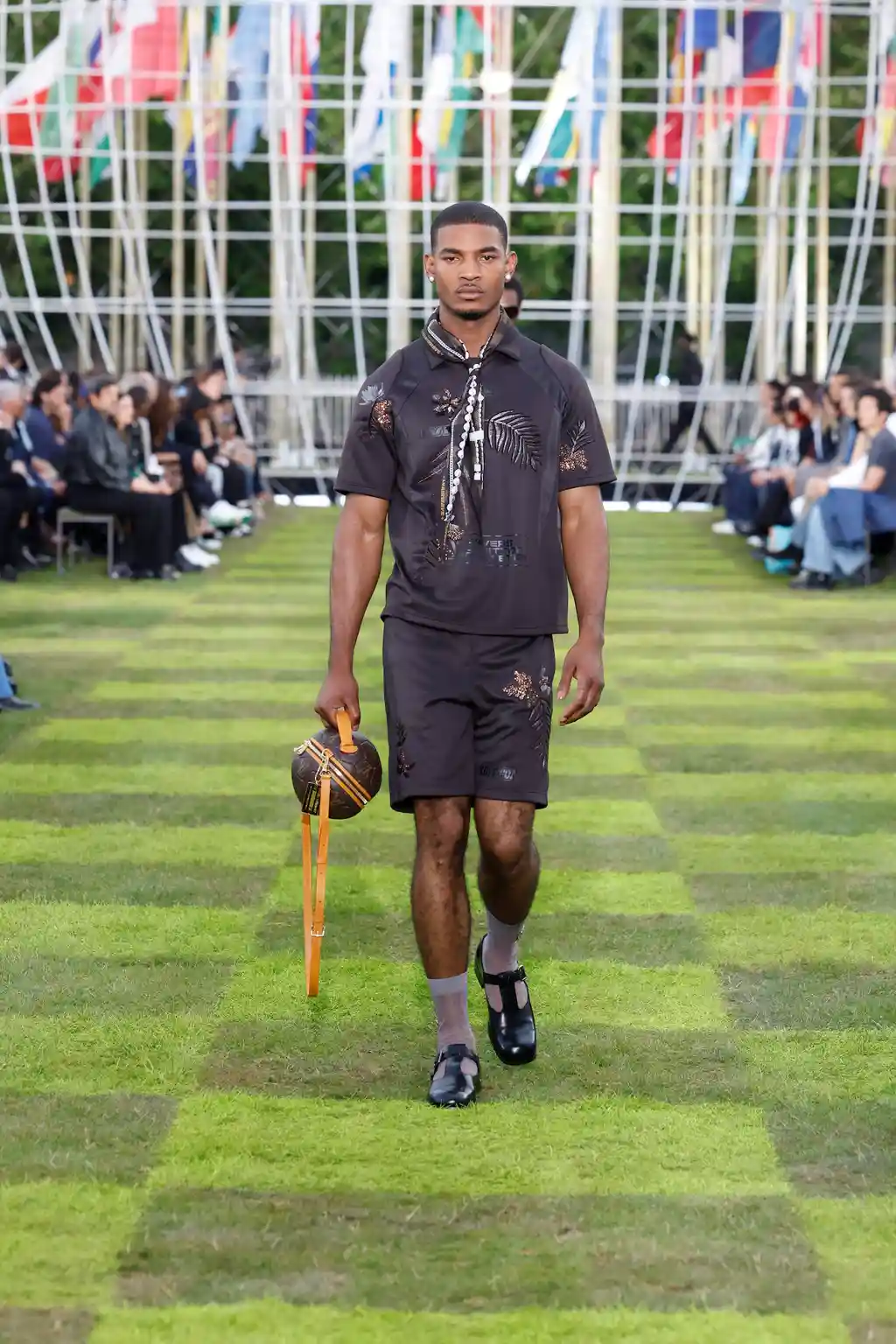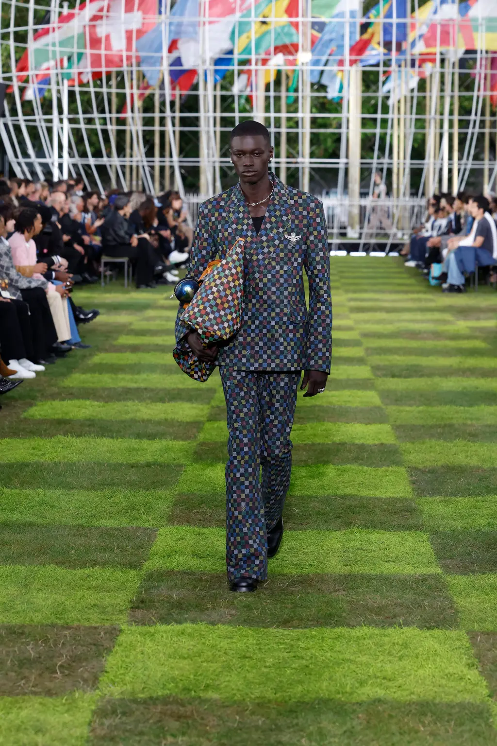 Long-line fur coats adorned with crystals added a clever twist to the collection, and as previous seasons have shown, Pharrell has a knack for creating a supreme bomber: this time, it came in a globe print and an opulent football model (no doubt a symbol of the Olympics, due to start in Paris next month). Logo-fied tailoring also featured, alongside monogrammed tracksuit sets and double-breasted coats. Also apparent throughout the collection were pieces engraved with the phrases “LVers United” and “Le monde est à vous”, which translates to “the world is yours”. Pharrell proved, on day one of Paris men’s shows, that it certainly is his world.