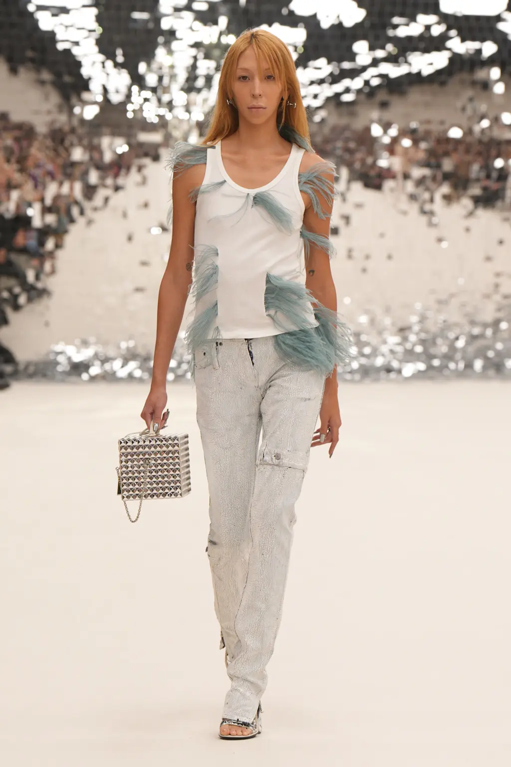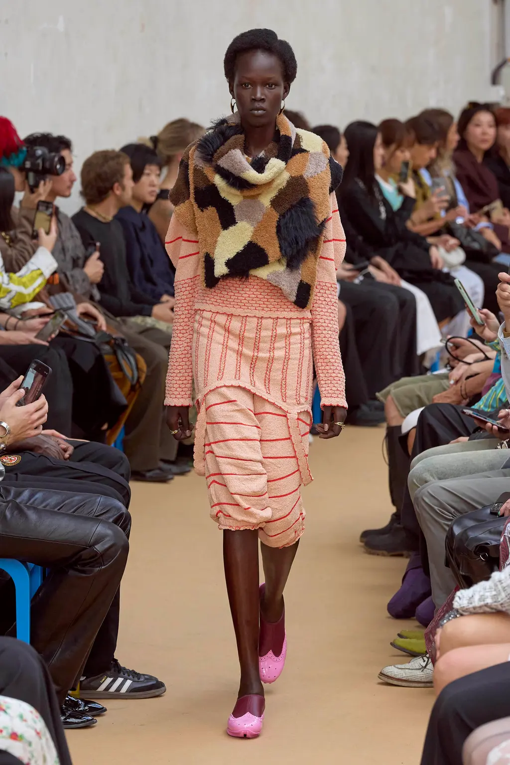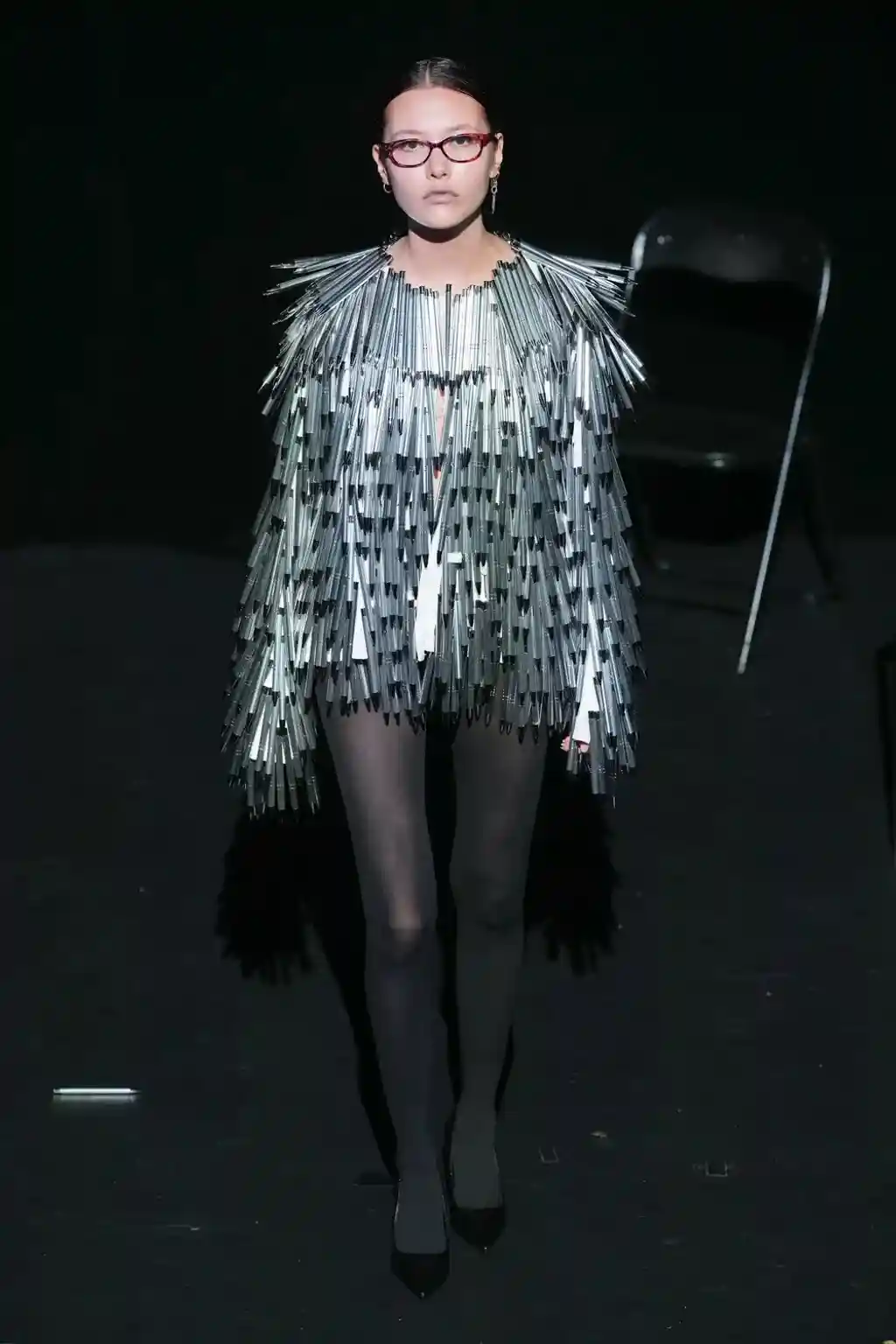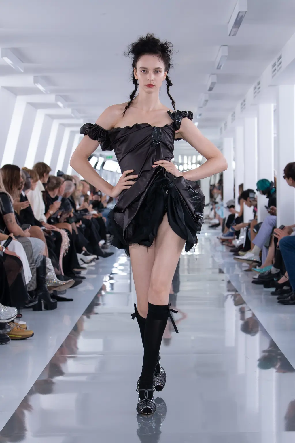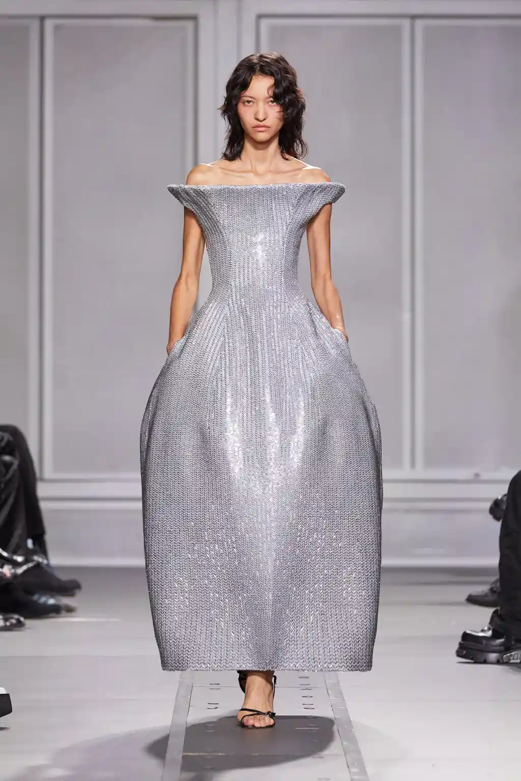 Elsewhere, billowing cotton skirts in structured checks stuck out like tutus, while ribbed sweaters paired with suede maxi skirts highlighted the outlines of the body. Rattling dresses made from discarded tin cans were balanced out with miniscule sheer strappy dresses and cropped mohair sweaters that provided a softer moment – a skilled equilibrium between fantasy and clothes that people will actually want to wear.