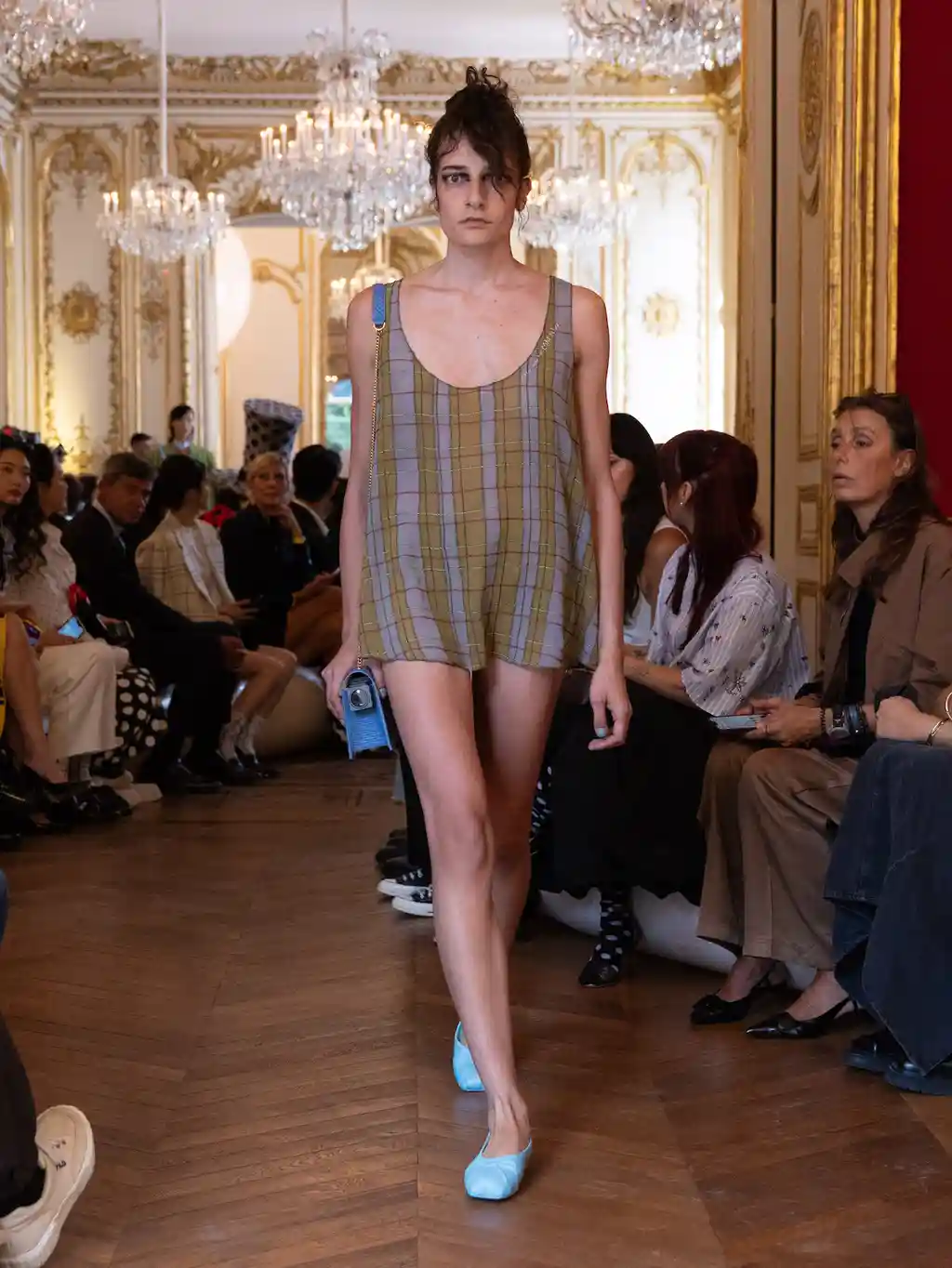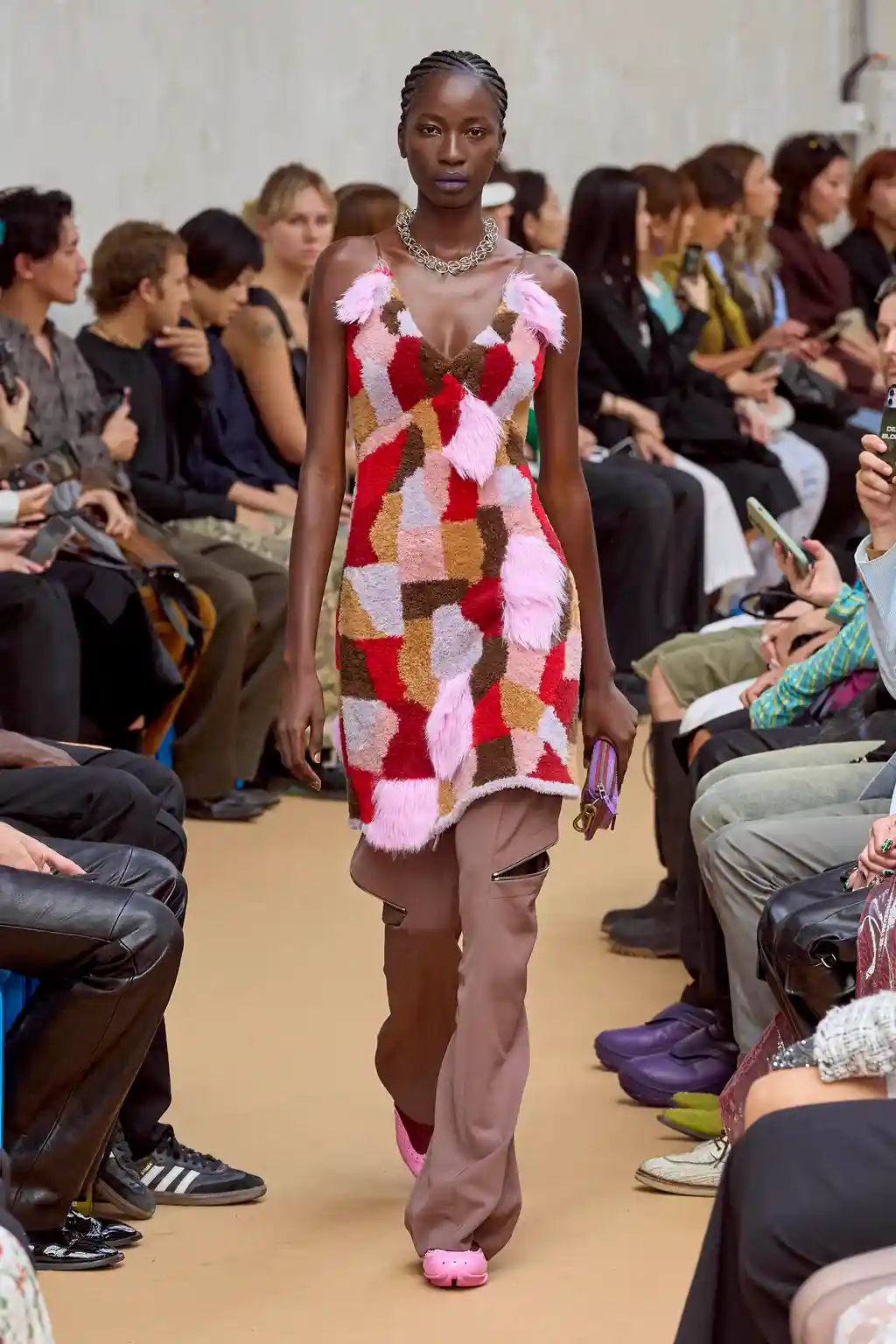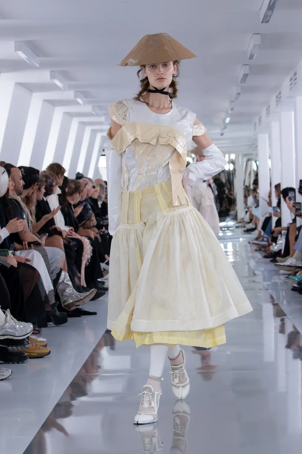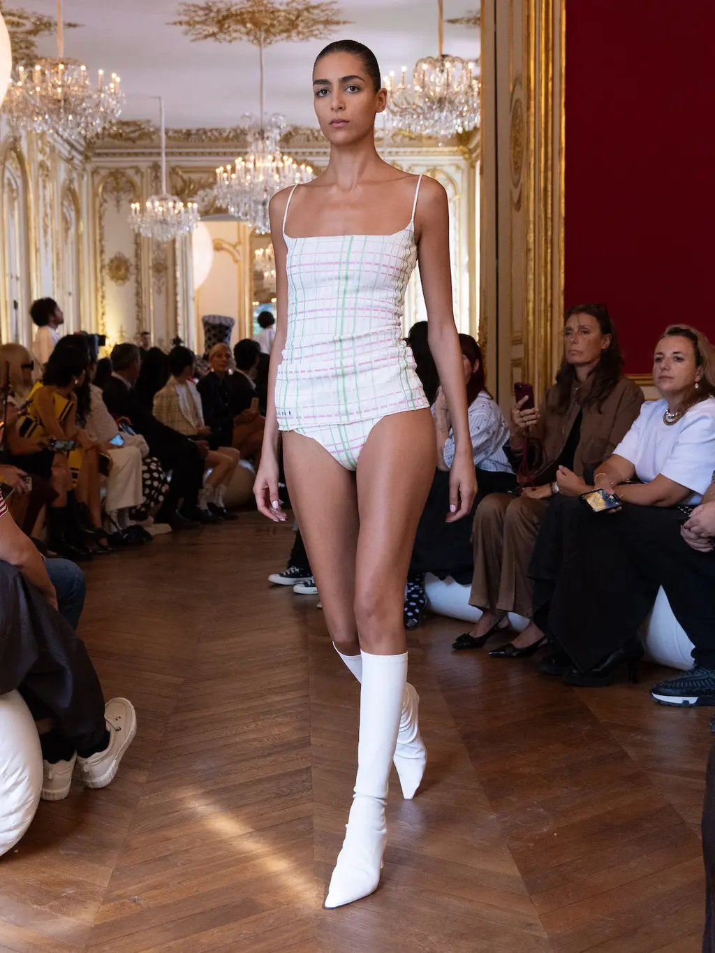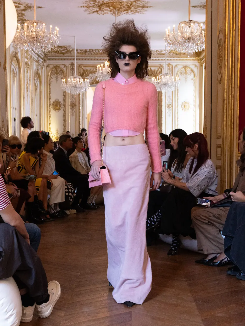 Elsewhere, billowing cotton skirts in structured checks stuck out like tutus, while ribbed sweaters paired with suede maxi skirts highlighted the outlines of the body. Rattling dresses made from discarded tin cans were balanced out with miniscule sheer strappy dresses and cropped mohair sweaters that provided a softer moment – a skilled equilibrium between fantasy and clothes that people will actually want to wear.