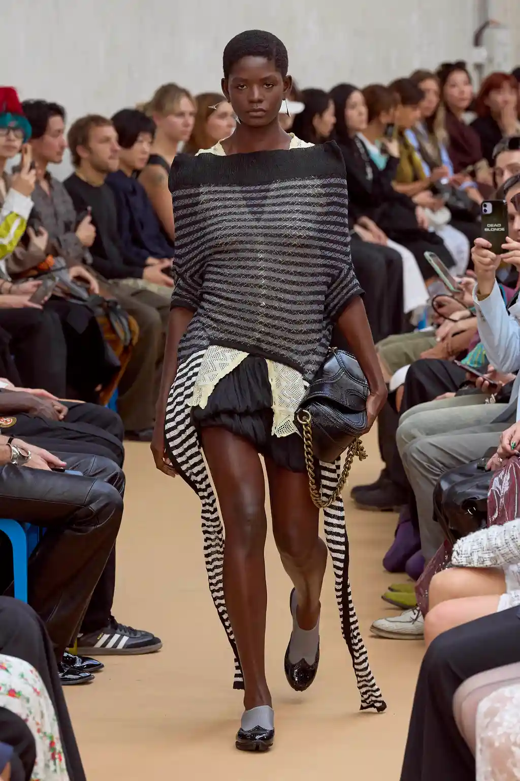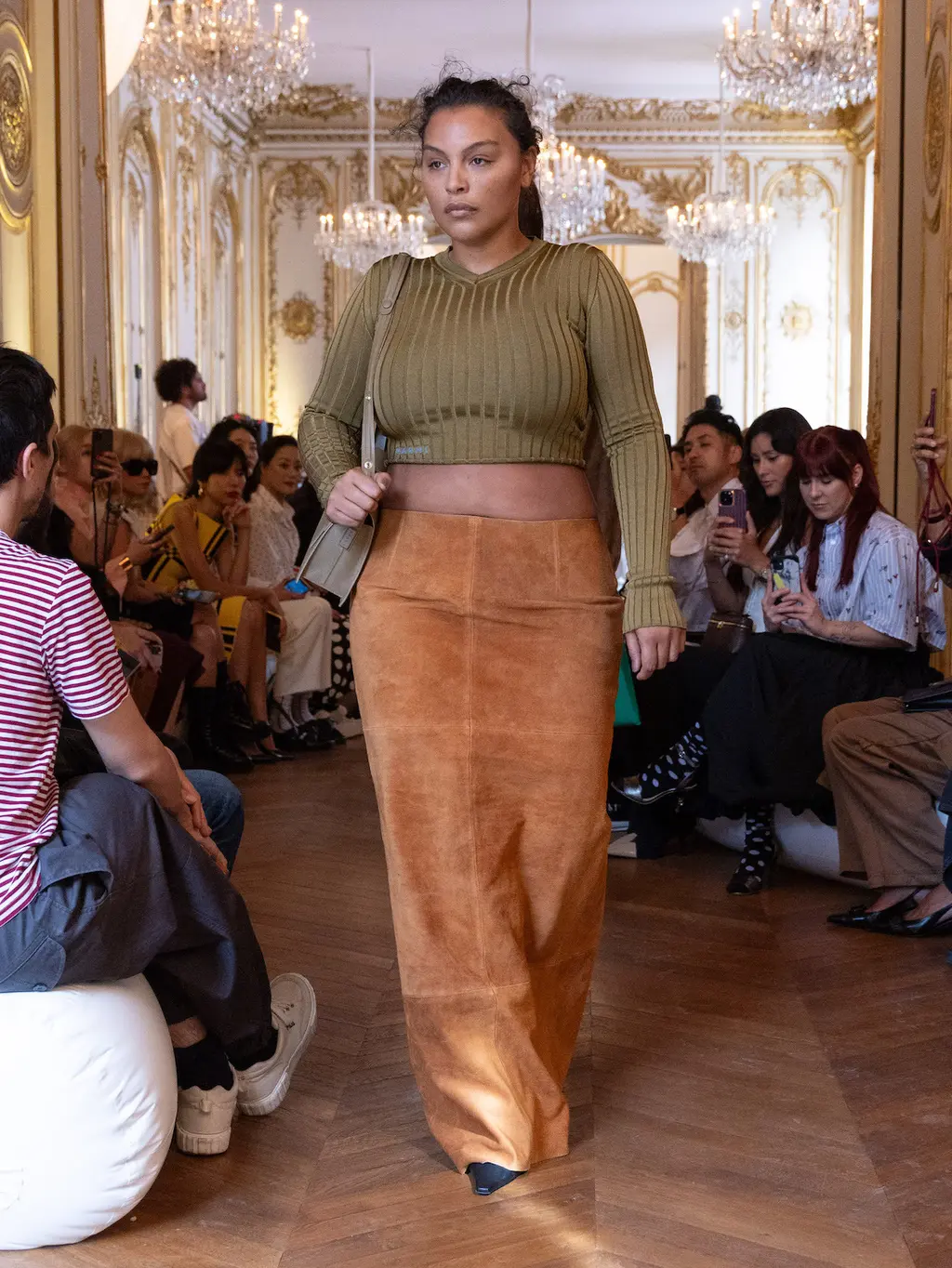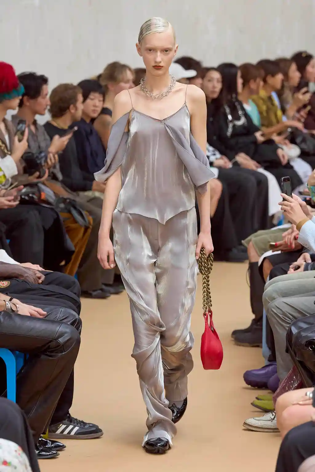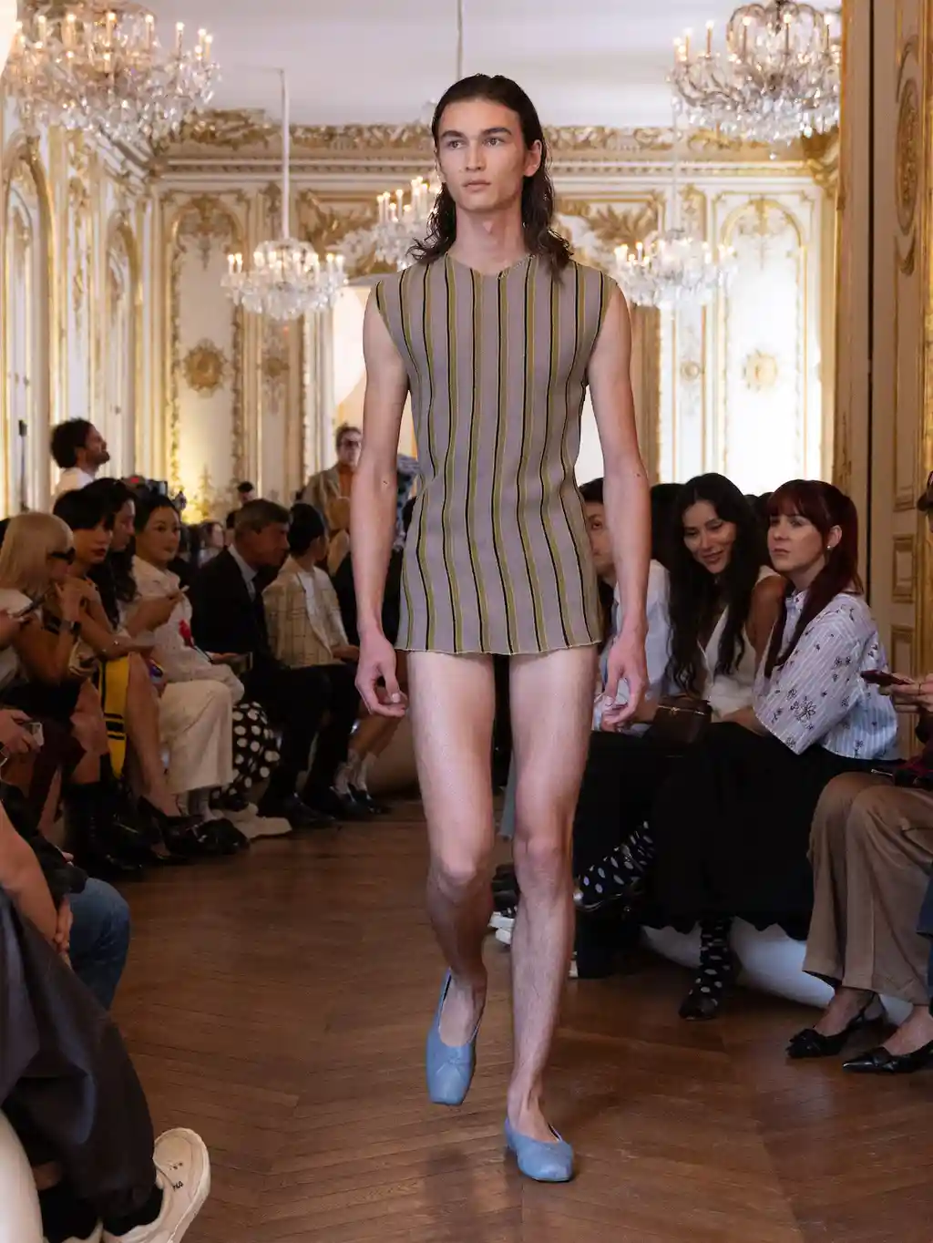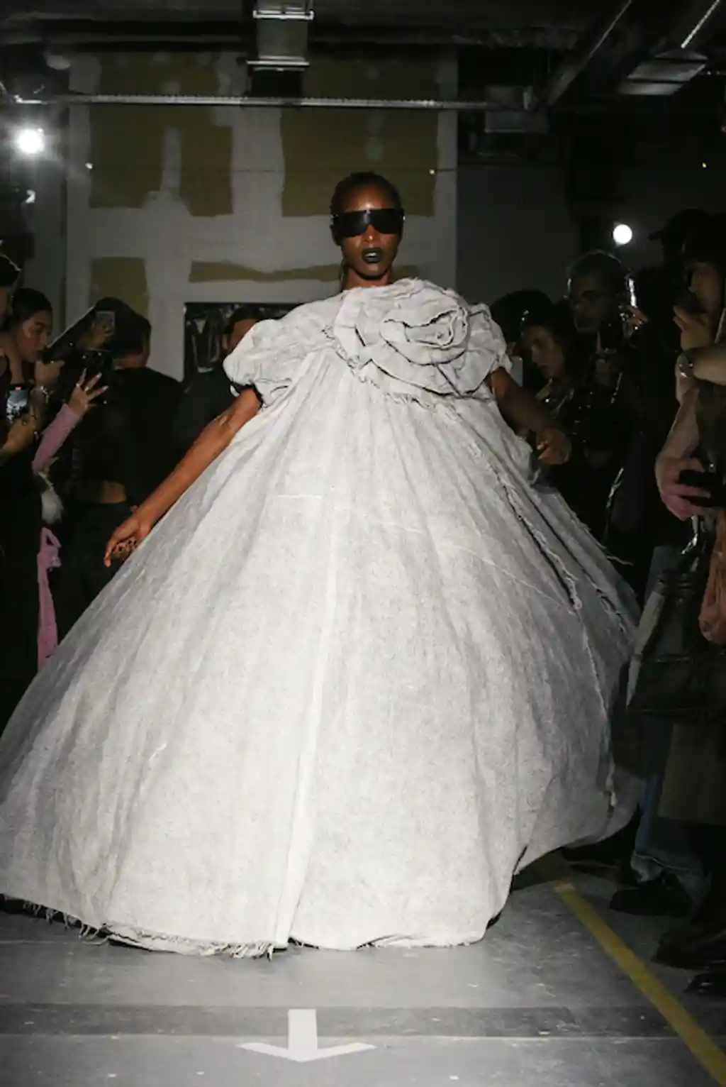 Elsewhere, billowing cotton skirts in structured checks stuck out like tutus, while ribbed sweaters paired with suede maxi skirts highlighted the outlines of the body. Rattling dresses made from discarded tin cans were balanced out with miniscule sheer strappy dresses and cropped mohair sweaters that provided a softer moment – a skilled equilibrium between fantasy and clothes that people will actually want to wear.