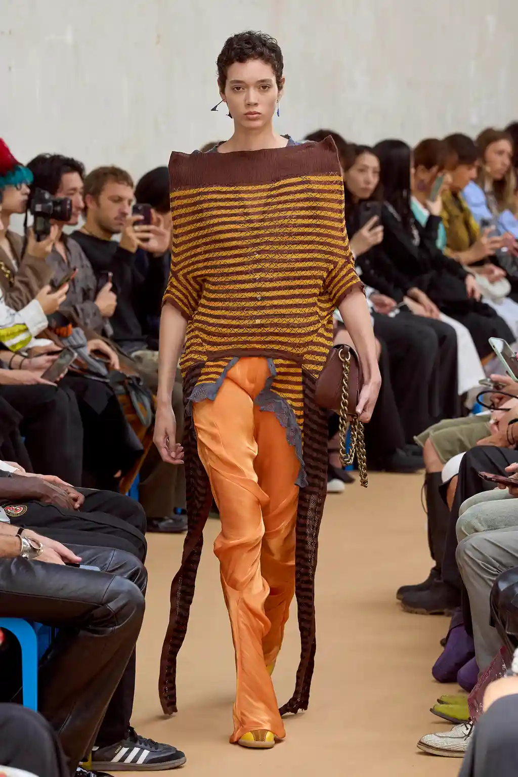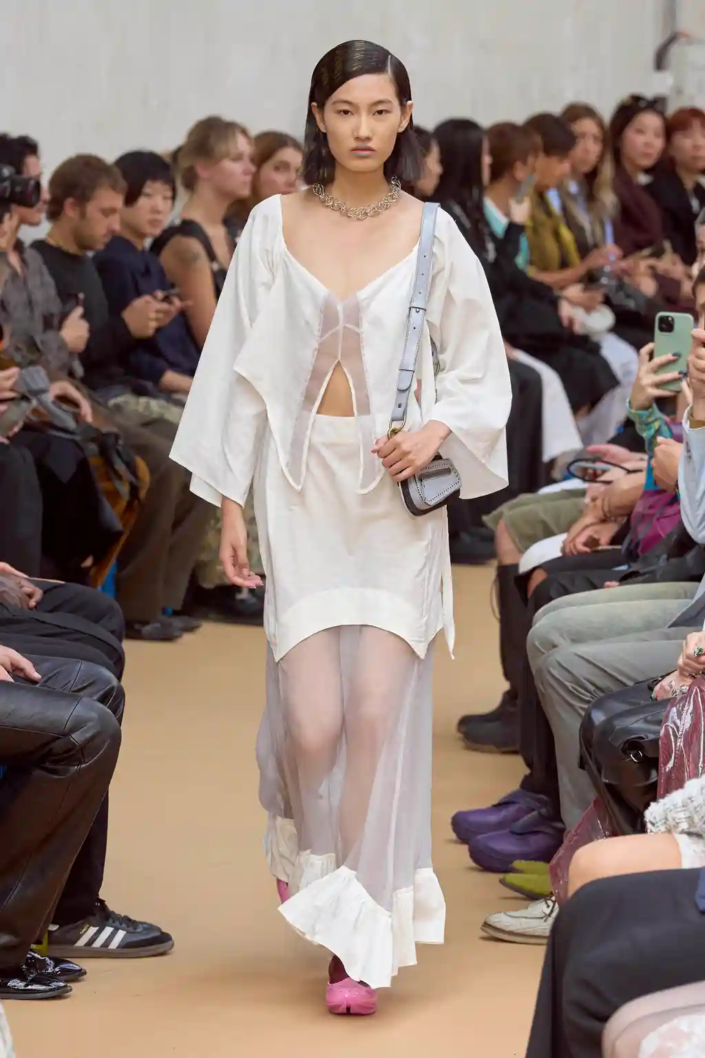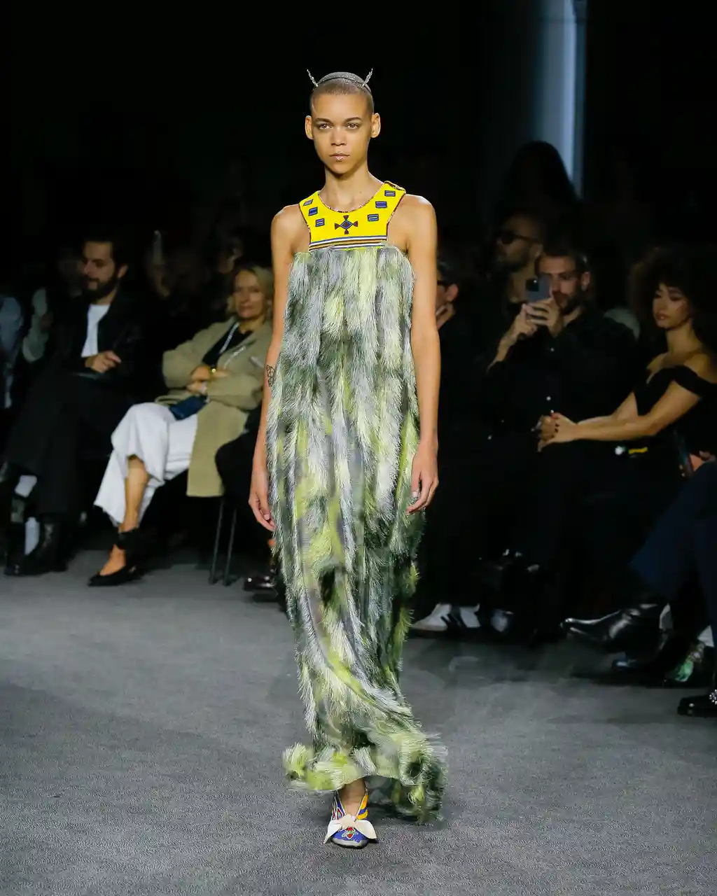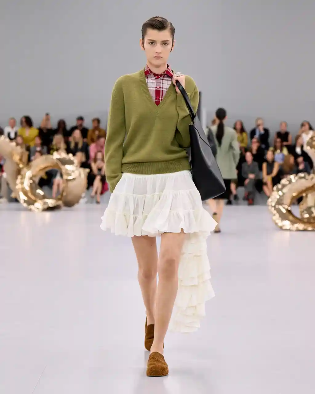 Elsewhere, billowing cotton skirts in structured checks stuck out like tutus, while ribbed sweaters paired with suede maxi skirts highlighted the outlines of the body. Rattling dresses made from discarded tin cans were balanced out with miniscule sheer strappy dresses and cropped mohair sweaters that provided a softer moment – a skilled equilibrium between fantasy and clothes that people will actually want to wear.
