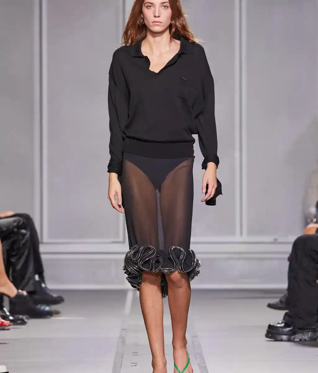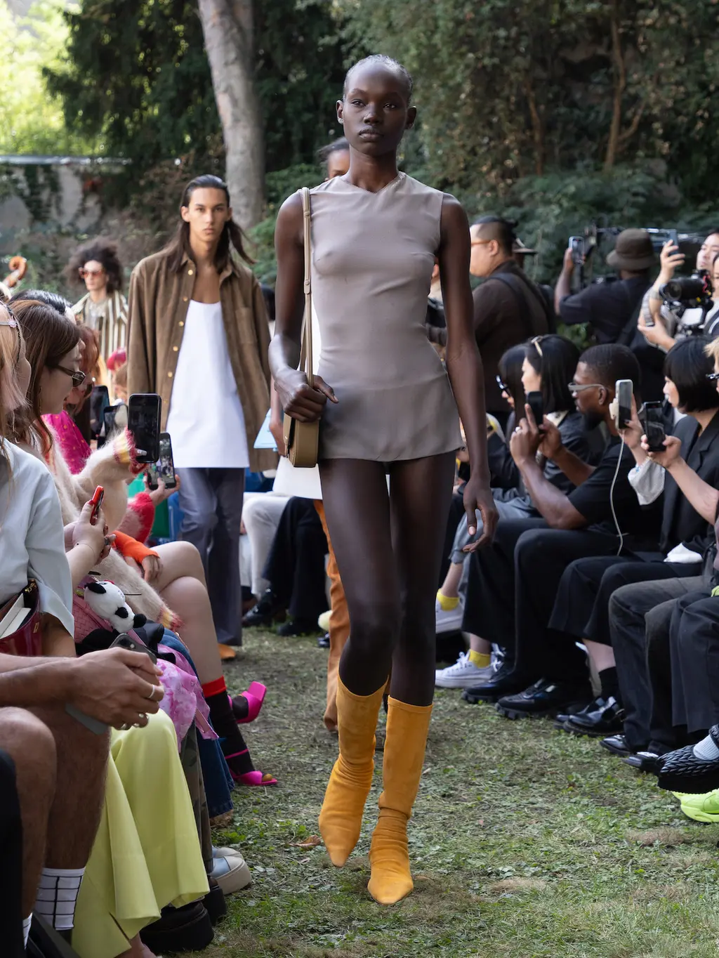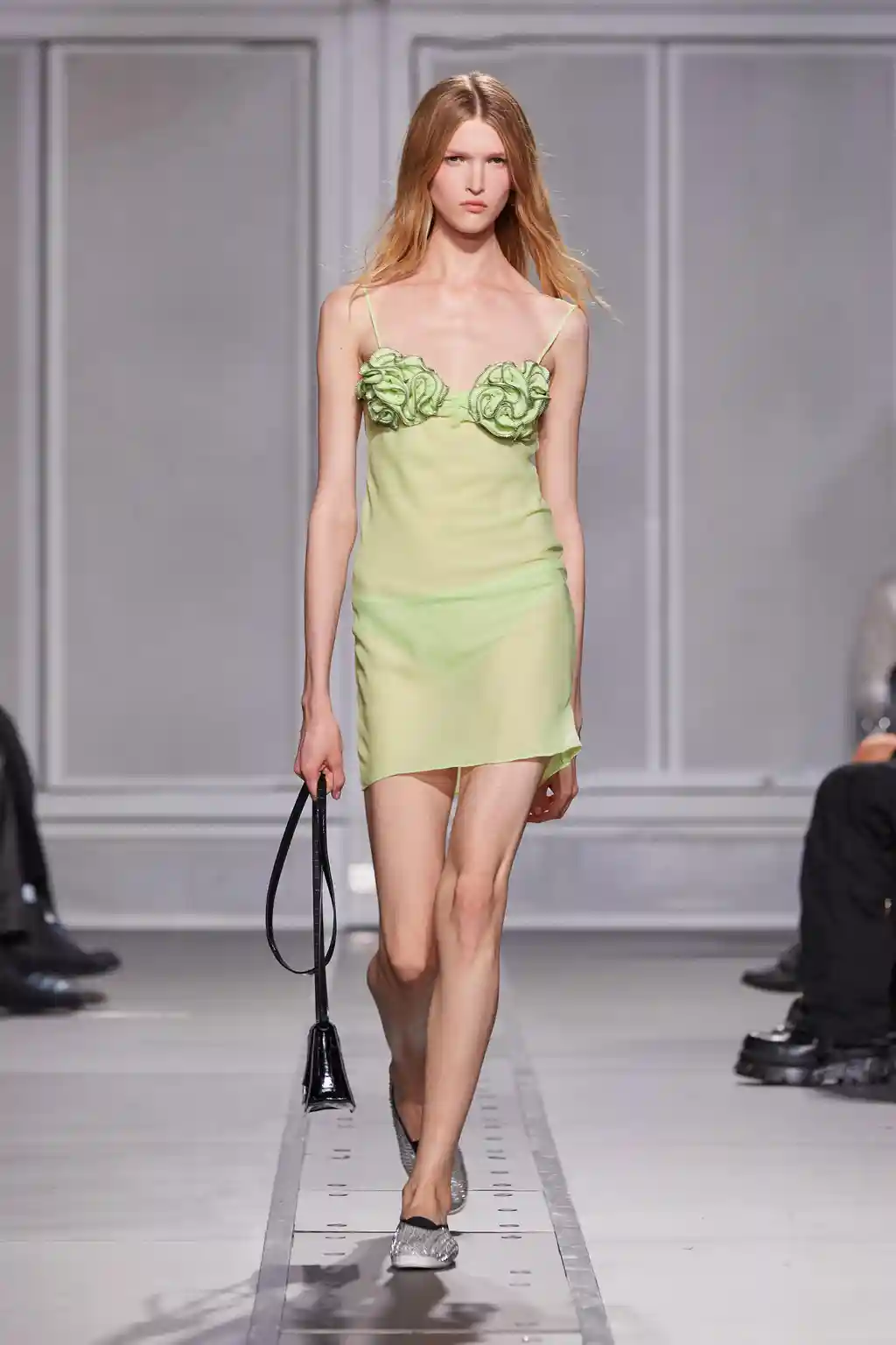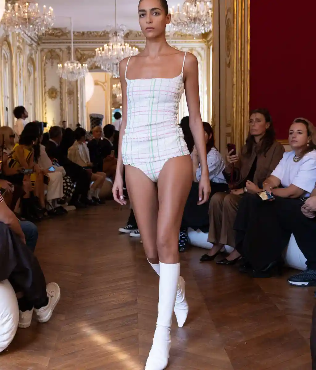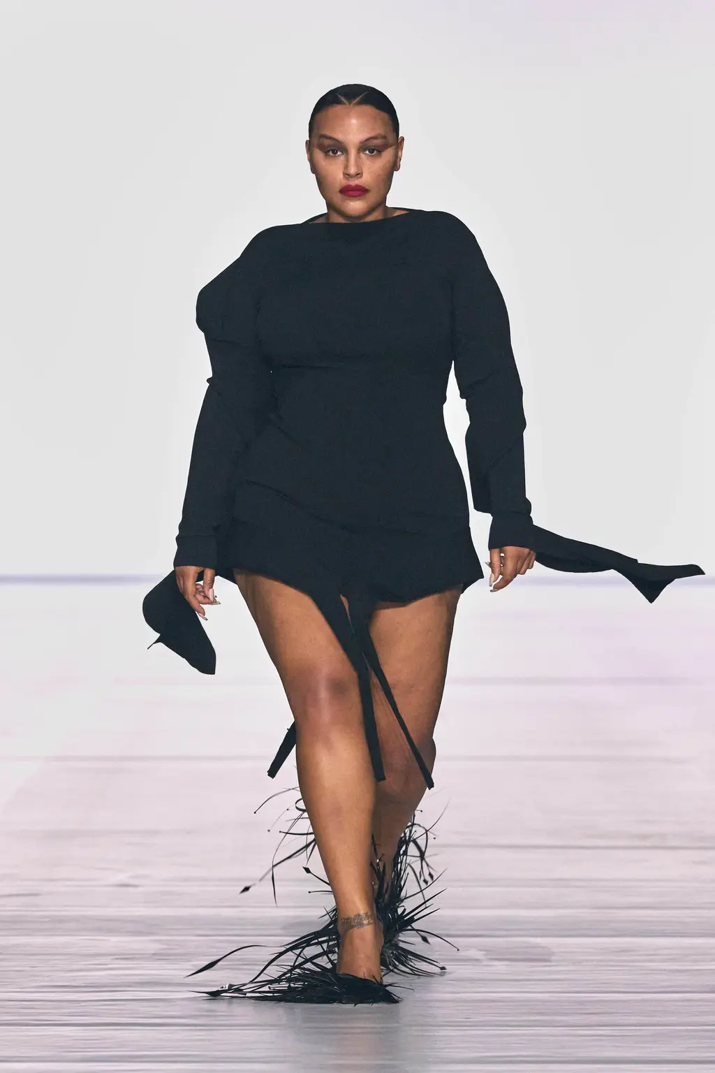 Elsewhere, billowing cotton skirts in structured checks stuck out like tutus, while ribbed sweaters paired with suede maxi skirts highlighted the outlines of the body. Rattling dresses made from discarded tin cans were balanced out with miniscule sheer strappy dresses and cropped mohair sweaters that provided a softer moment – a skilled equilibrium between fantasy and clothes that people will actually want to wear.