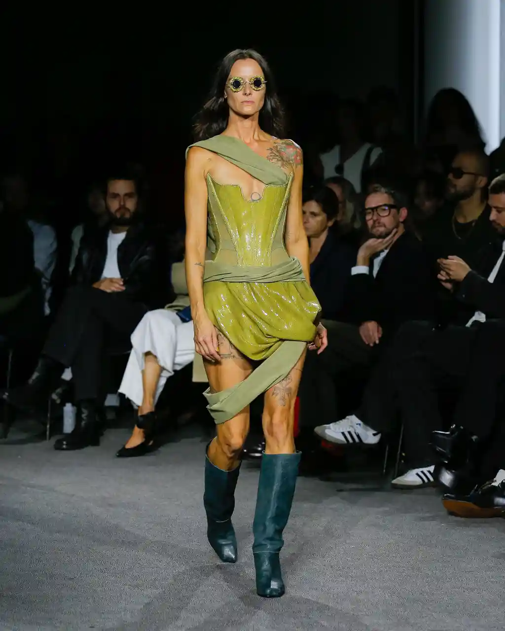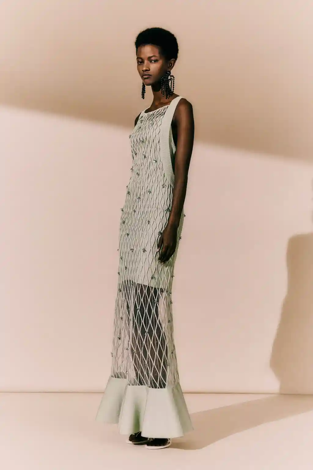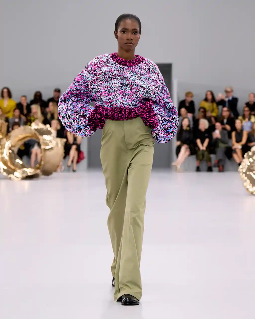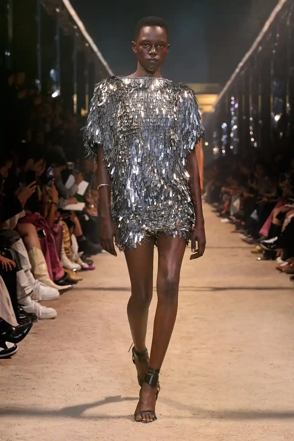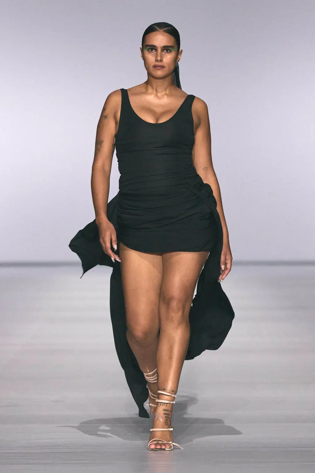 Elsewhere, billowing cotton skirts in structured checks stuck out like tutus, while ribbed sweaters paired with suede maxi skirts highlighted the outlines of the body. Rattling dresses made from discarded tin cans were balanced out with miniscule sheer strappy dresses and cropped mohair sweaters that provided a softer moment – a skilled equilibrium between fantasy and clothes that people will actually want to wear.