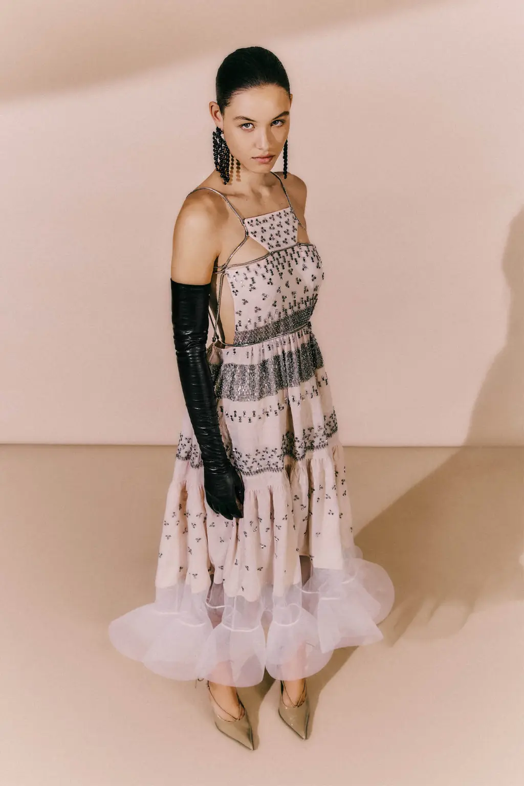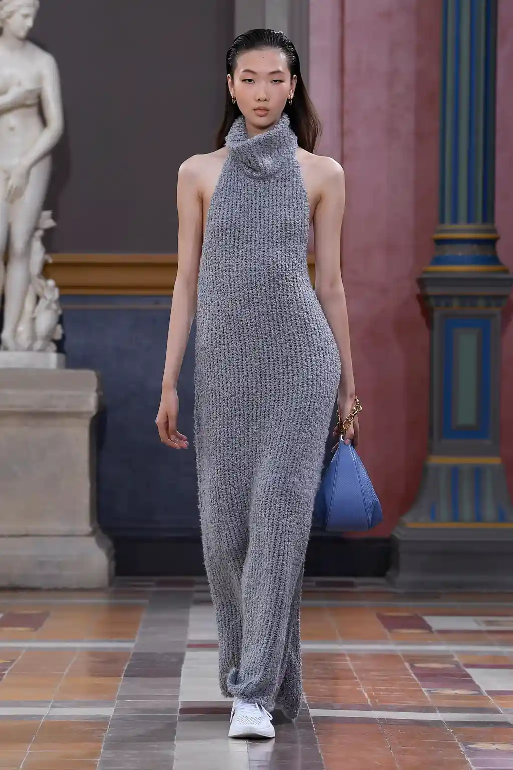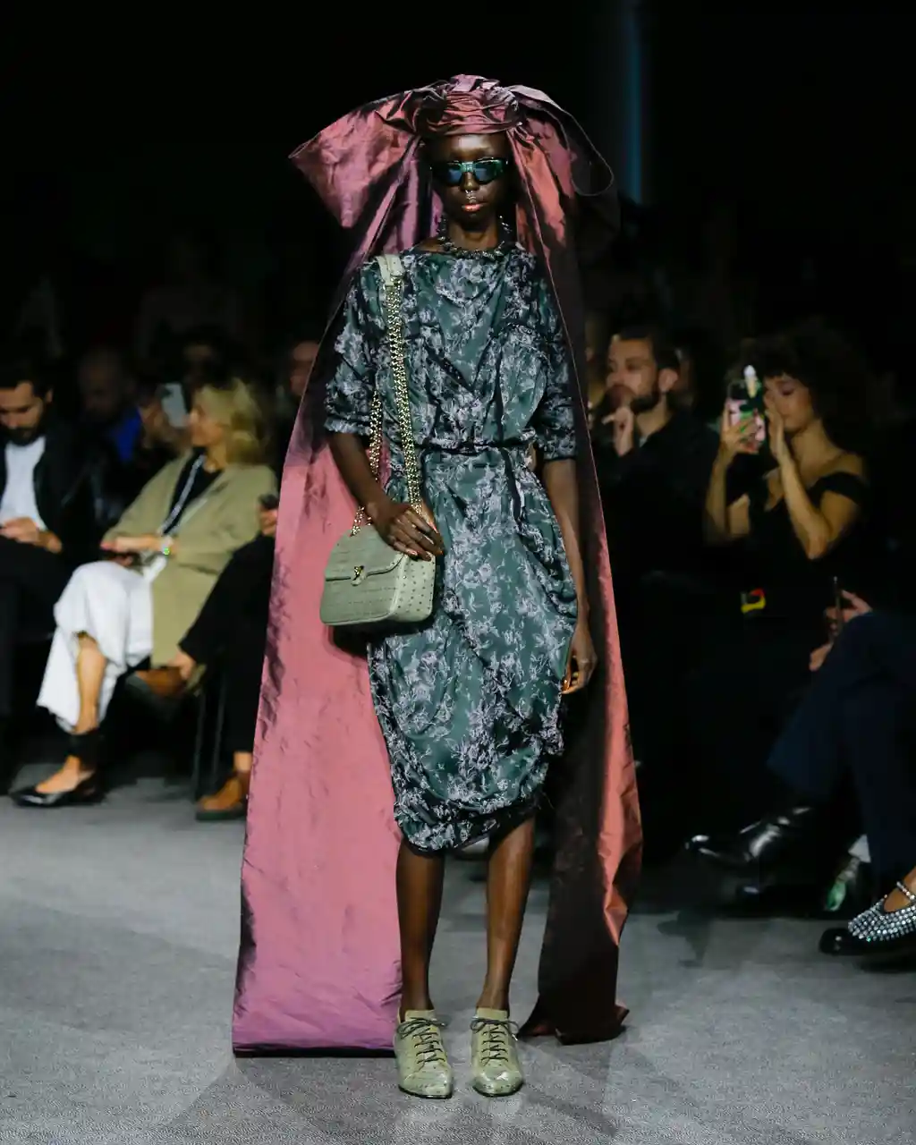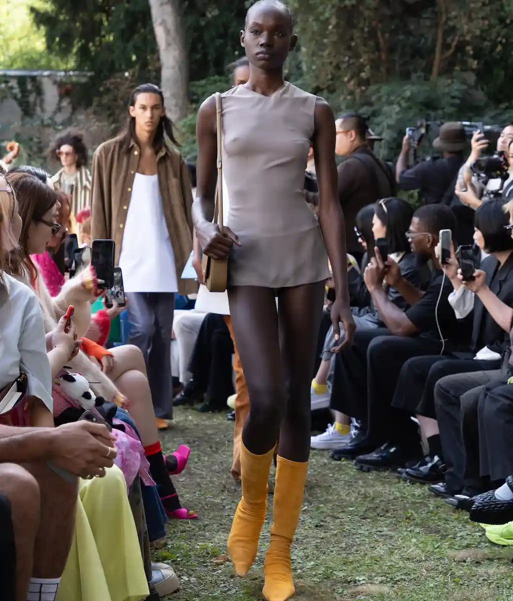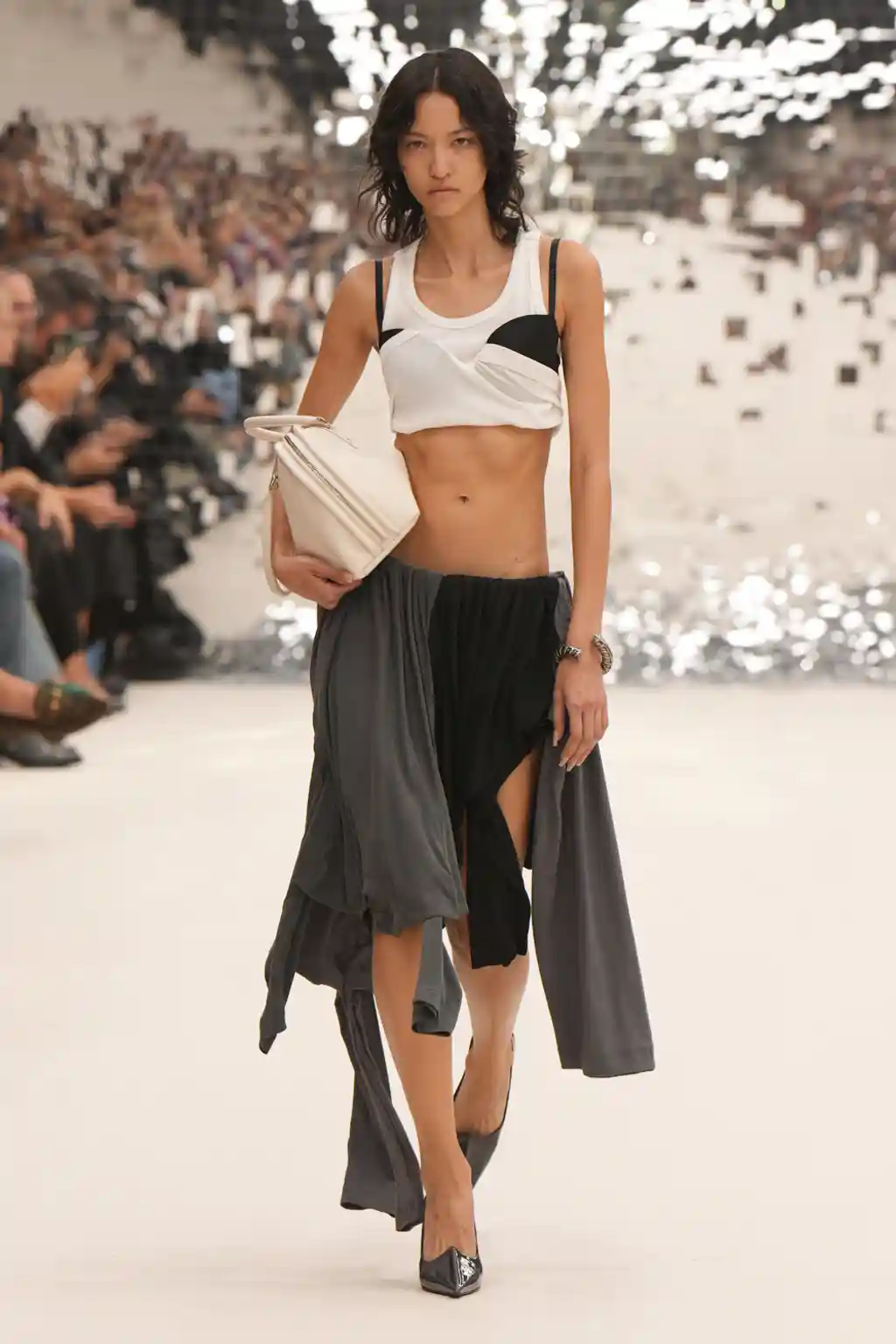Elsewhere, billowing cotton skirts in structured checks stuck out like tutus, while ribbed sweaters paired with suede maxi skirts highlighted the outlines of the body. Rattling dresses made from discarded tin cans were balanced out with miniscule sheer strappy dresses and cropped mohair sweaters that provided a softer moment – a skilled equilibrium between fantasy and clothes that people will actually want to wear.