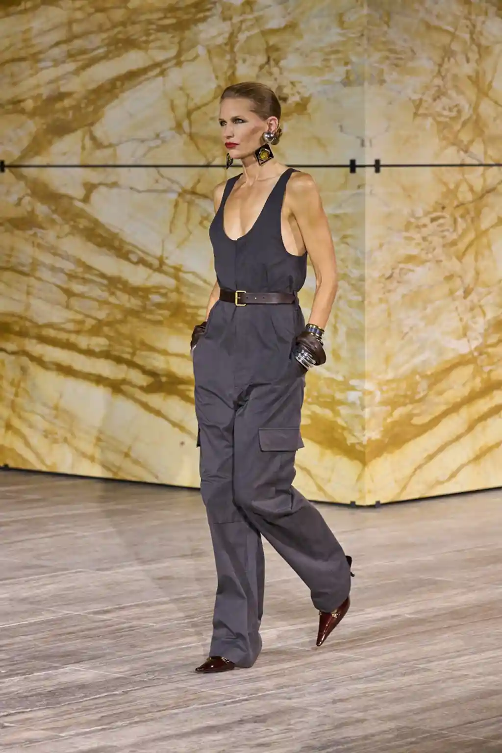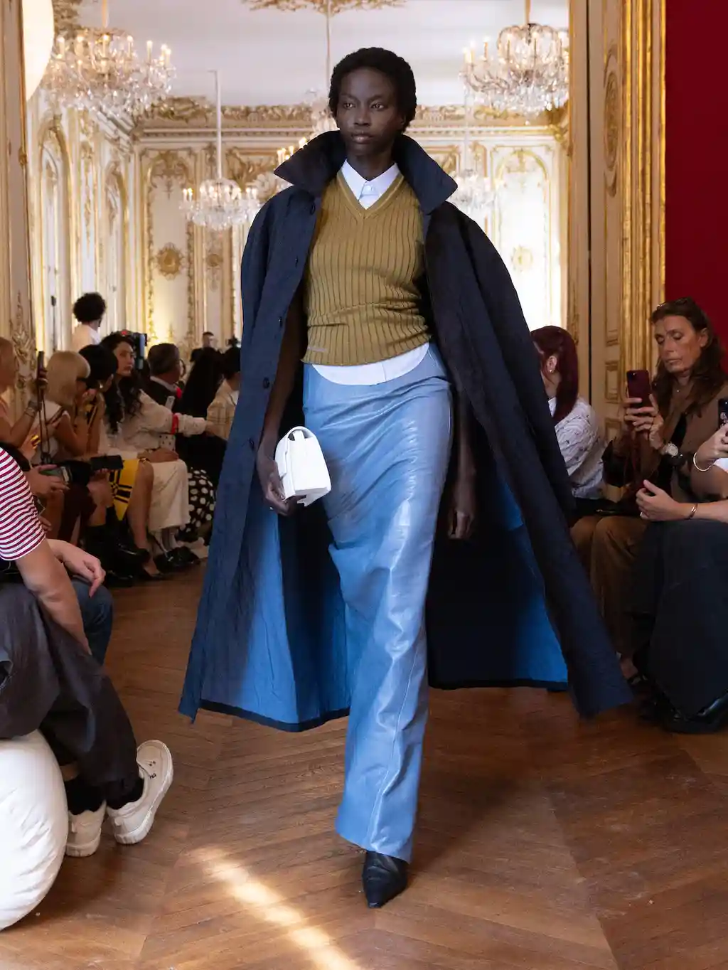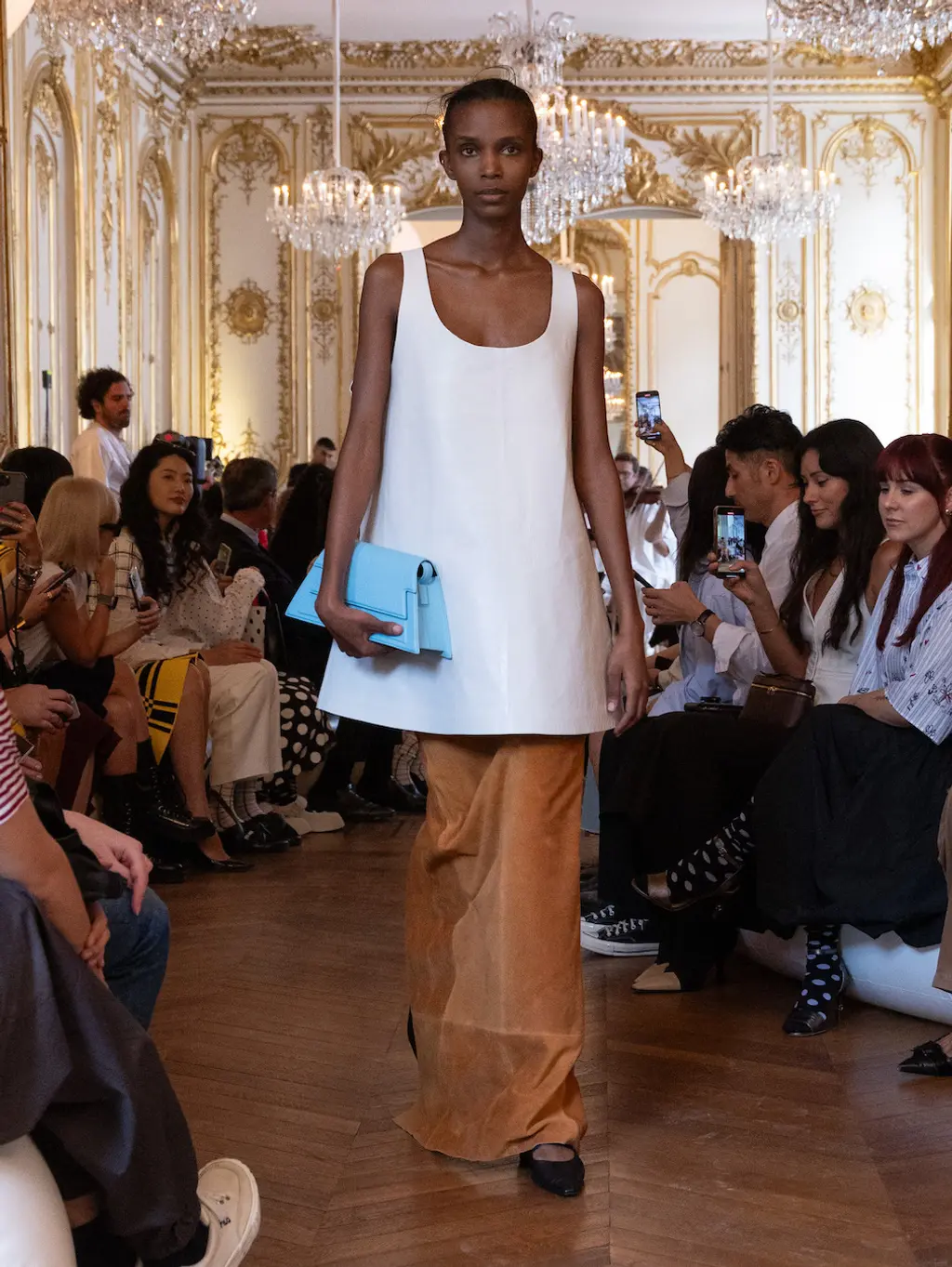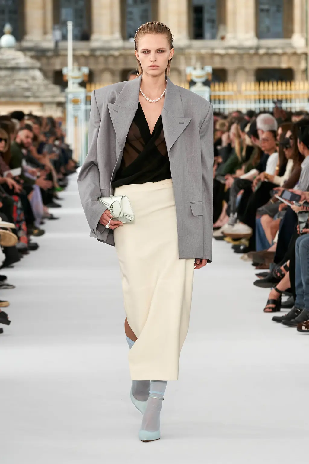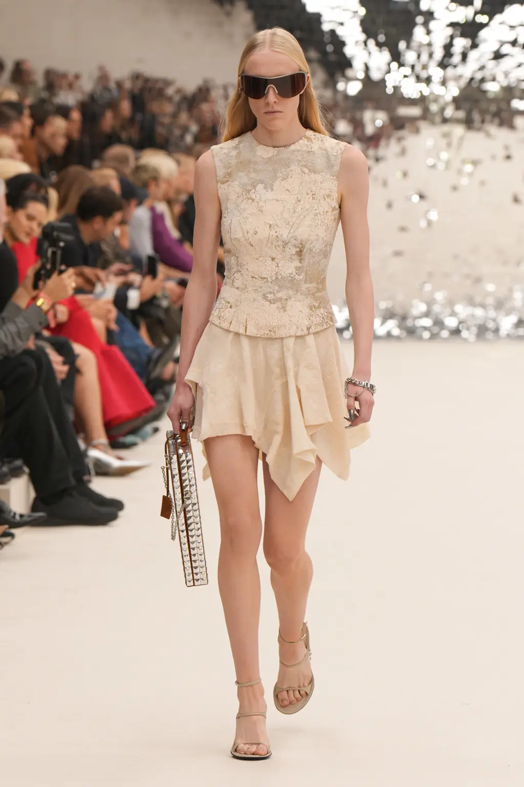 When Amelia Eartheart made her groundbreaking solo flight across the Atlantic, she planned to touch down in Paris, but mechanical difficulties led her to land in Derry, Ireland instead. Just the other night, however, Anthony Vacerello planted her right in front of the Eiffel Tower – or at least the likeness he created – dressing models in aviator shades, leather gloves and flight-ready jumpsuits. Everything, except the mousseline evening wear, was rendered in cotton. It was Vacerello’s blank canvas, a dramatic change of course from last season’s high adrenaline power suits. Like several brands this season, Vacarello dialled it right back. Call it a response to quiet luxury or a natural pendulum swing away from chasing virality, but ostentation is out. With that said, models wore giant gold earrings and sculptural heels along with their cargo skirts and workwear shirts, so the collection was far from being devoid of glamour.