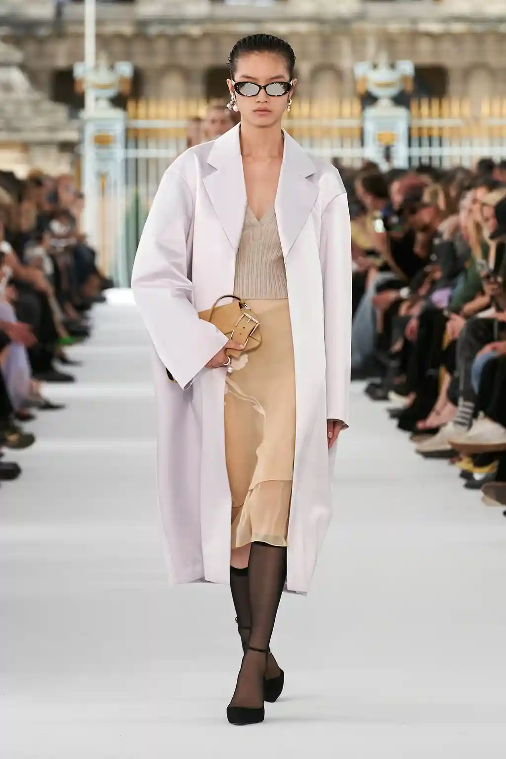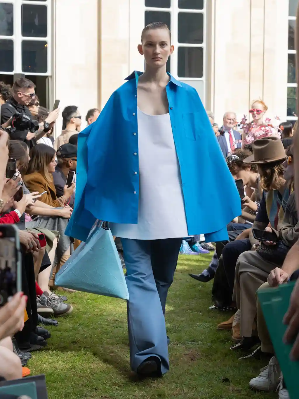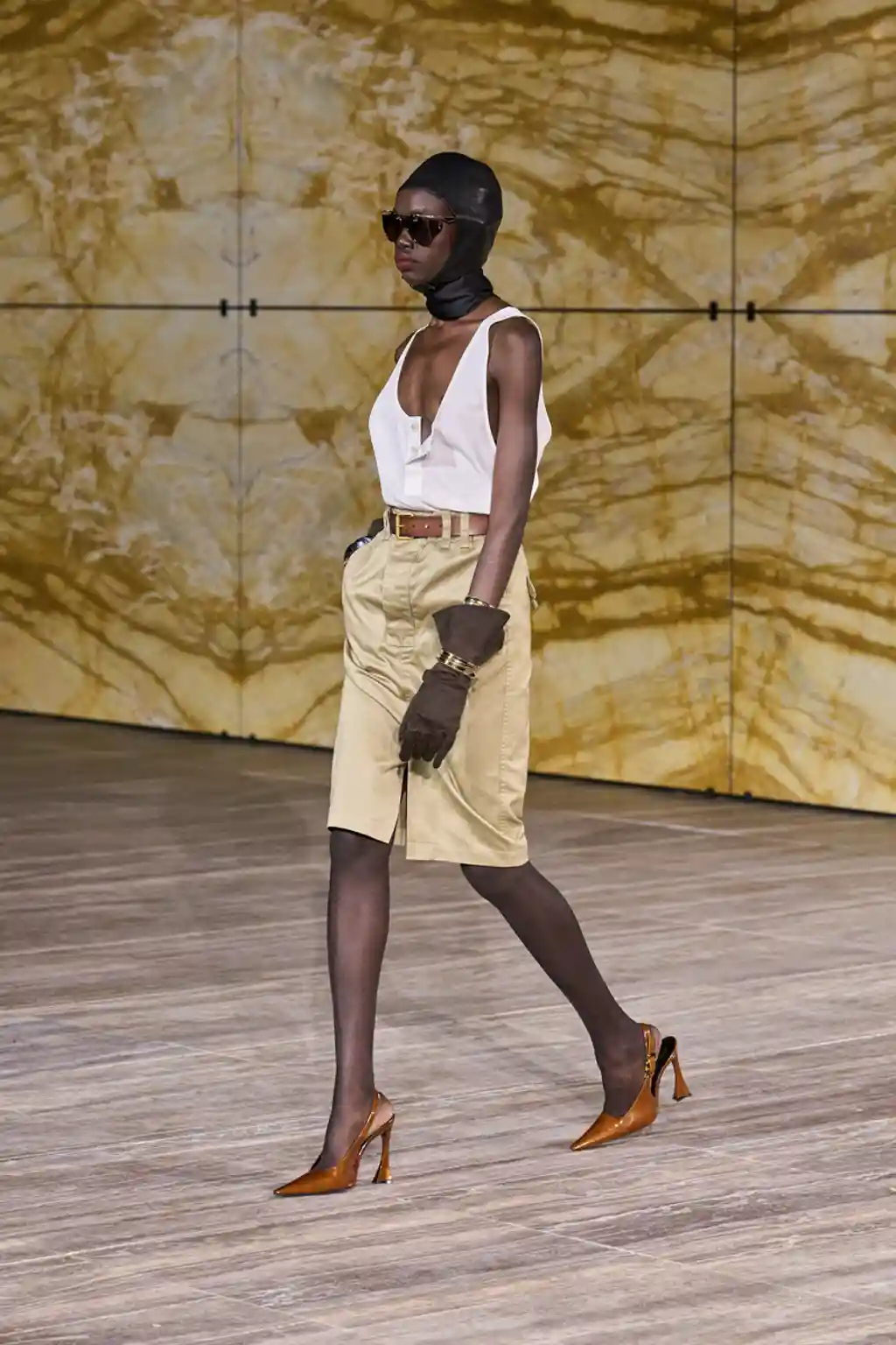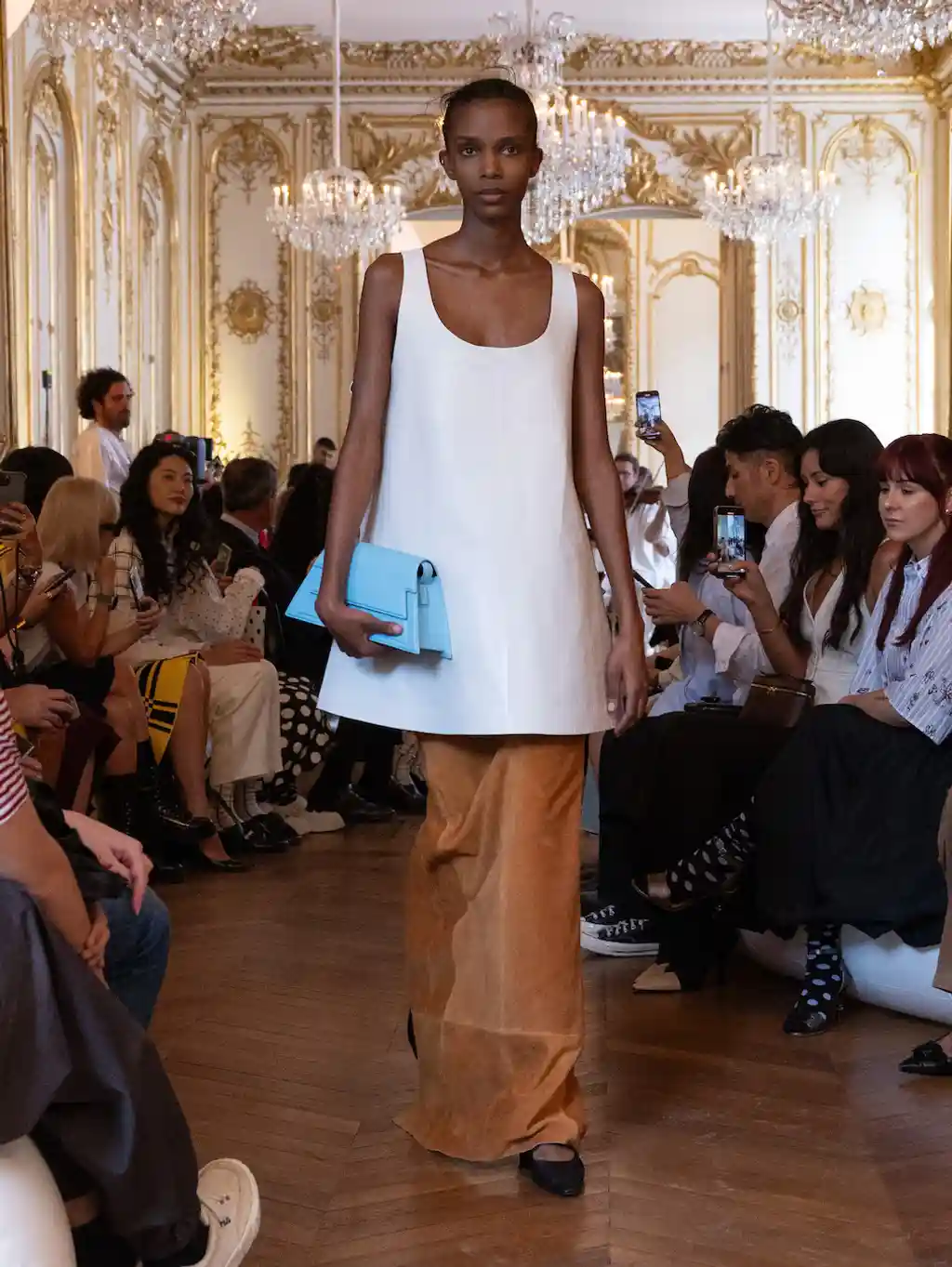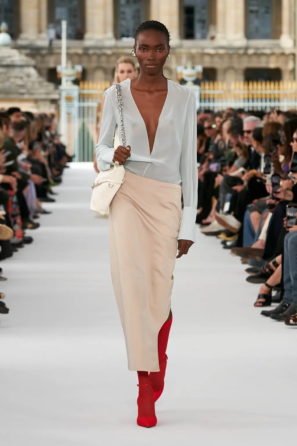When Amelia Eartheart made her groundbreaking solo flight across the Atlantic, she planned to touch down in Paris, but mechanical difficulties led her to land in Derry, Ireland instead. Just the other night, however, Anthony Vacerello planted her right in front of the Eiffel Tower – or at least the likeness he created – dressing models in aviator shades, leather gloves and flight-ready jumpsuits. Everything, except the mousseline evening wear, was rendered in cotton. It was Vacerello’s blank canvas, a dramatic change of course from last season’s high adrenaline power suits. Like several brands this season, Vacarello dialled it right back. Call it a response to quiet luxury or a natural pendulum swing away from chasing virality, but ostentation is out. With that said, models wore giant gold earrings and sculptural heels along with their cargo skirts and workwear shirts, so the collection was far from being devoid of glamour.