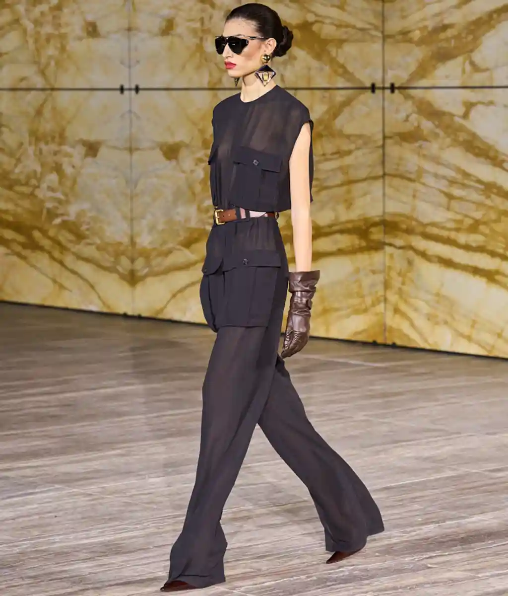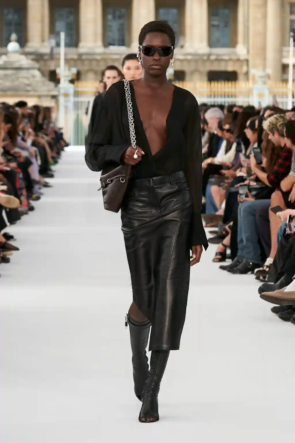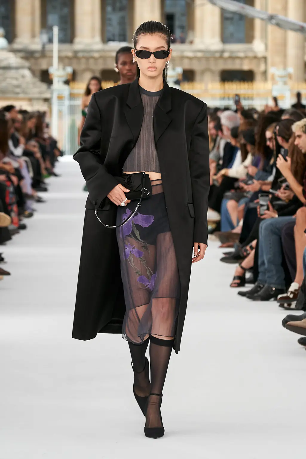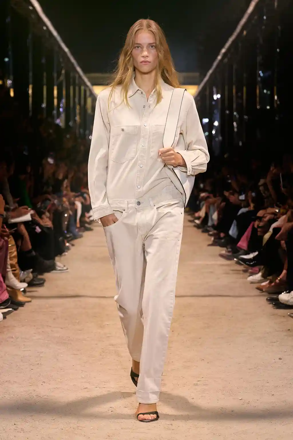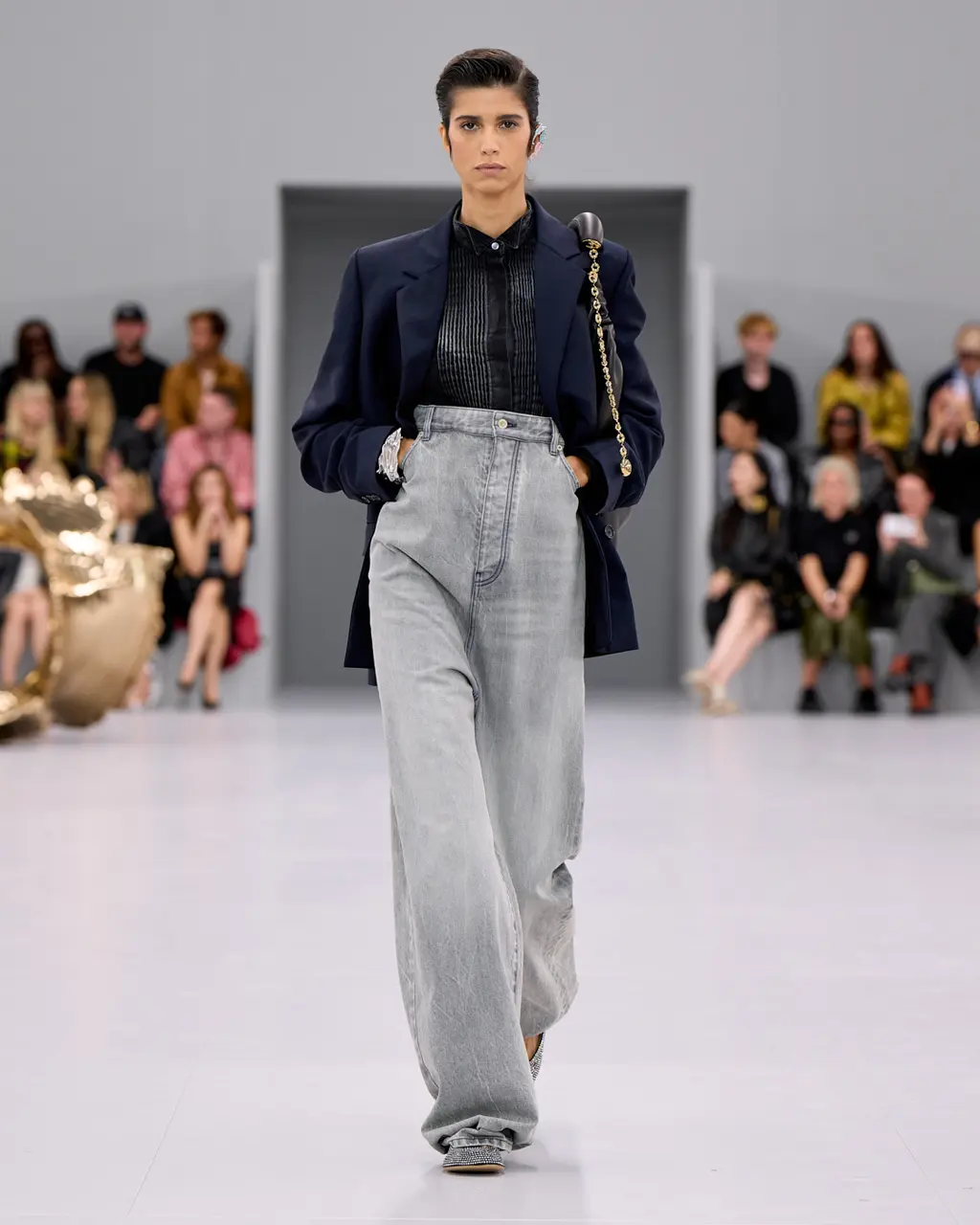 When Amelia Eartheart made her groundbreaking solo flight across the Atlantic, she planned to touch down in Paris, but mechanical difficulties led her to land in Derry, Ireland instead. Just the other night, however, Anthony Vacerello planted her right in front of the Eiffel Tower – or at least the likeness he created – dressing models in aviator shades, leather gloves and flight-ready jumpsuits. Everything, except the mousseline evening wear, was rendered in cotton. It was Vacerello’s blank canvas, a dramatic change of course from last season’s high adrenaline power suits. Like several brands this season, Vacarello dialled it right back. Call it a response to quiet luxury or a natural pendulum swing away from chasing virality, but ostentation is out. With that said, models wore giant gold earrings and sculptural heels along with their cargo skirts and workwear shirts, so the collection was far from being devoid of glamour.