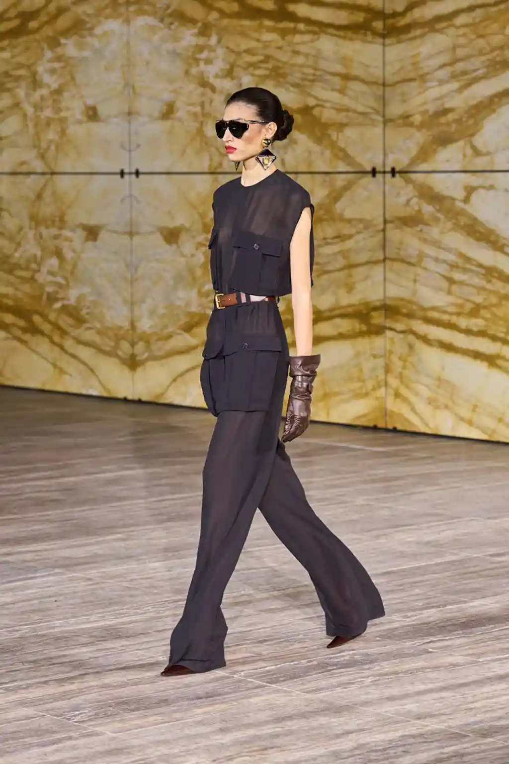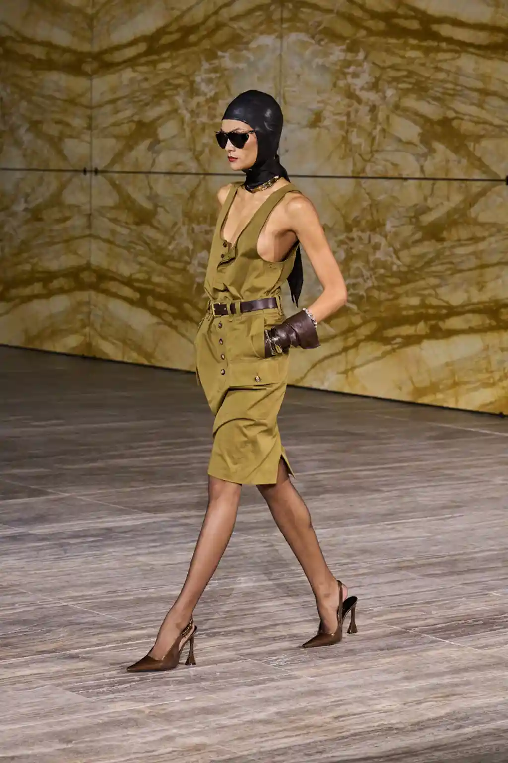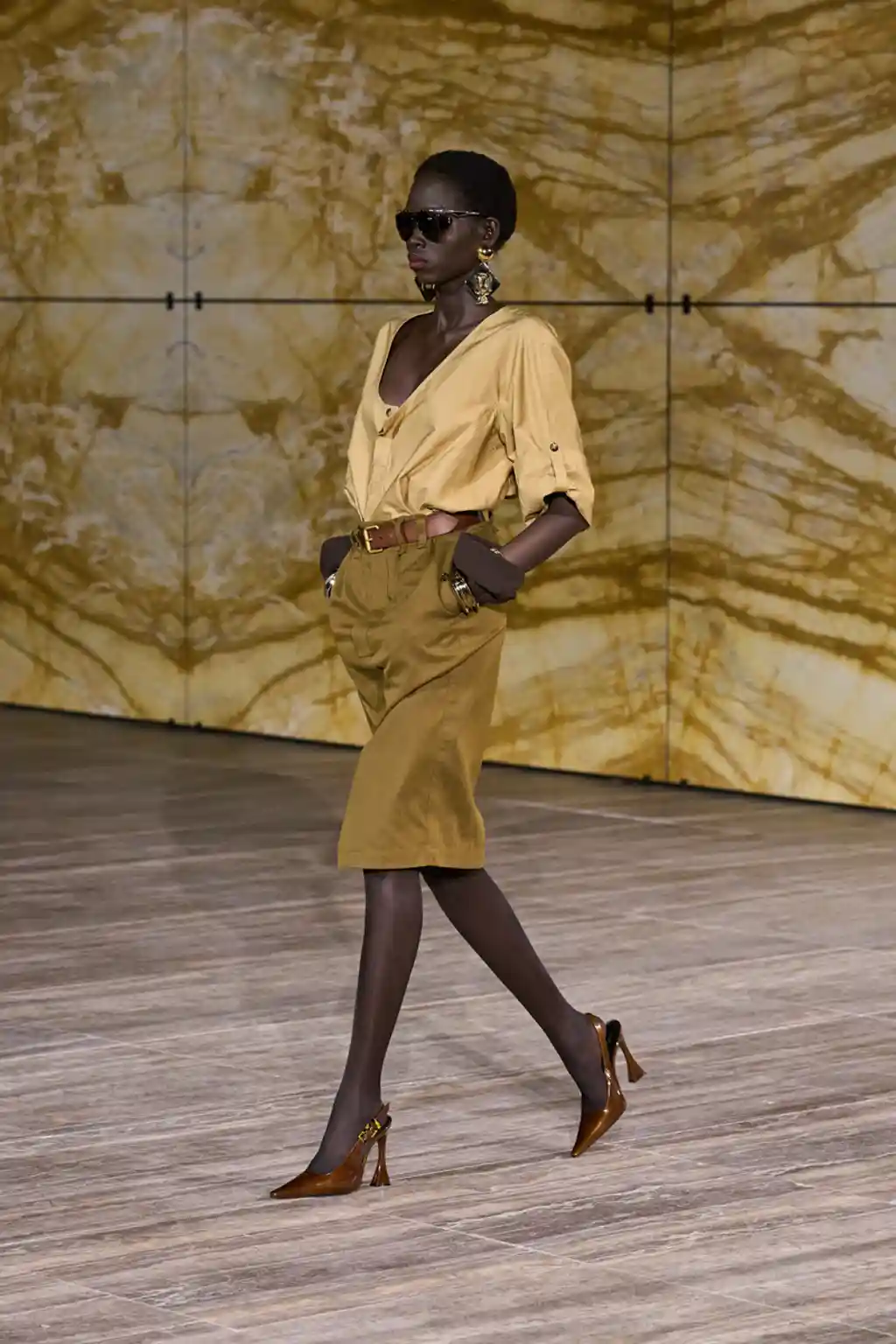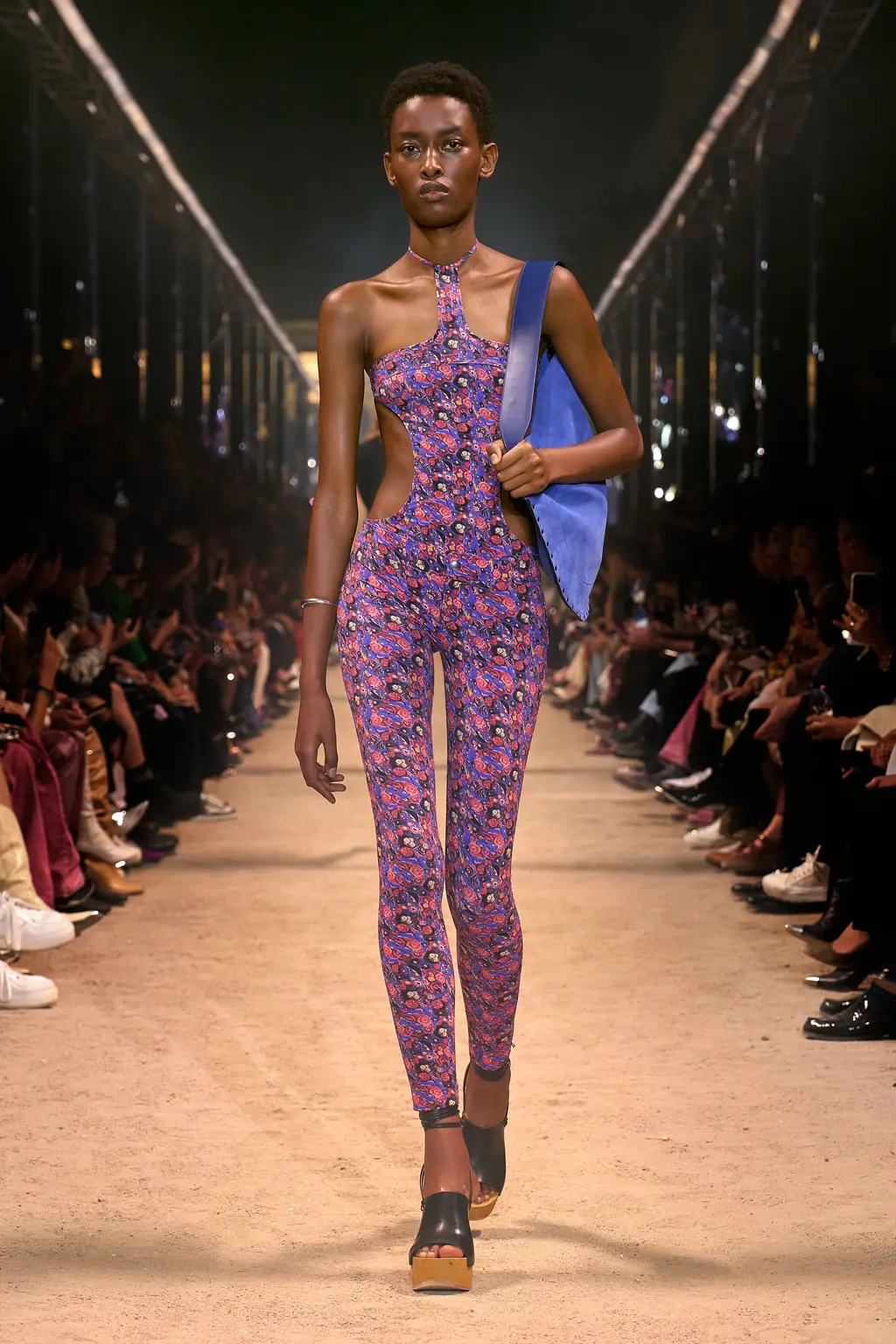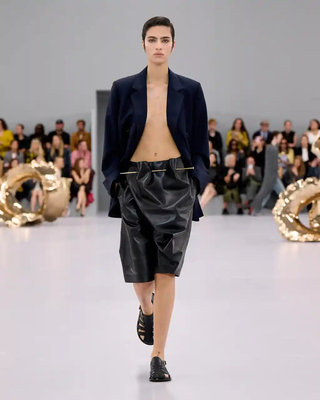 When Amelia Eartheart made her groundbreaking solo flight across the Atlantic, she planned to touch down in Paris, but mechanical difficulties led her to land in Derry, Ireland instead. Just the other night, however, Anthony Vacerello planted her right in front of the Eiffel Tower – or at least the likeness he created – dressing models in aviator shades, leather gloves and flight-ready jumpsuits. Everything, except the mousseline evening wear, was rendered in cotton. It was Vacerello’s blank canvas, a dramatic change of course from last season’s high adrenaline power suits. Like several brands this season, Vacarello dialled it right back. Call it a response to quiet luxury or a natural pendulum swing away from chasing virality, but ostentation is out. With that said, models wore giant gold earrings and sculptural heels along with their cargo skirts and workwear shirts, so the collection was far from being devoid of glamour.