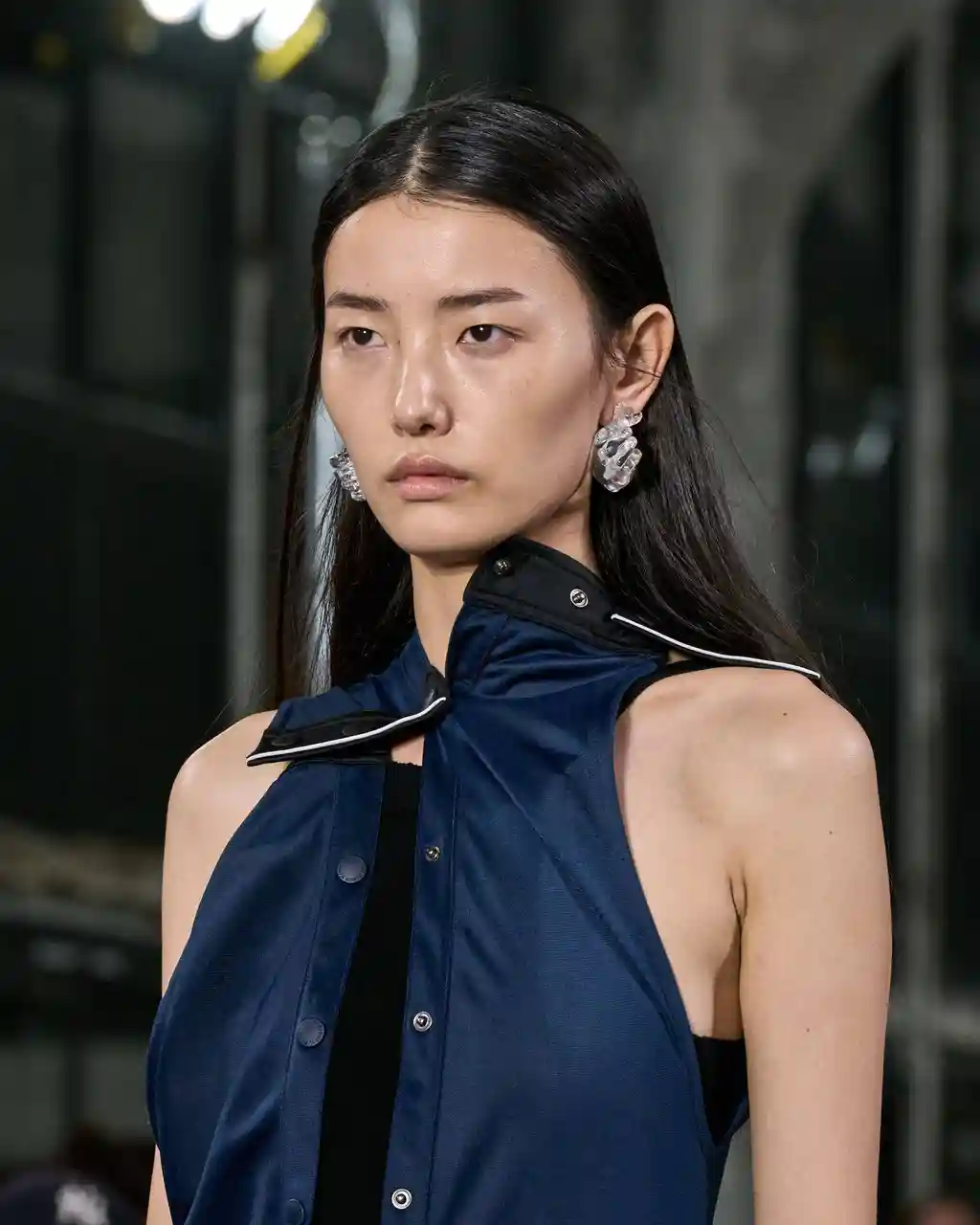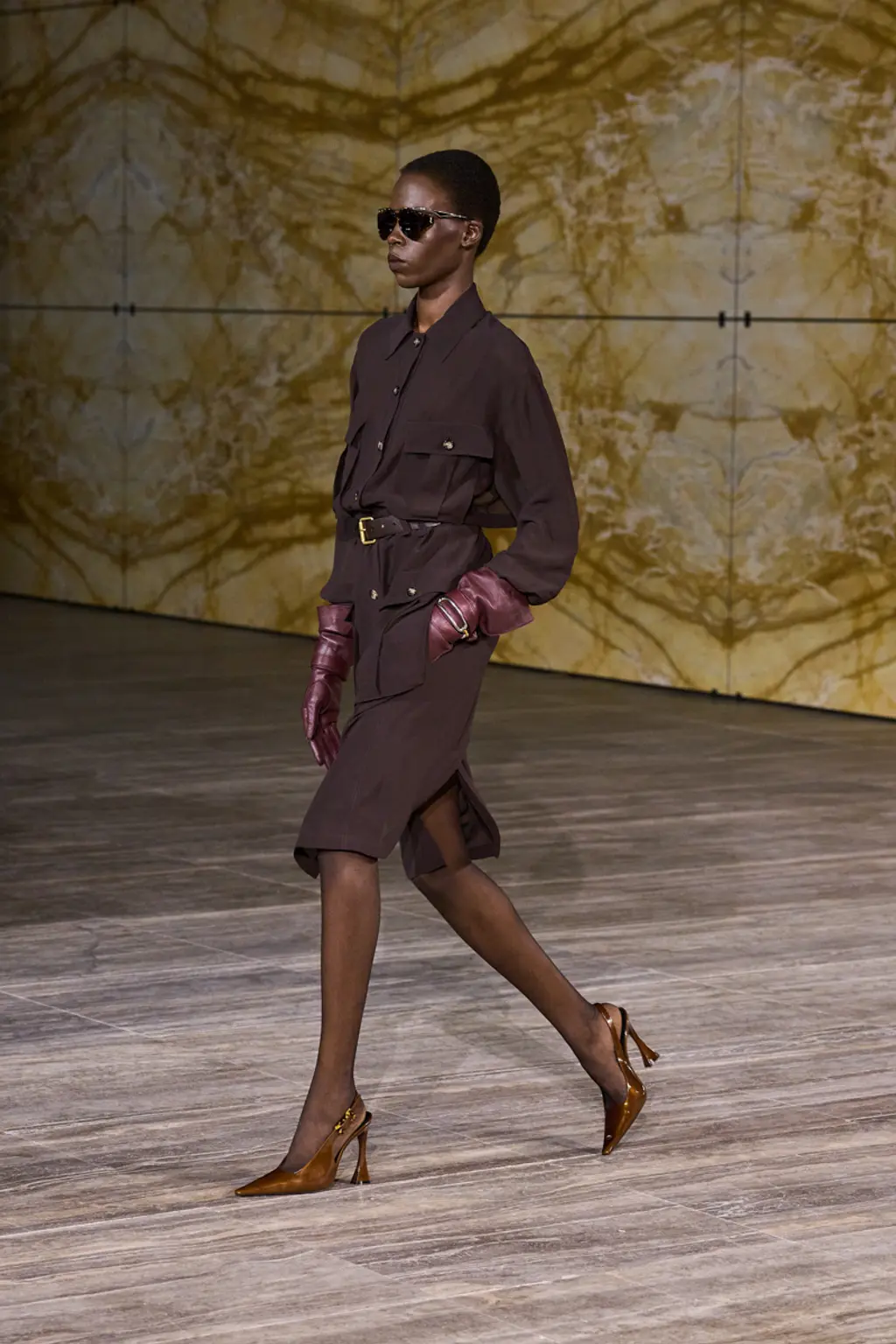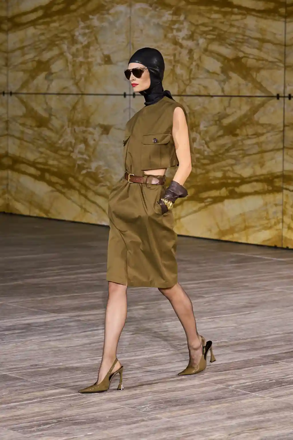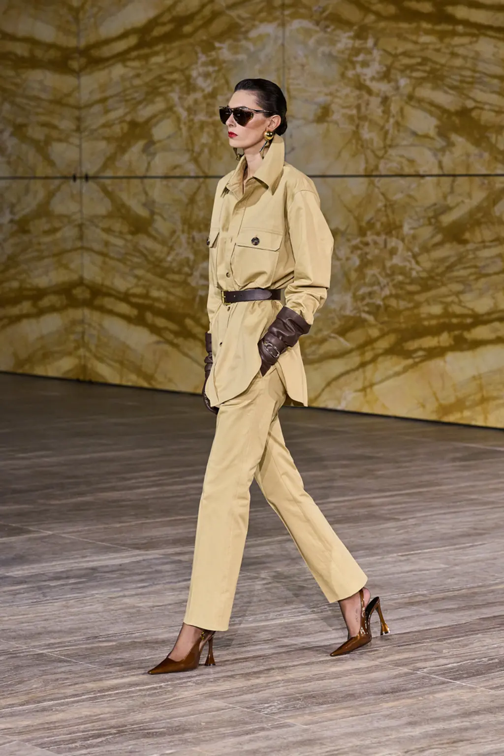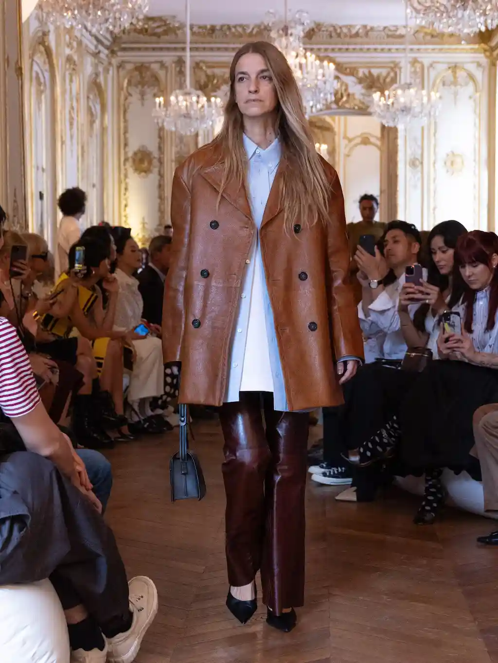 When Amelia Eartheart made her groundbreaking solo flight across the Atlantic, she planned to touch down in Paris, but mechanical difficulties led her to land in Derry, Ireland instead. Just the other night, however, Anthony Vacerello planted her right in front of the Eiffel Tower – or at least the likeness he created – dressing models in aviator shades, leather gloves and flight-ready jumpsuits. Everything, except the mousseline evening wear, was rendered in cotton. It was Vacerello’s blank canvas, a dramatic change of course from last season’s high adrenaline power suits. Like several brands this season, Vacarello dialled it right back. Call it a response to quiet luxury or a natural pendulum swing away from chasing virality, but ostentation is out. With that said, models wore giant gold earrings and sculptural heels along with their cargo skirts and workwear shirts, so the collection was far from being devoid of glamour.