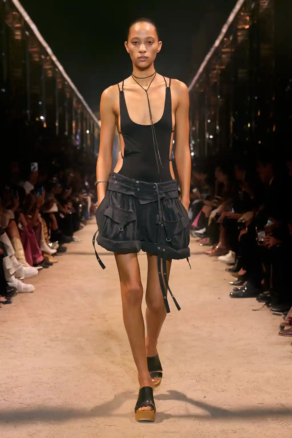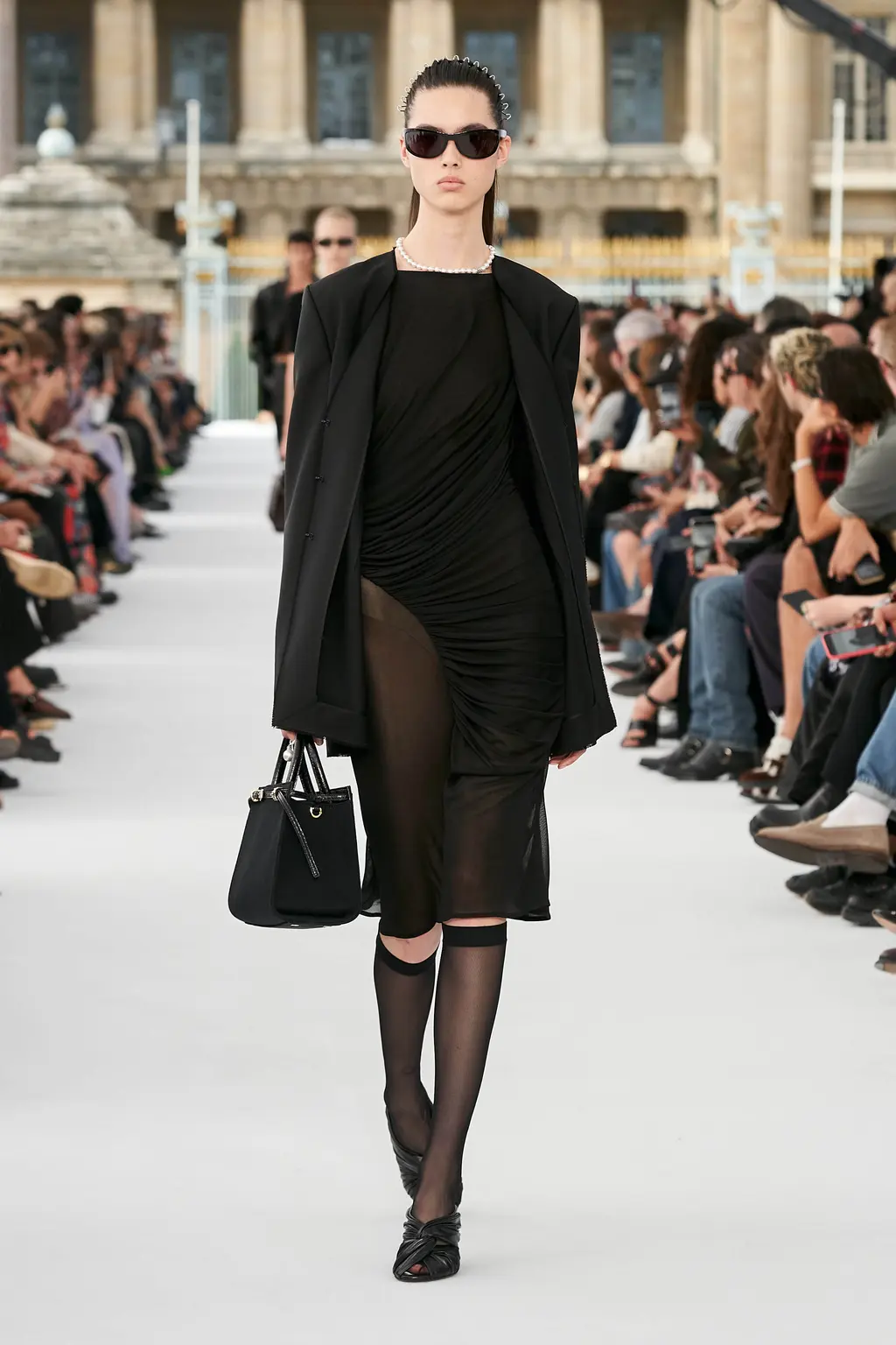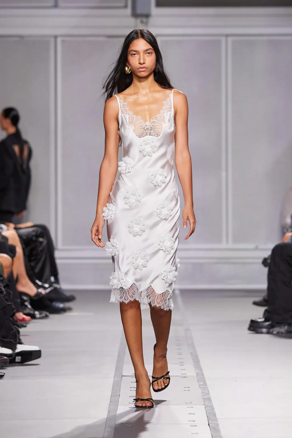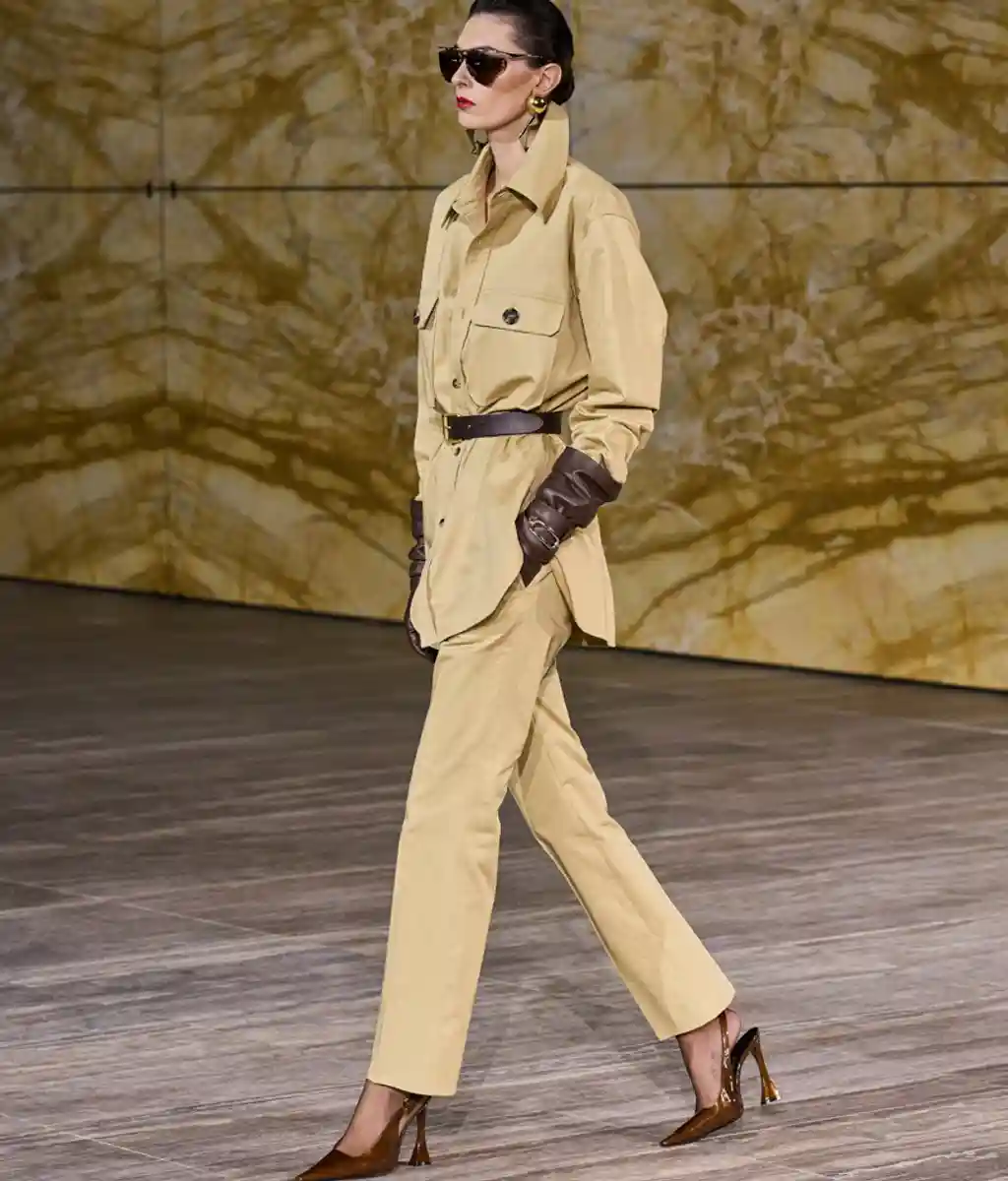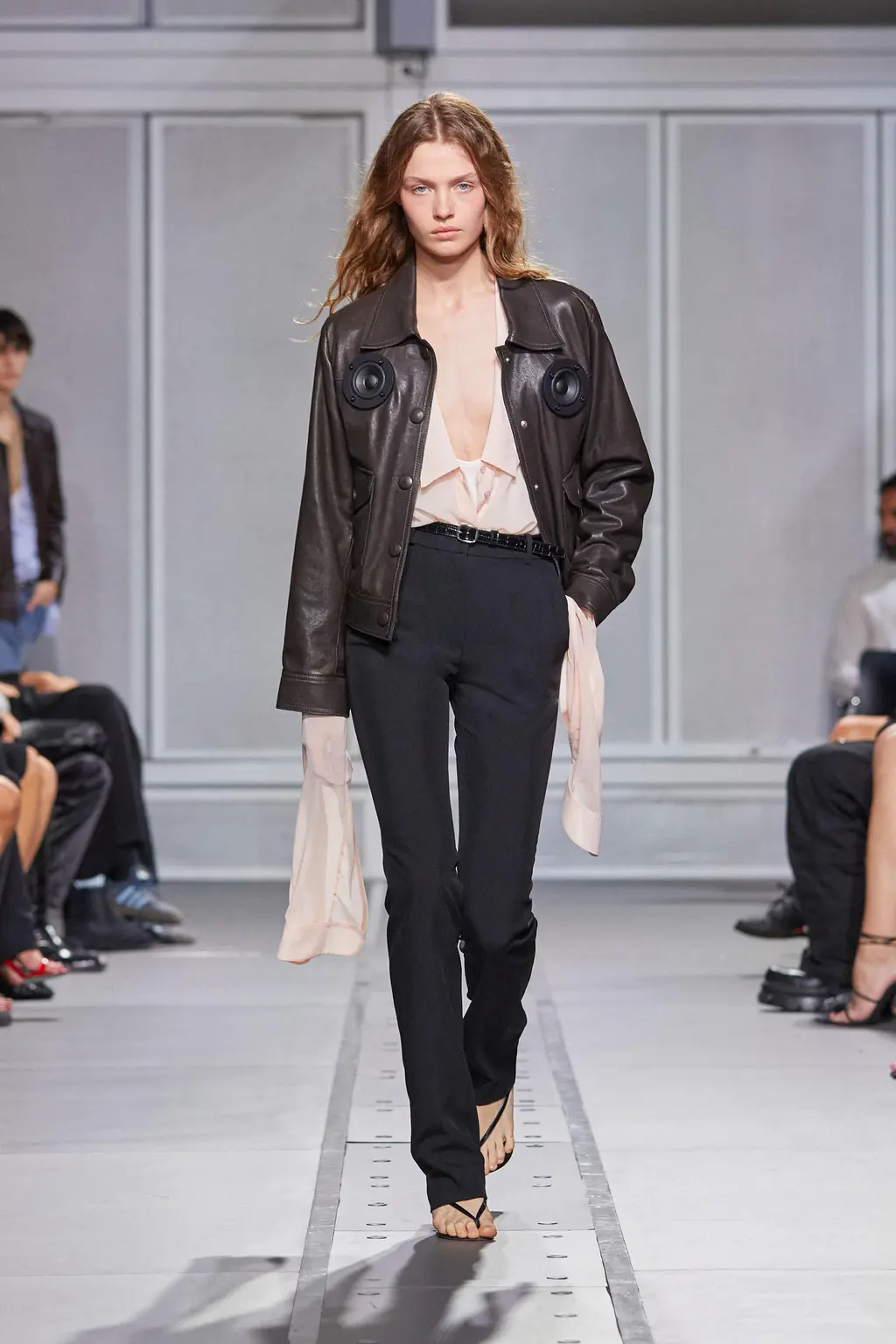 When Amelia Eartheart made her groundbreaking solo flight across the Atlantic, she planned to touch down in Paris, but mechanical difficulties led her to land in Derry, Ireland instead. Just the other night, however, Anthony Vacerello planted her right in front of the Eiffel Tower – or at least the likeness he created – dressing models in aviator shades, leather gloves and flight-ready jumpsuits. Everything, except the mousseline evening wear, was rendered in cotton. It was Vacerello’s blank canvas, a dramatic change of course from last season’s high adrenaline power suits. Like several brands this season, Vacarello dialled it right back. Call it a response to quiet luxury or a natural pendulum swing away from chasing virality, but ostentation is out. With that said, models wore giant gold earrings and sculptural heels along with their cargo skirts and workwear shirts, so the collection was far from being devoid of glamour.
