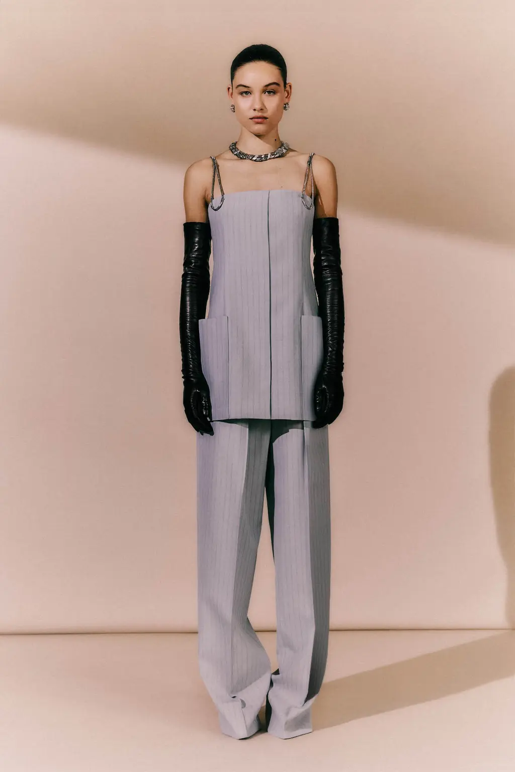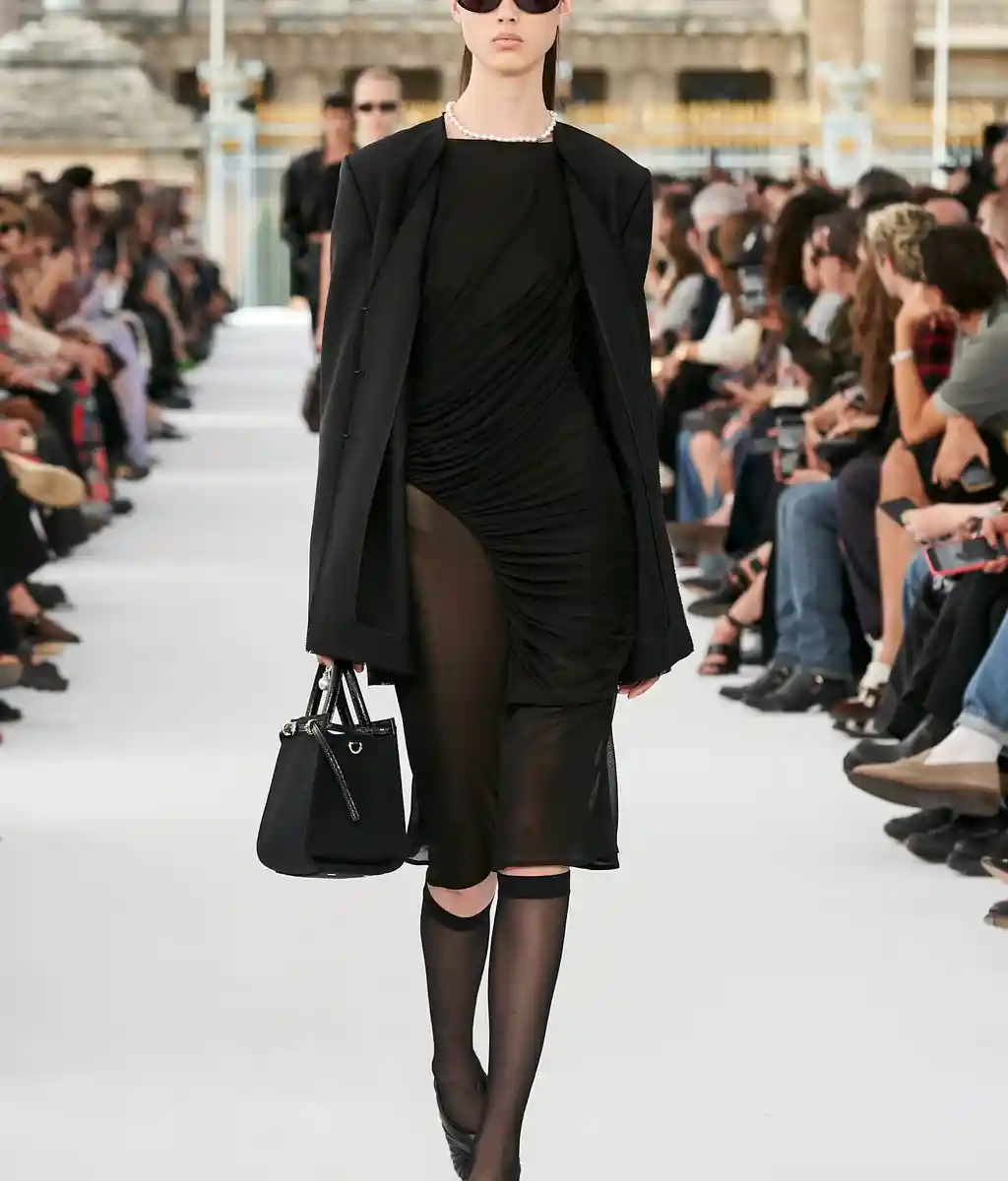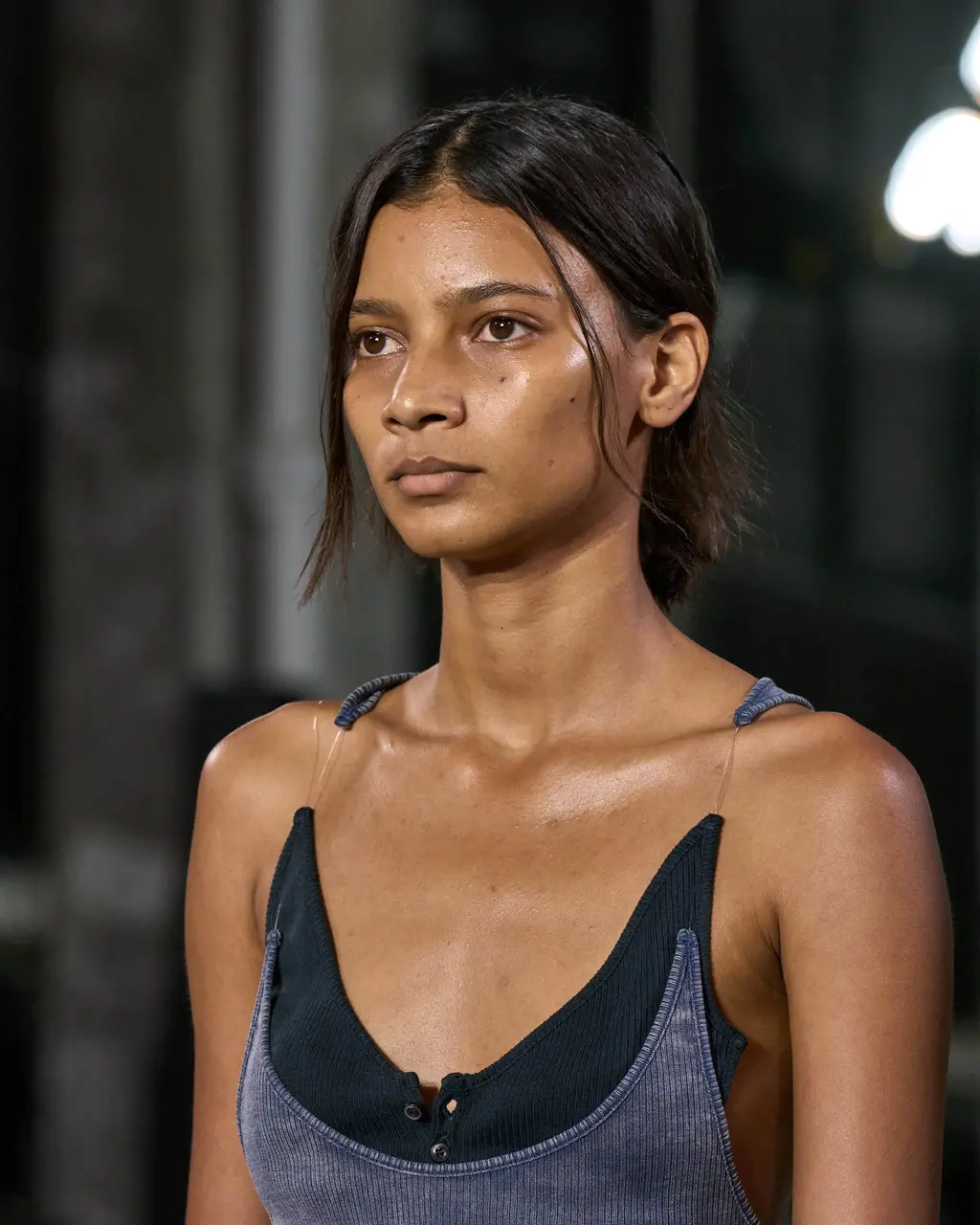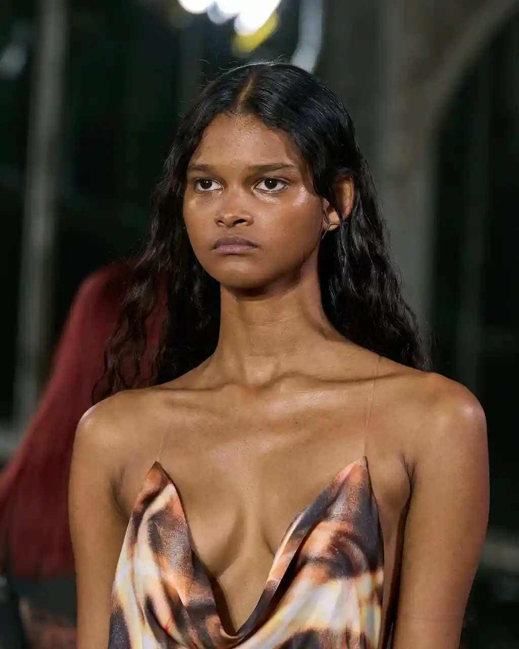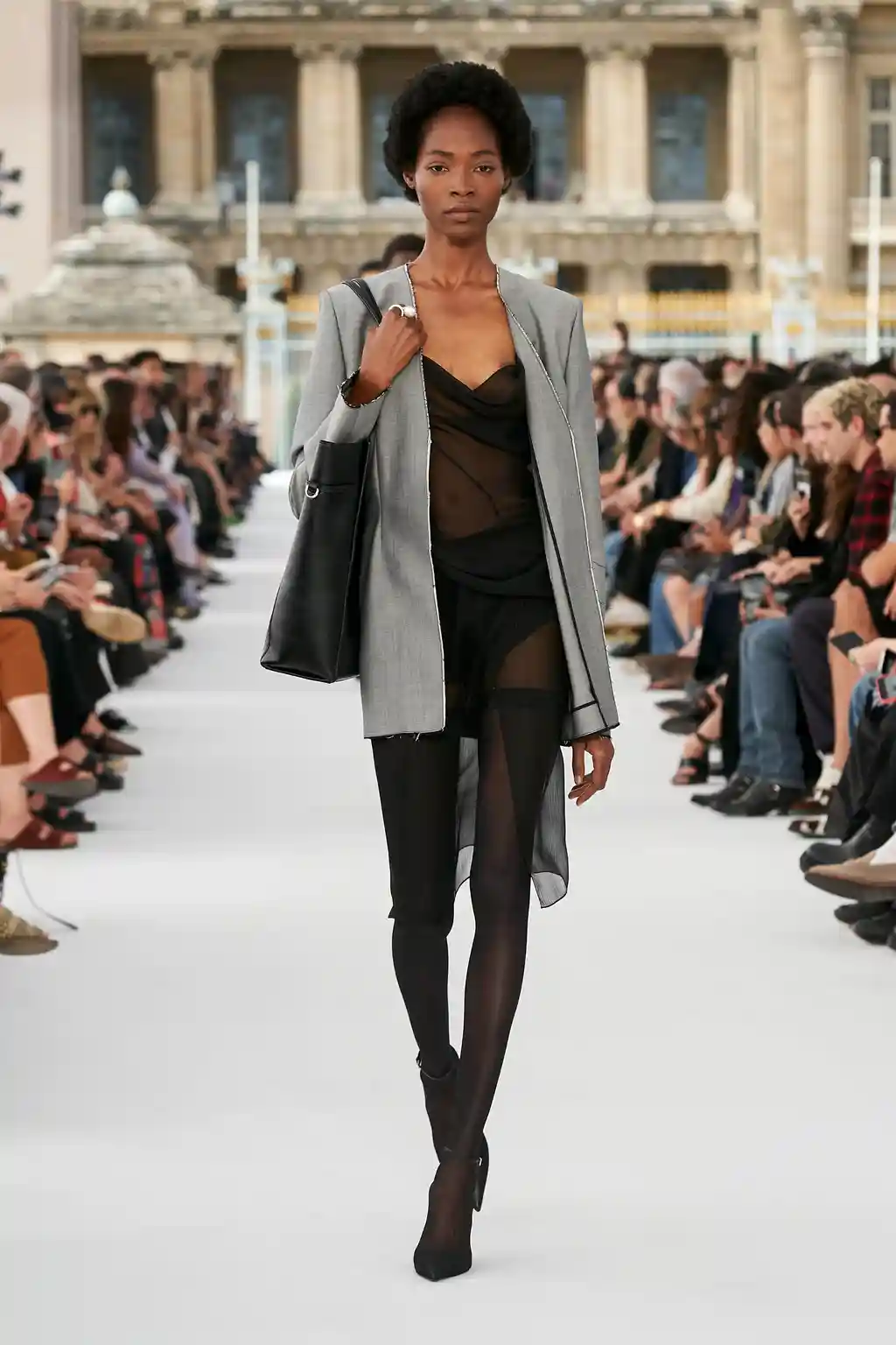 When Amelia Eartheart made her groundbreaking solo flight across the Atlantic, she planned to touch down in Paris, but mechanical difficulties led her to land in Derry, Ireland instead. Just the other night, however, Anthony Vacerello planted her right in front of the Eiffel Tower – or at least the likeness he created – dressing models in aviator shades, leather gloves and flight-ready jumpsuits. Everything, except the mousseline evening wear, was rendered in cotton. It was Vacerello’s blank canvas, a dramatic change of course from last season’s high adrenaline power suits. Like several brands this season, Vacarello dialled it right back. Call it a response to quiet luxury or a natural pendulum swing away from chasing virality, but ostentation is out. With that said, models wore giant gold earrings and sculptural heels along with their cargo skirts and workwear shirts, so the collection was far from being devoid of glamour.