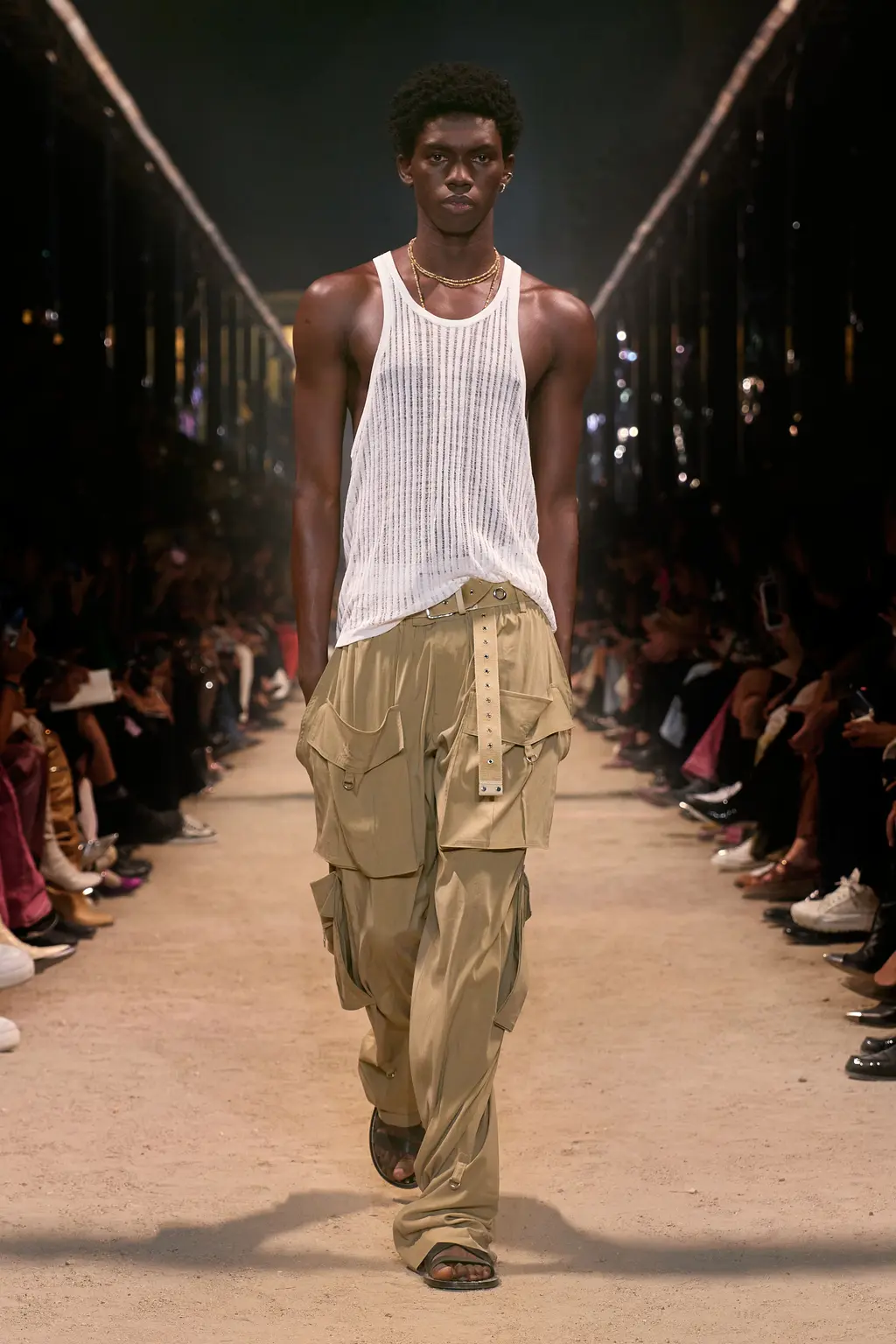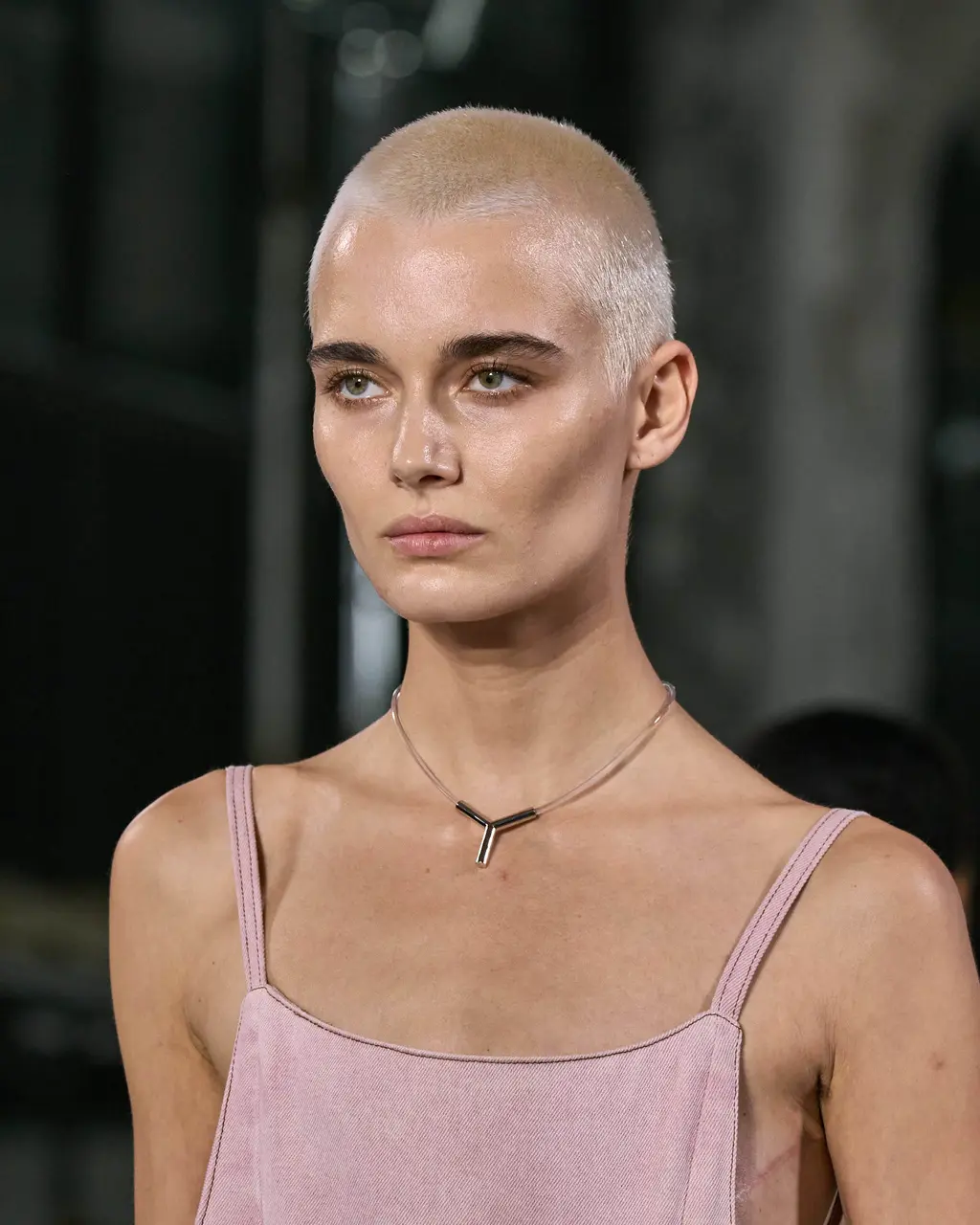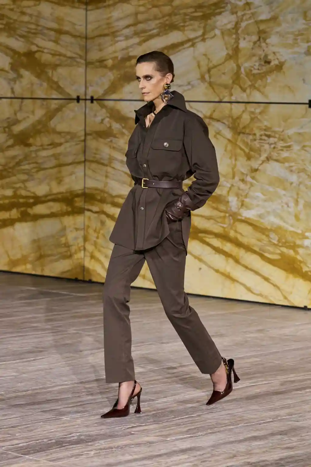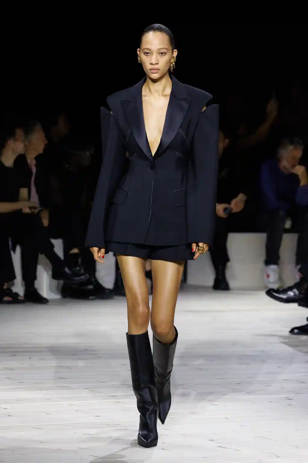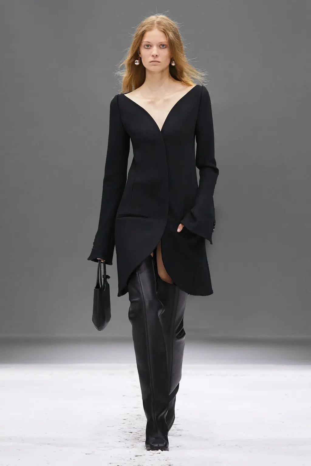 When Amelia Eartheart made her groundbreaking solo flight across the Atlantic, she planned to touch down in Paris, but mechanical difficulties led her to land in Derry, Ireland instead. Just the other night, however, Anthony Vacerello planted her right in front of the Eiffel Tower – or at least the likeness he created – dressing models in aviator shades, leather gloves and flight-ready jumpsuits. Everything, except the mousseline evening wear, was rendered in cotton. It was Vacerello’s blank canvas, a dramatic change of course from last season’s high adrenaline power suits. Like several brands this season, Vacarello dialled it right back. Call it a response to quiet luxury or a natural pendulum swing away from chasing virality, but ostentation is out. With that said, models wore giant gold earrings and sculptural heels along with their cargo skirts and workwear shirts, so the collection was far from being devoid of glamour.