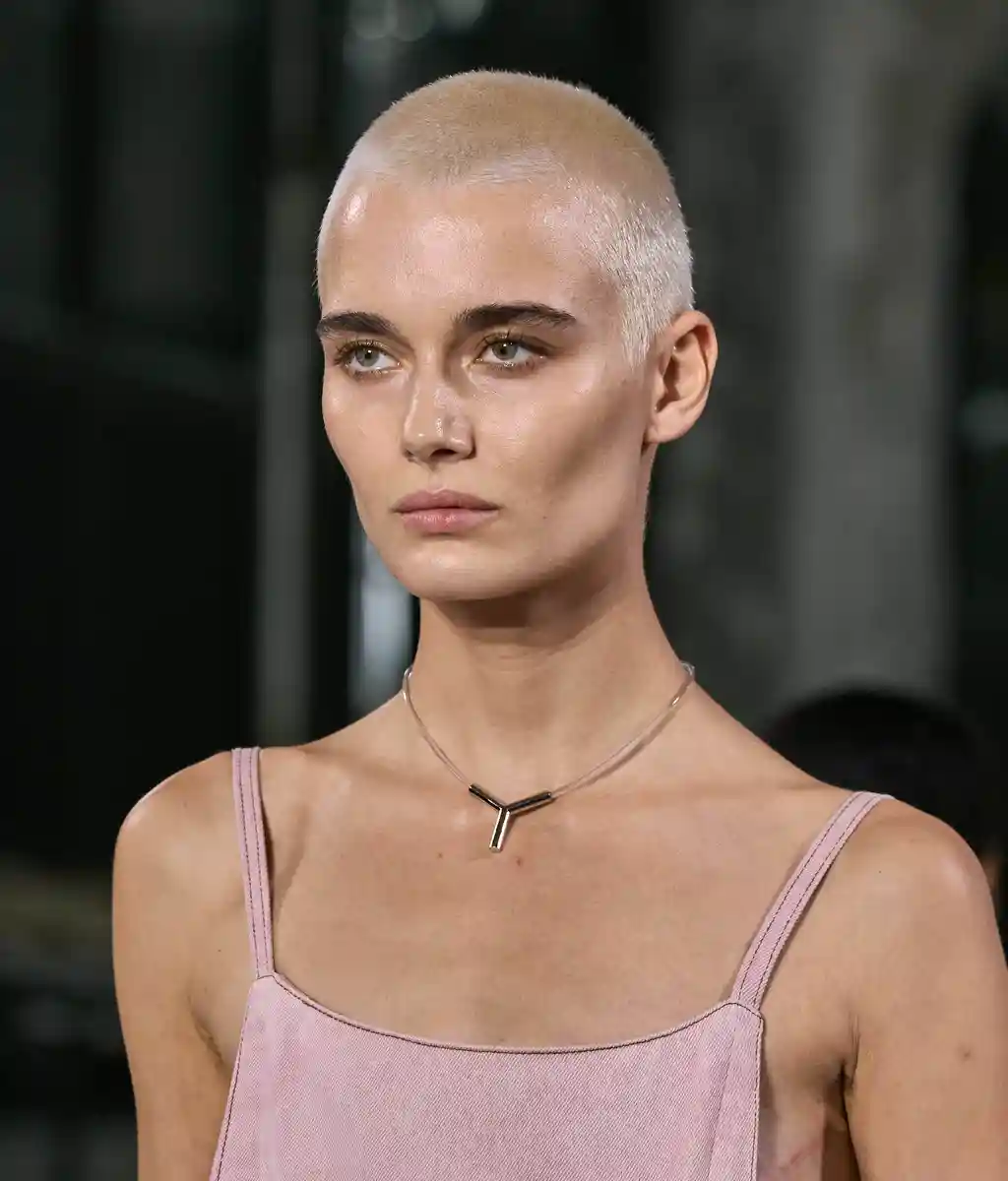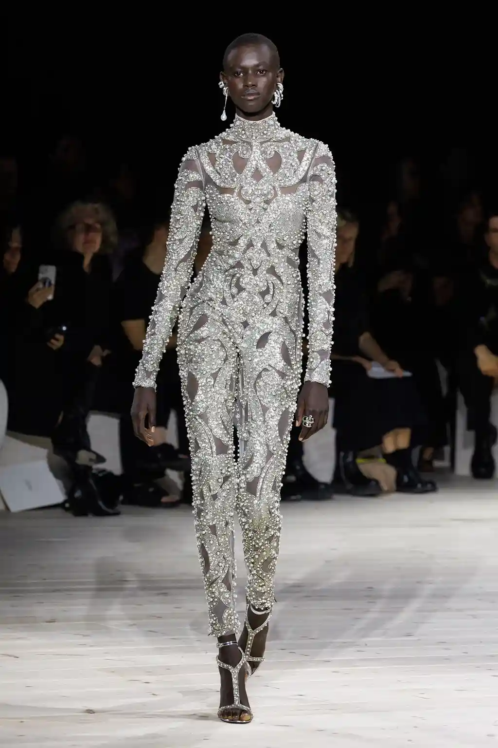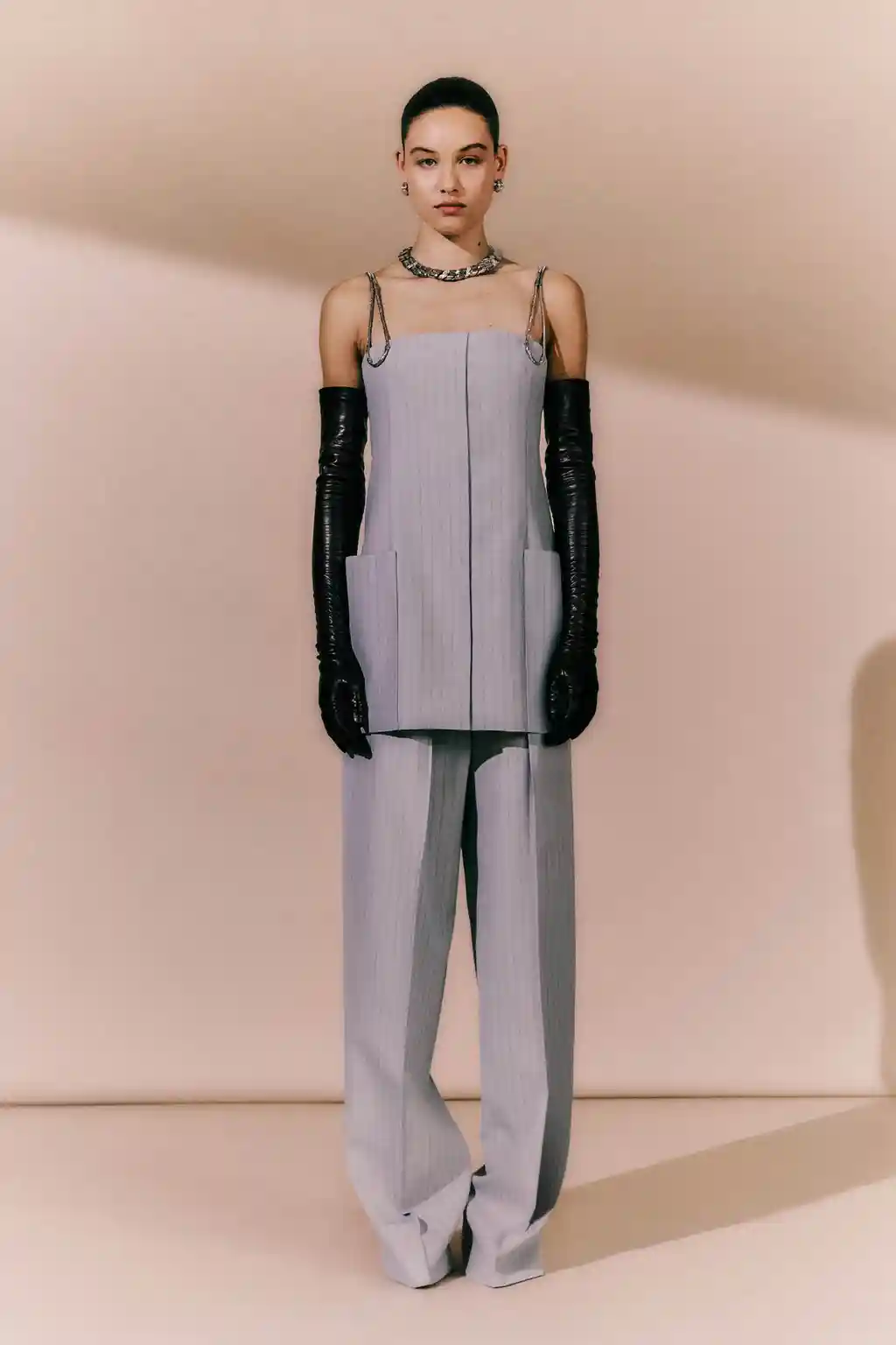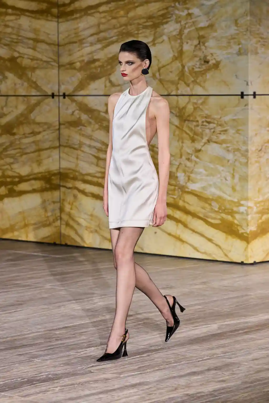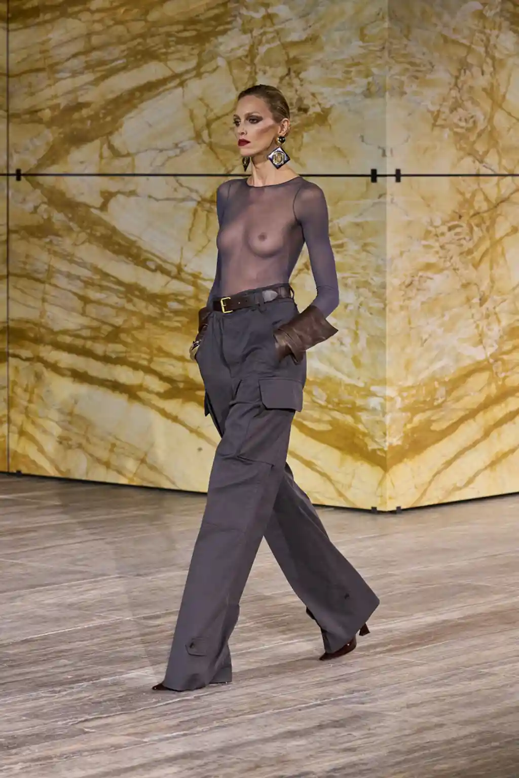 When Amelia Eartheart made her groundbreaking solo flight across the Atlantic, she planned to touch down in Paris, but mechanical difficulties led her to land in Derry, Ireland instead. Just the other night, however, Anthony Vacerello planted her right in front of the Eiffel Tower – or at least the likeness he created – dressing models in aviator shades, leather gloves and flight-ready jumpsuits. Everything, except the mousseline evening wear, was rendered in cotton. It was Vacerello’s blank canvas, a dramatic change of course from last season’s high adrenaline power suits. Like several brands this season, Vacarello dialled it right back. Call it a response to quiet luxury or a natural pendulum swing away from chasing virality, but ostentation is out. With that said, models wore giant gold earrings and sculptural heels along with their cargo skirts and workwear shirts, so the collection was far from being devoid of glamour.
