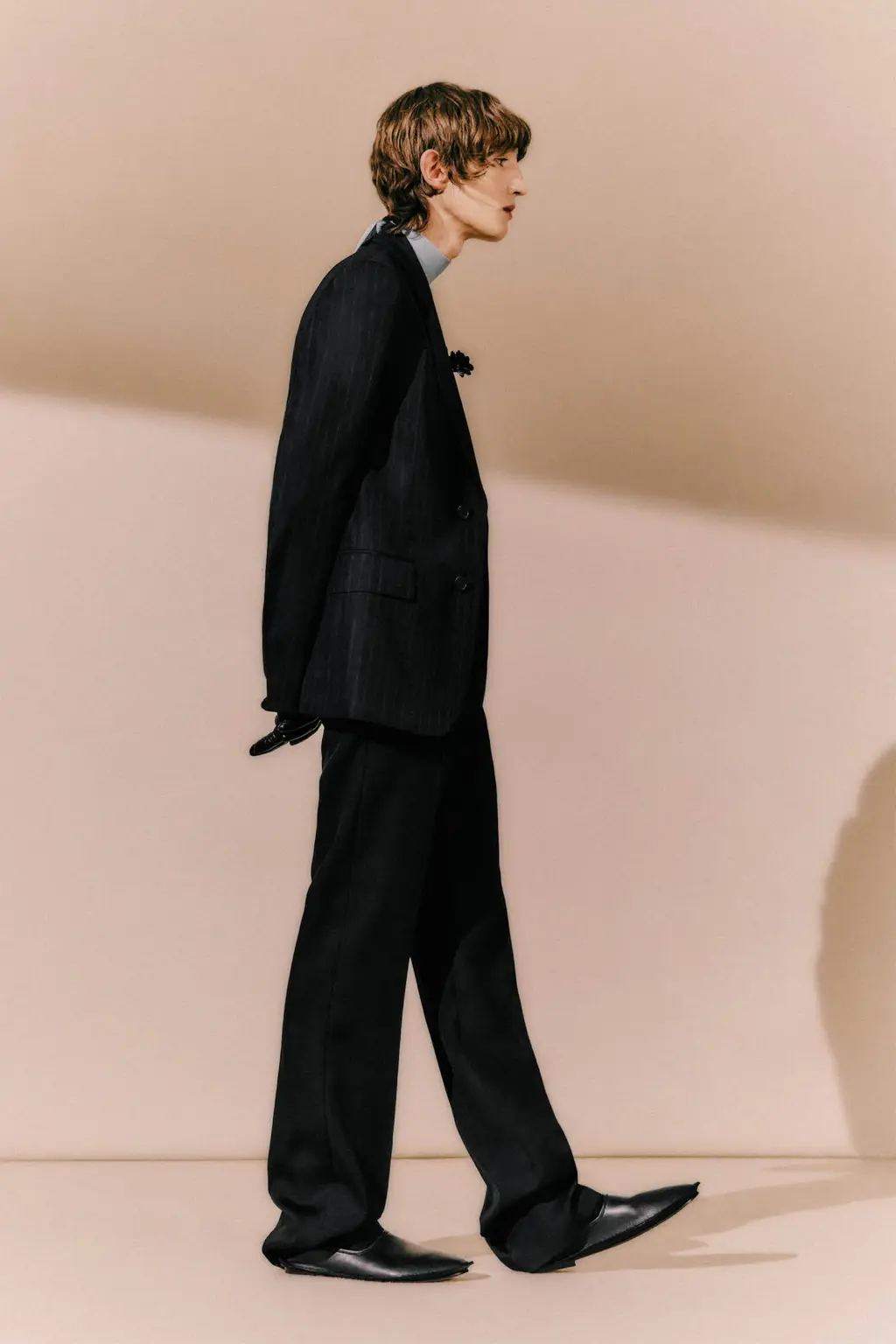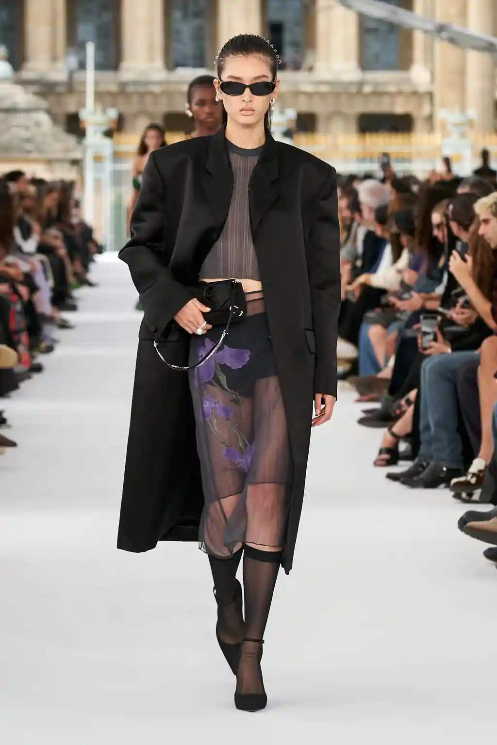 It’s almost a year since the Balenciaga child ad scandal shook the brand to its core. Since then, Demna has taken a more restrained approach, and this season was no different. The collection restated Demna’s most enduring codes: enormous coats and blazers with David Byrne sized shoulders, slouchy hoodies and sweatpants, a spattering of floral evening gowns. There were humongous biker jackets, technical trench coats and ultra-wide leg denim pants. Some models clutched passports with boarding passes to Geneva – where Demna lives – tucked into them. Demna described it as “my most personal and my most favourite collection because it was about me; it was about my story.”