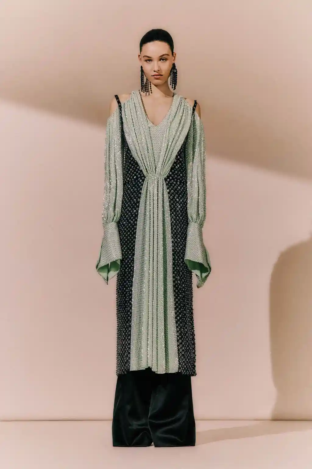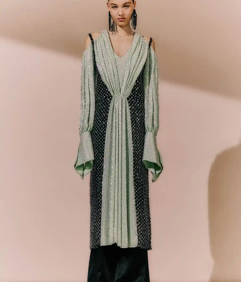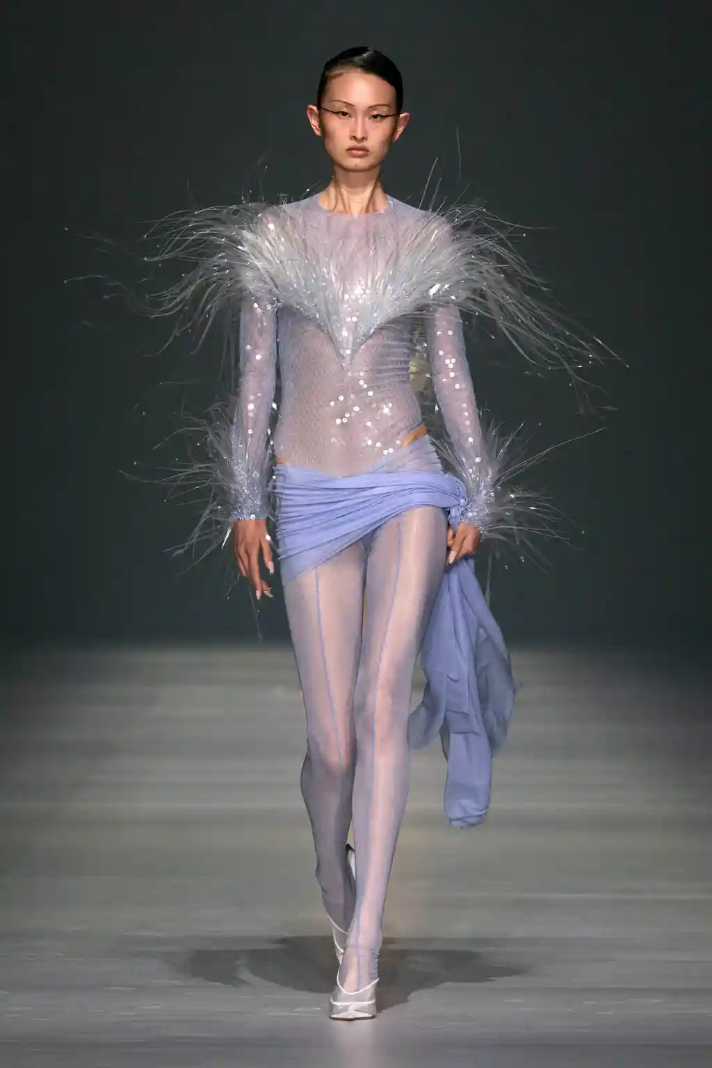 Deep sea creatures may look ugly, but Cadwallader reimagined underwater slugs and molluscs as things of pure beauty. Sheer spiky tops bristled like sea urchins and jackets were splashed with ombre and polka dots inspired by undersea slugs. Long trains of chiffon rippled like tentacles in the sea and showstopping sequin bodysuits featured extensions that sprayed out from the body like plankton. But it didn’t feel costume‑y. Instead, it captured the pure joy that comes from taking a deep dive into our childhood interests and coming up victorious.