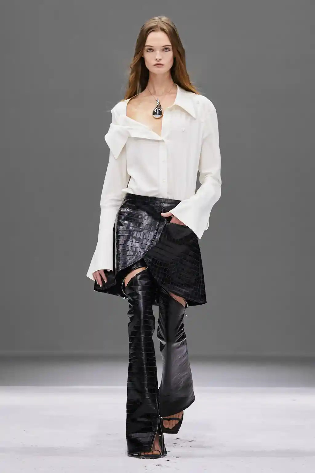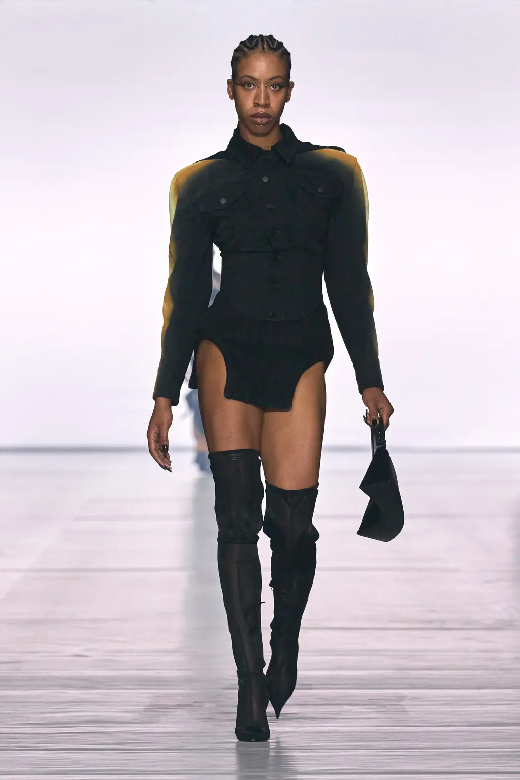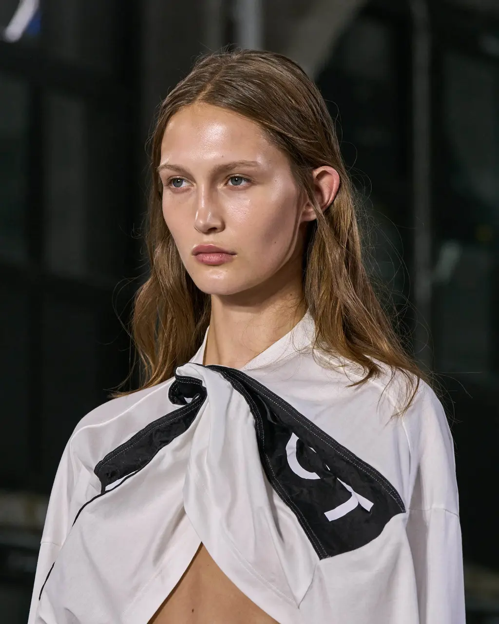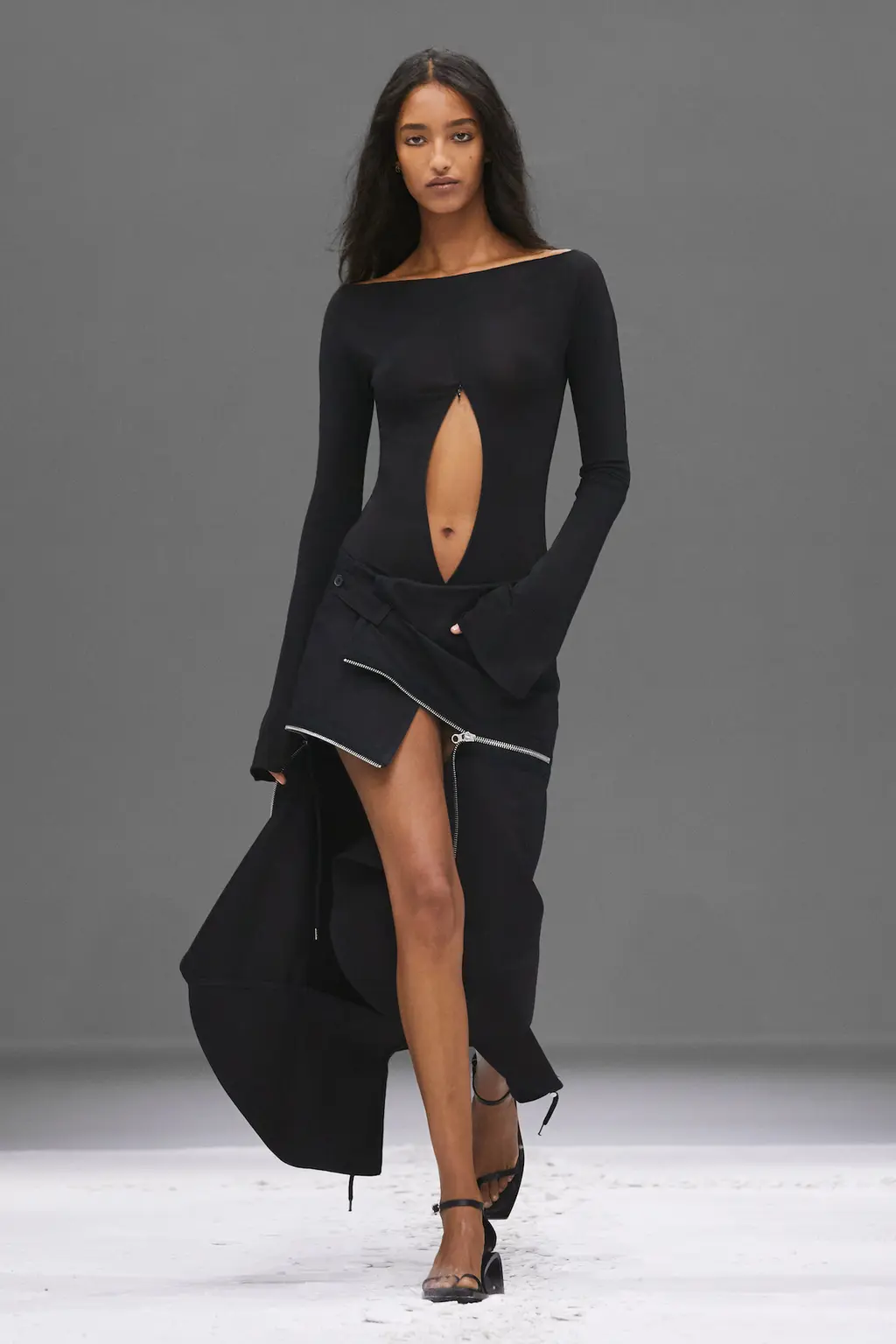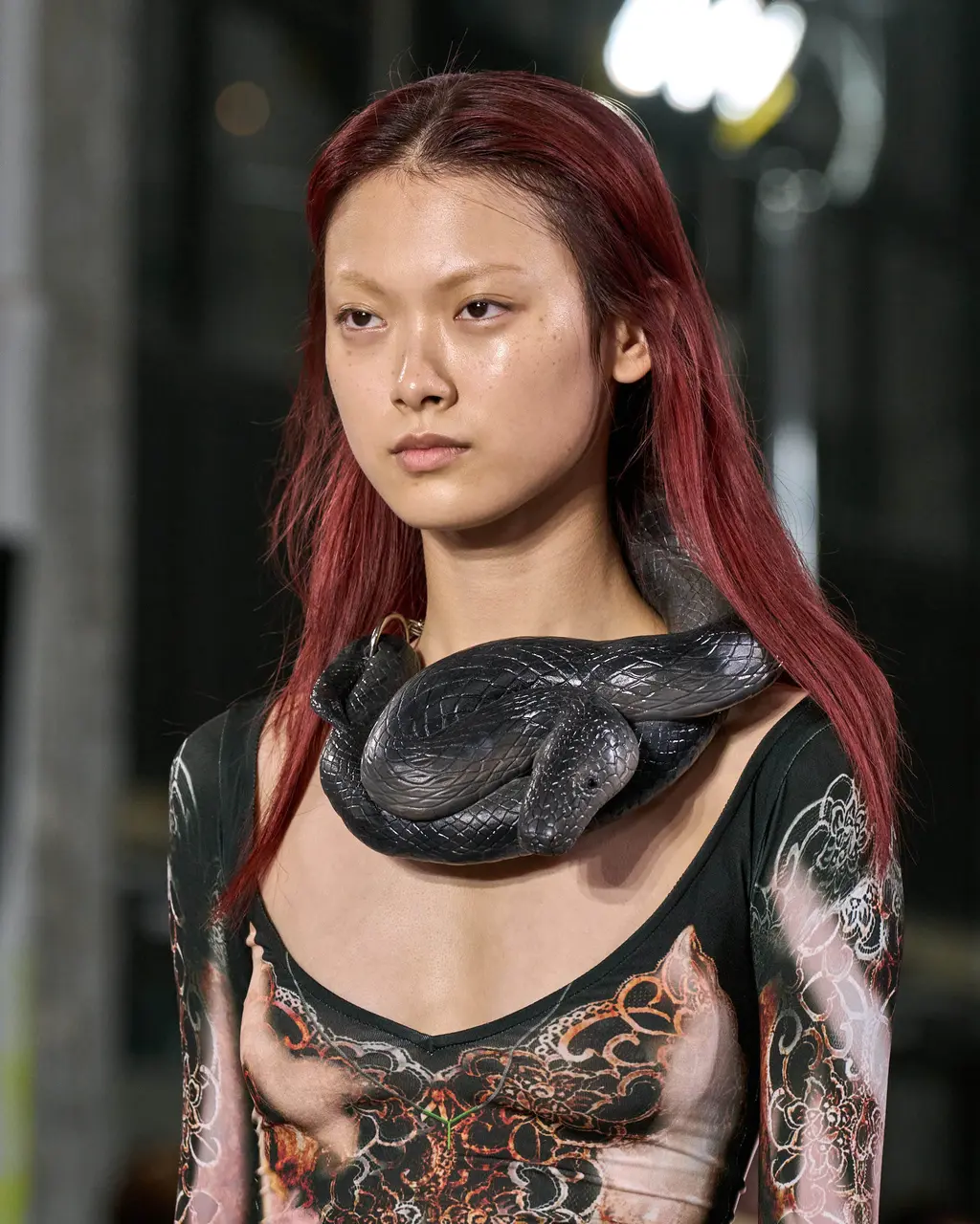 Paris may claim the title of the world’s fashion capital, but Belgium has produced some of the most celebrated fashion designers, from Martin Margiela to Raf Simons and, of course, the Antwerp Six. Glenn Martens grew up in Bruges, where he initially studied interior architecture, and this season he turned back to his hometown, drawing from its towering Gothic buildings as inspiration. The show opened with an imposing oversized hooded trench, featuring undone hook-and-eye details. Life-size snake necklaces curled across chests like breastplates. Shirts were intentionally scrunched up and logo T‑shirts came cropped and wildly twisted, paired with high-slit denim skirts. Hooded denim jackets engulfed the body while figure accentuating graphic dresses elongated silhouettes. There was a slow, almost funereal motion to the models’ walks, giving guests time to take in the details. “I really kind of envisioned it as Gothic towers in the middle of the Belgian fields,” Martens explained.