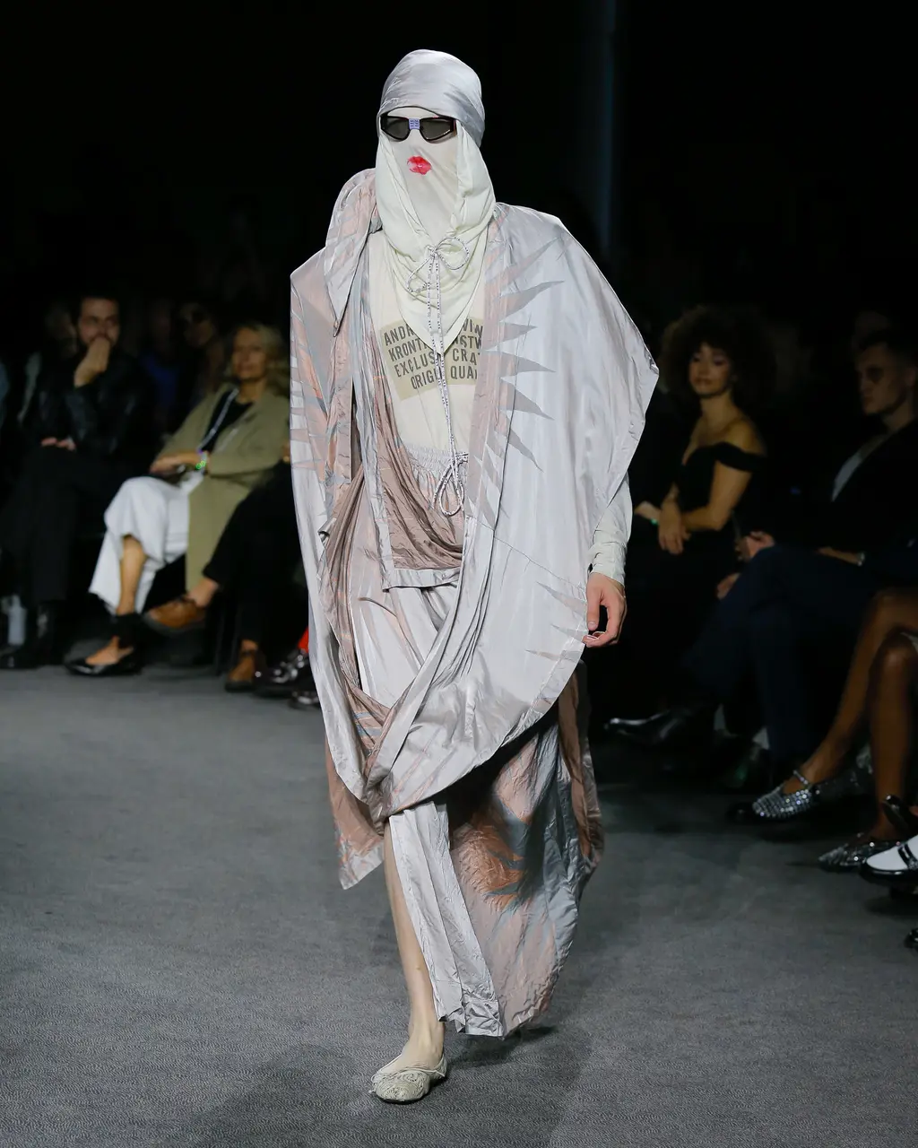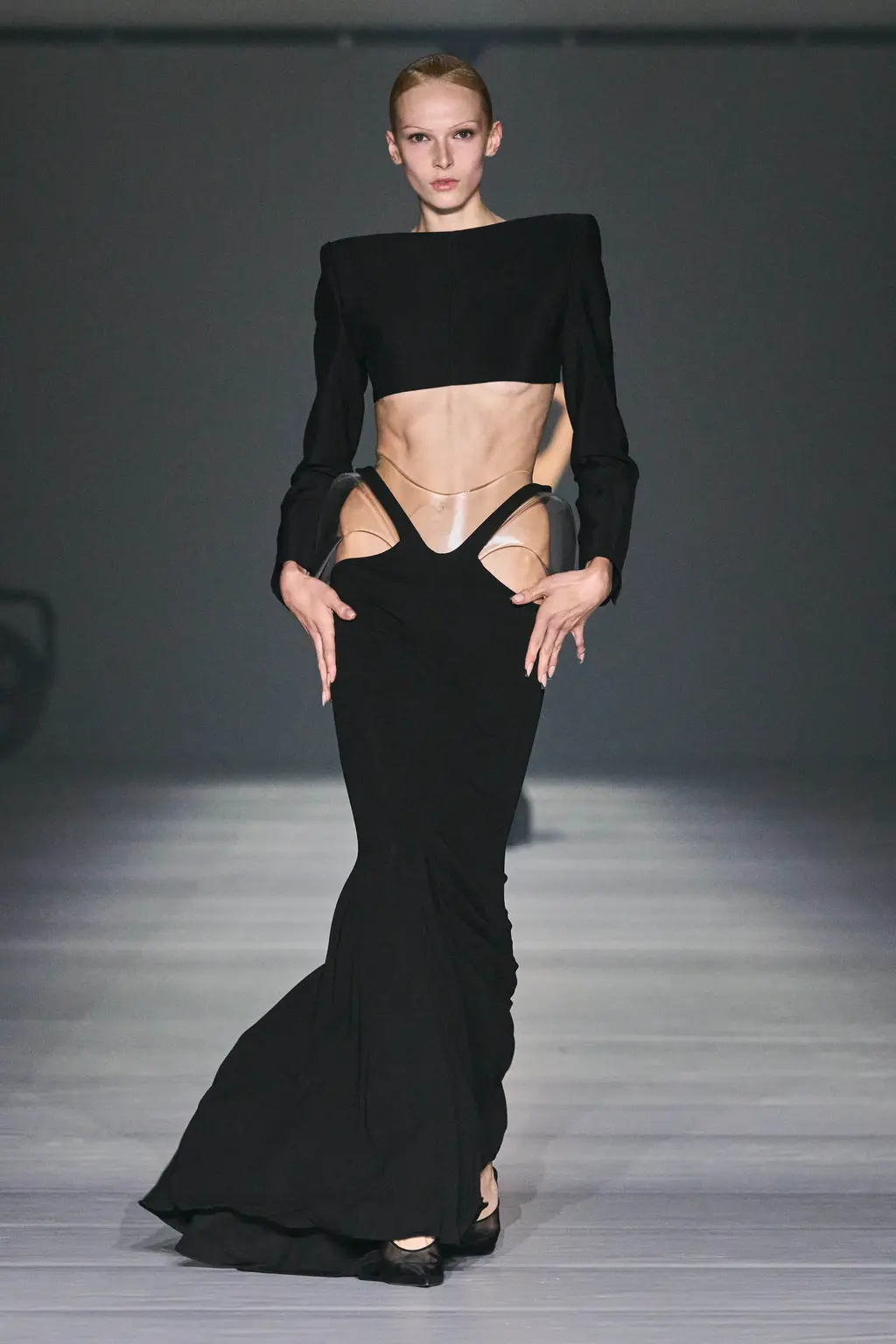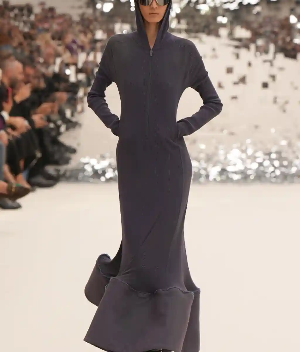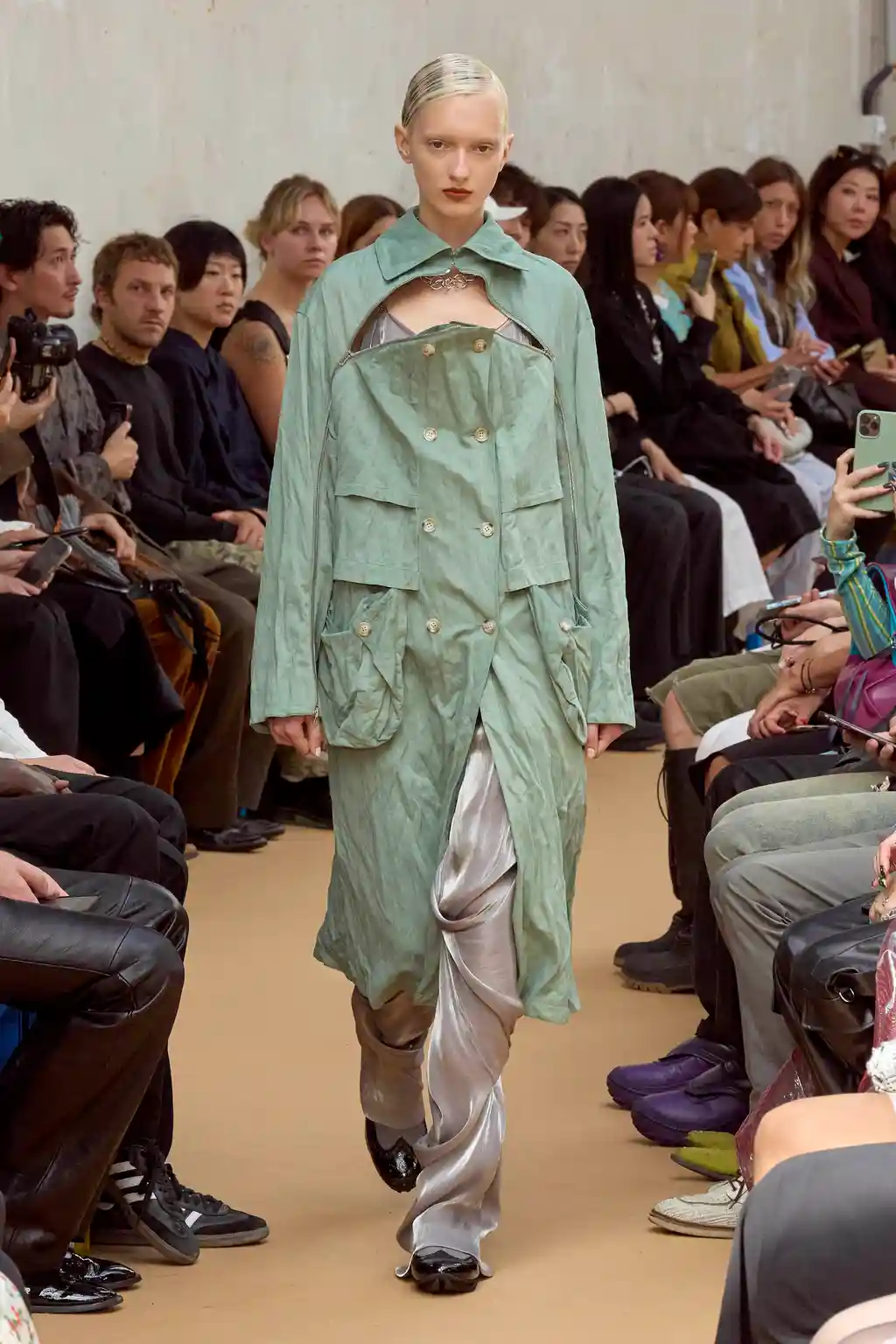 Paris may claim the title of the world’s fashion capital, but Belgium has produced some of the most celebrated fashion designers, from Martin Margiela to Raf Simons and, of course, the Antwerp Six. Glenn Martens grew up in Bruges, where he initially studied interior architecture, and this season he turned back to his hometown, drawing from its towering Gothic buildings as inspiration. The show opened with an imposing oversized hooded trench, featuring undone hook-and-eye details. Life-size snake necklaces curled across chests like breastplates. Shirts were intentionally scrunched up and logo T‑shirts came cropped and wildly twisted, paired with high-slit denim skirts. Hooded denim jackets engulfed the body while figure accentuating graphic dresses elongated silhouettes. There was a slow, almost funereal motion to the models’ walks, giving guests time to take in the details. “I really kind of envisioned it as Gothic towers in the middle of the Belgian fields,” Martens explained.