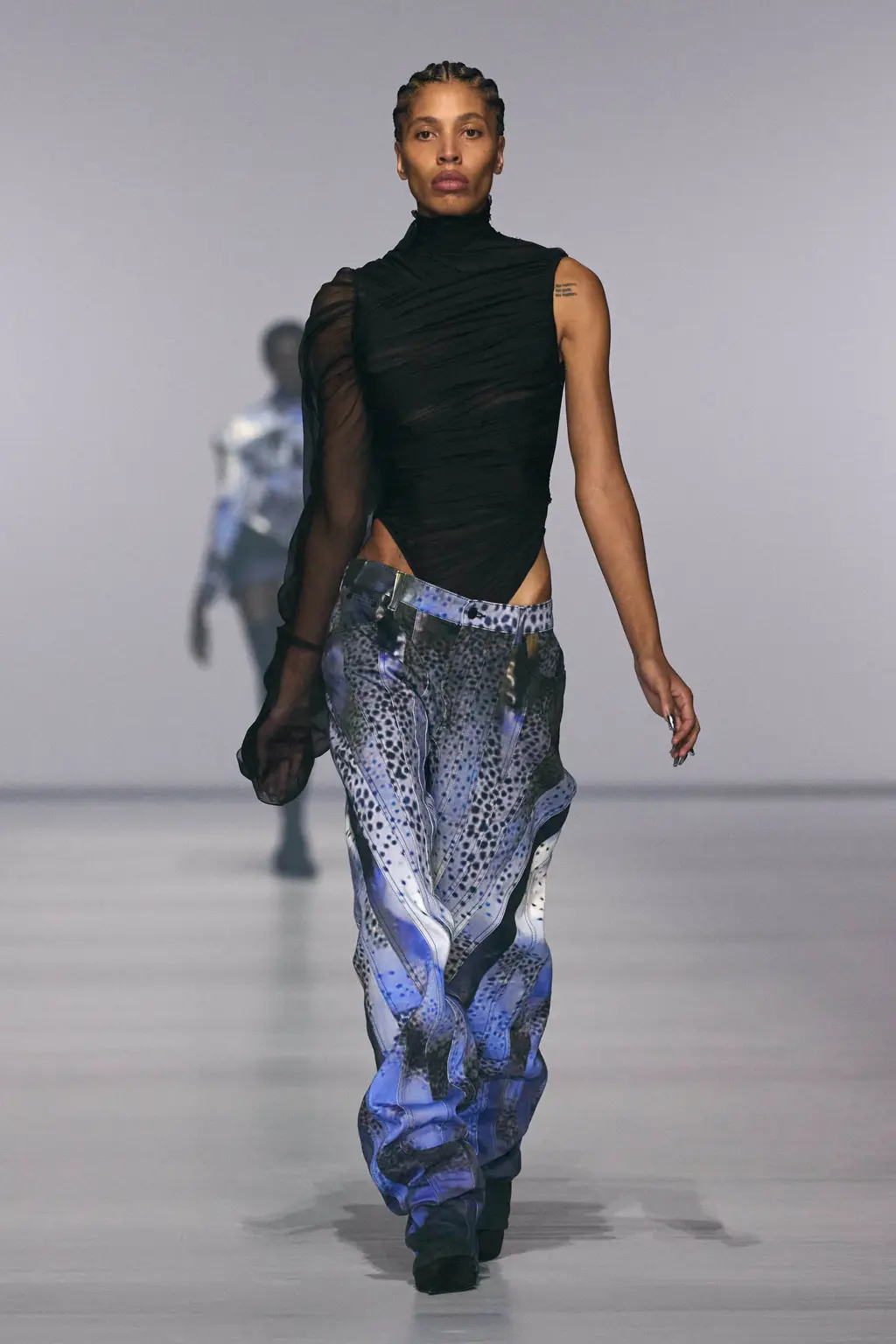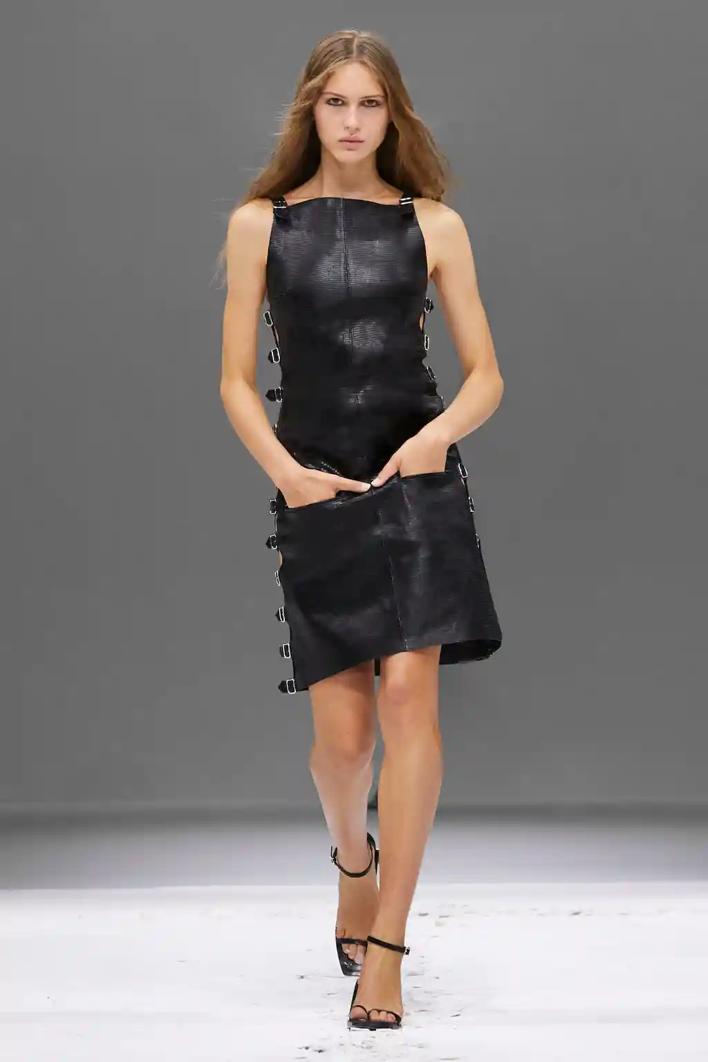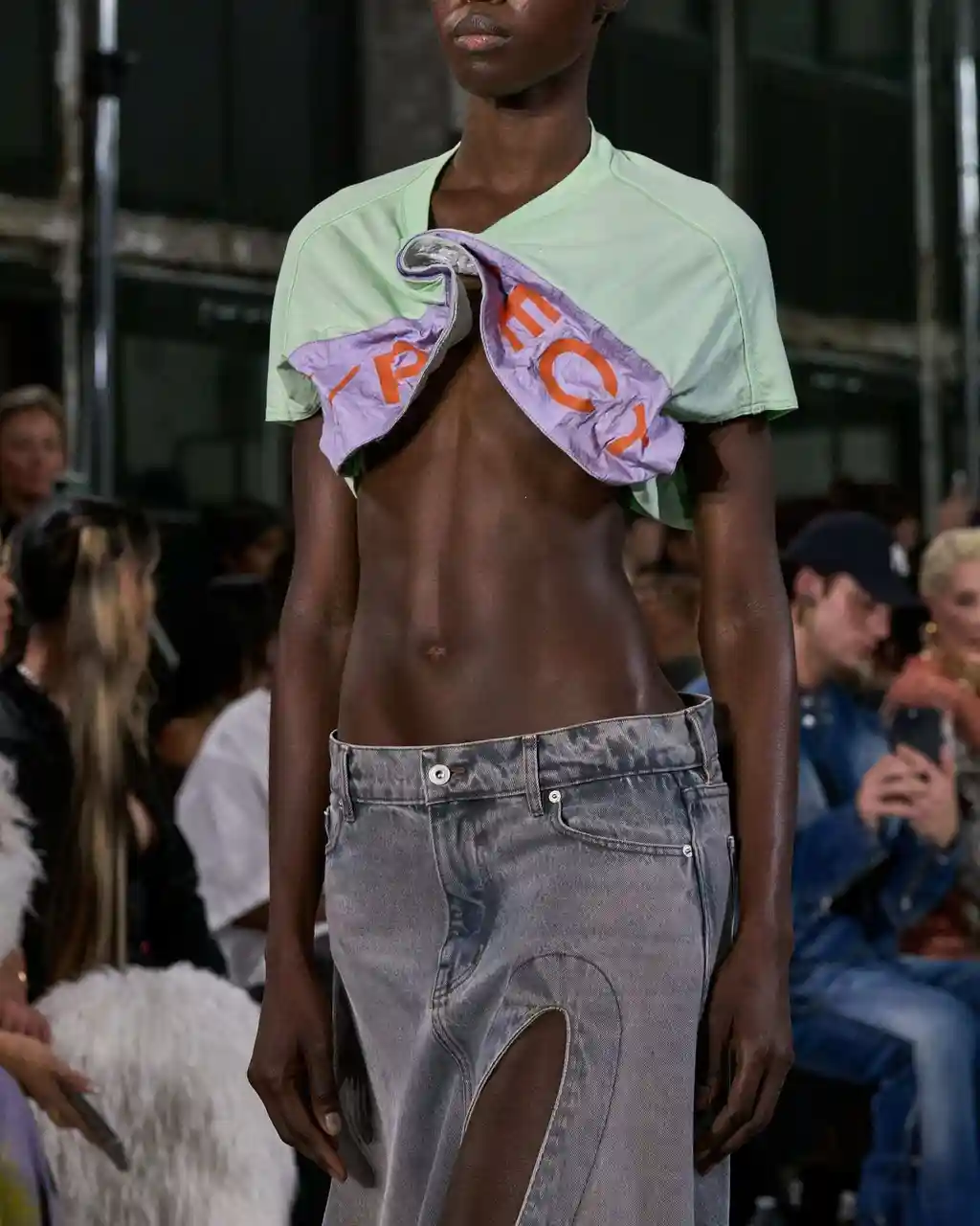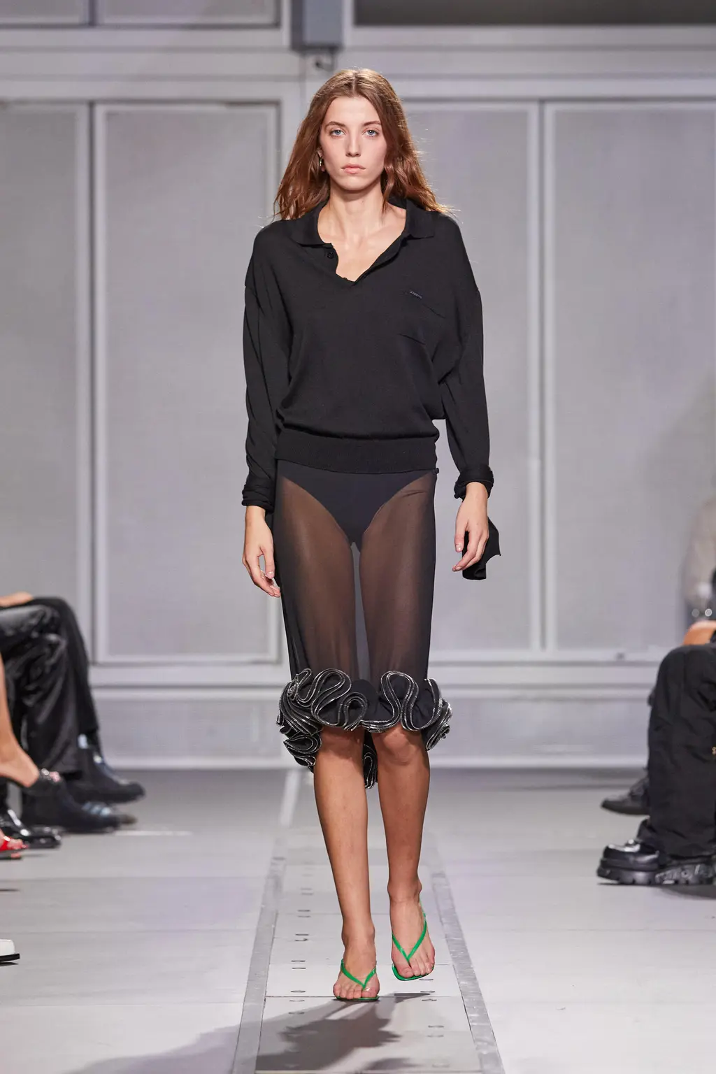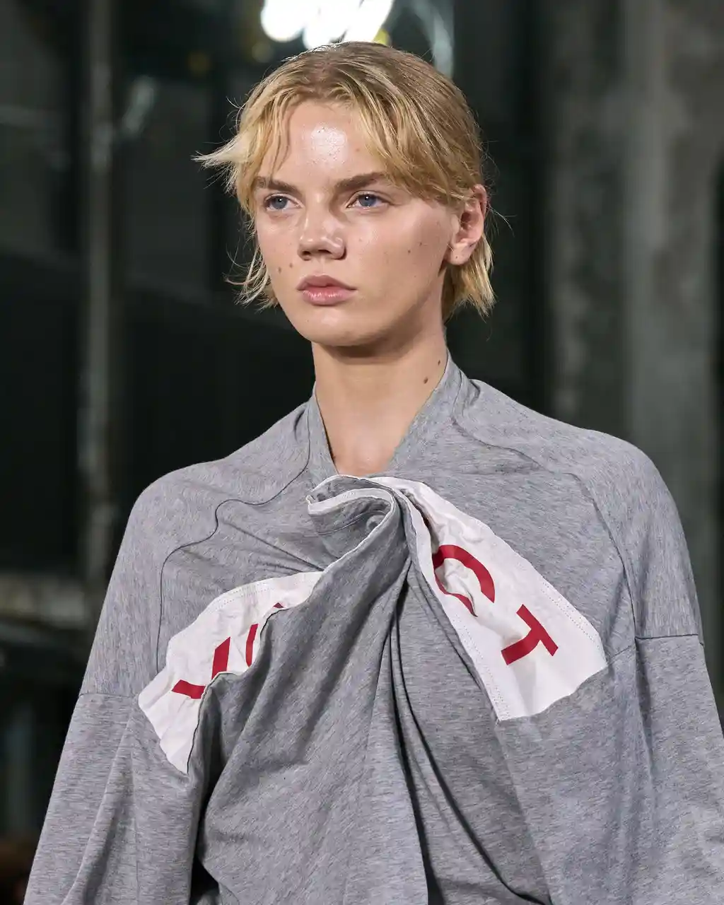 Paris may claim the title of the world’s fashion capital, but Belgium has produced some of the most celebrated fashion designers, from Martin Margiela to Raf Simons and, of course, the Antwerp Six. Glenn Martens grew up in Bruges, where he initially studied interior architecture, and this season he turned back to his hometown, drawing from its towering Gothic buildings as inspiration. The show opened with an imposing oversized hooded trench, featuring undone hook-and-eye details. Life-size snake necklaces curled across chests like breastplates. Shirts were intentionally scrunched up and logo T‑shirts came cropped and wildly twisted, paired with high-slit denim skirts. Hooded denim jackets engulfed the body while figure accentuating graphic dresses elongated silhouettes. There was a slow, almost funereal motion to the models’ walks, giving guests time to take in the details. “I really kind of envisioned it as Gothic towers in the middle of the Belgian fields,” Martens explained.