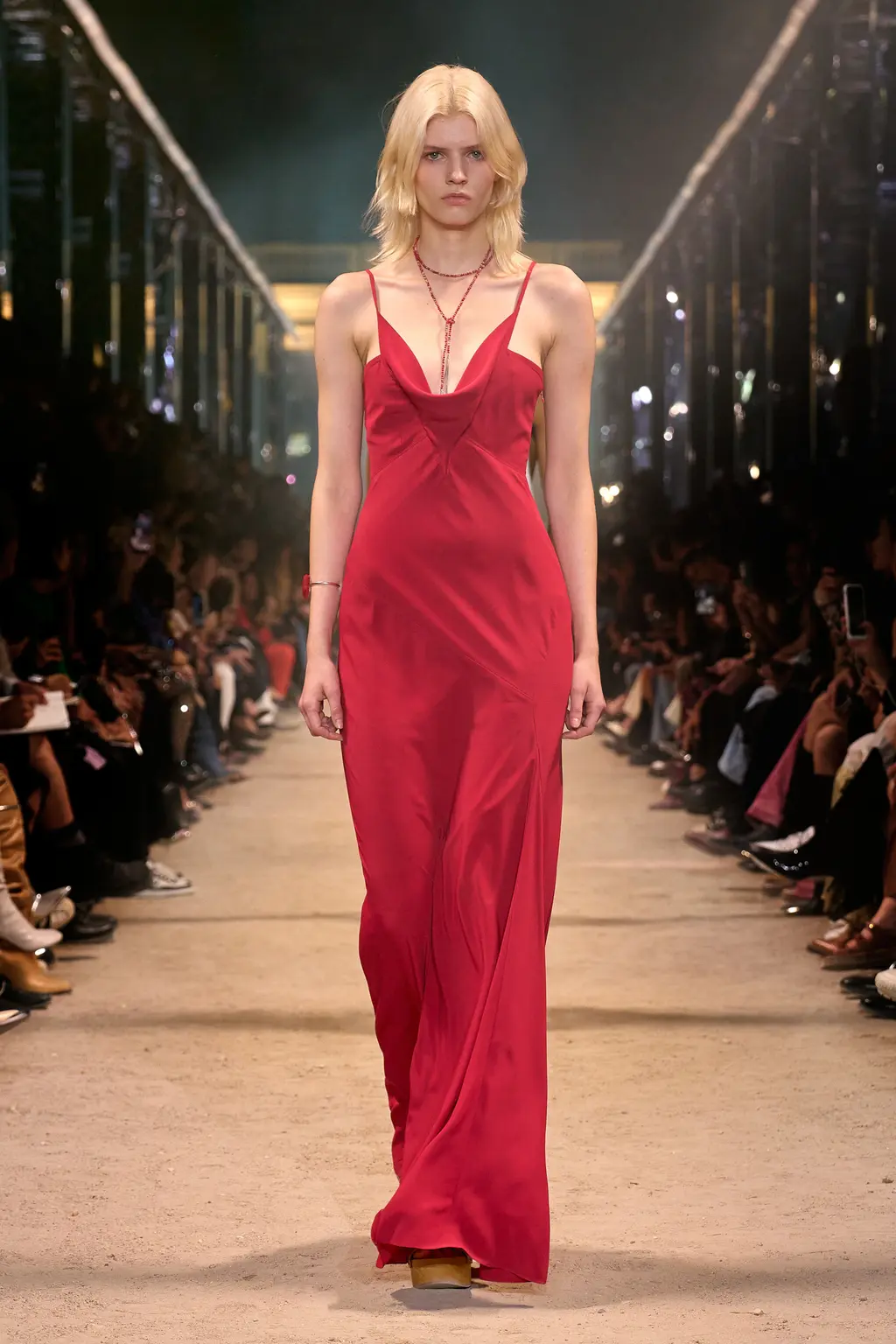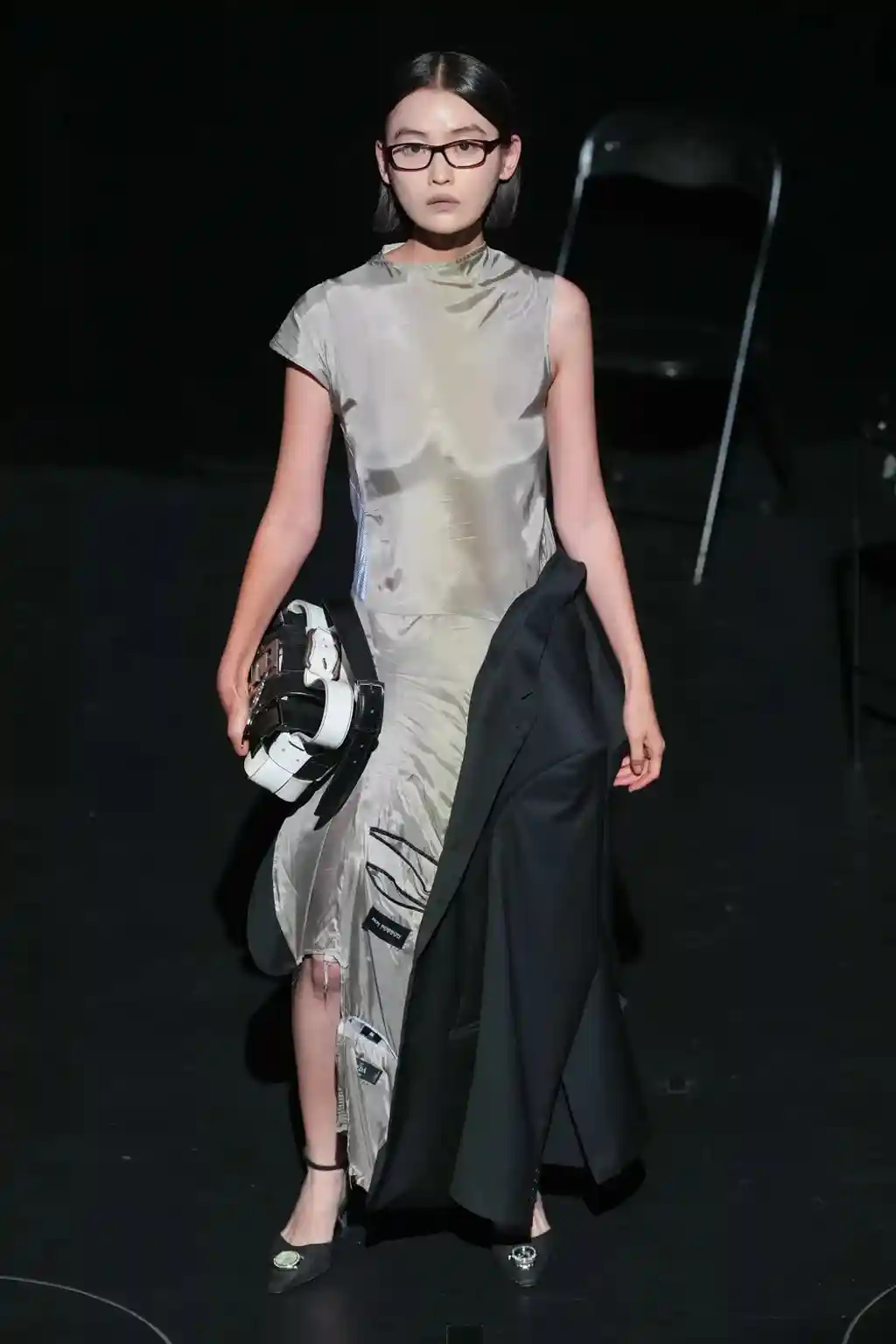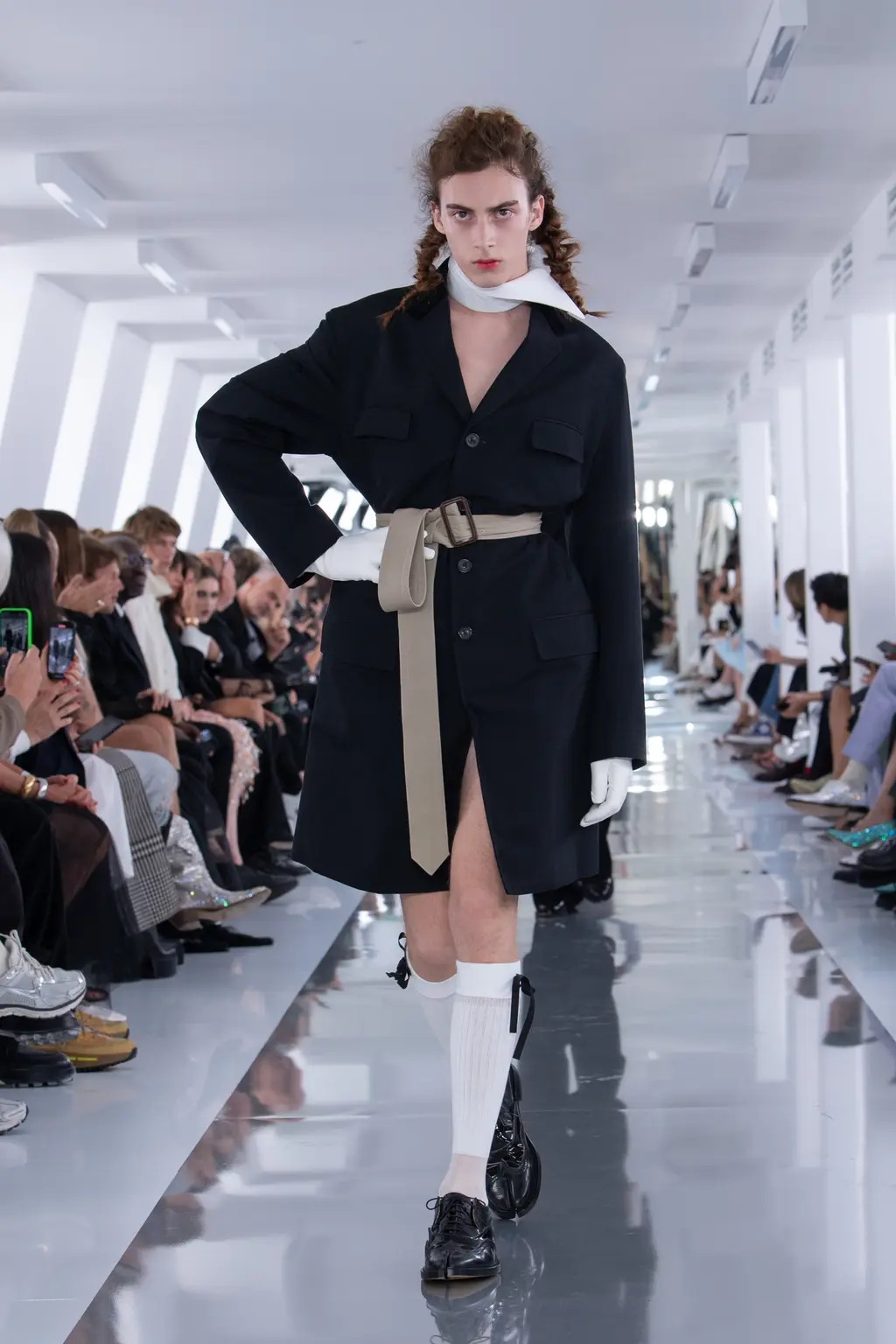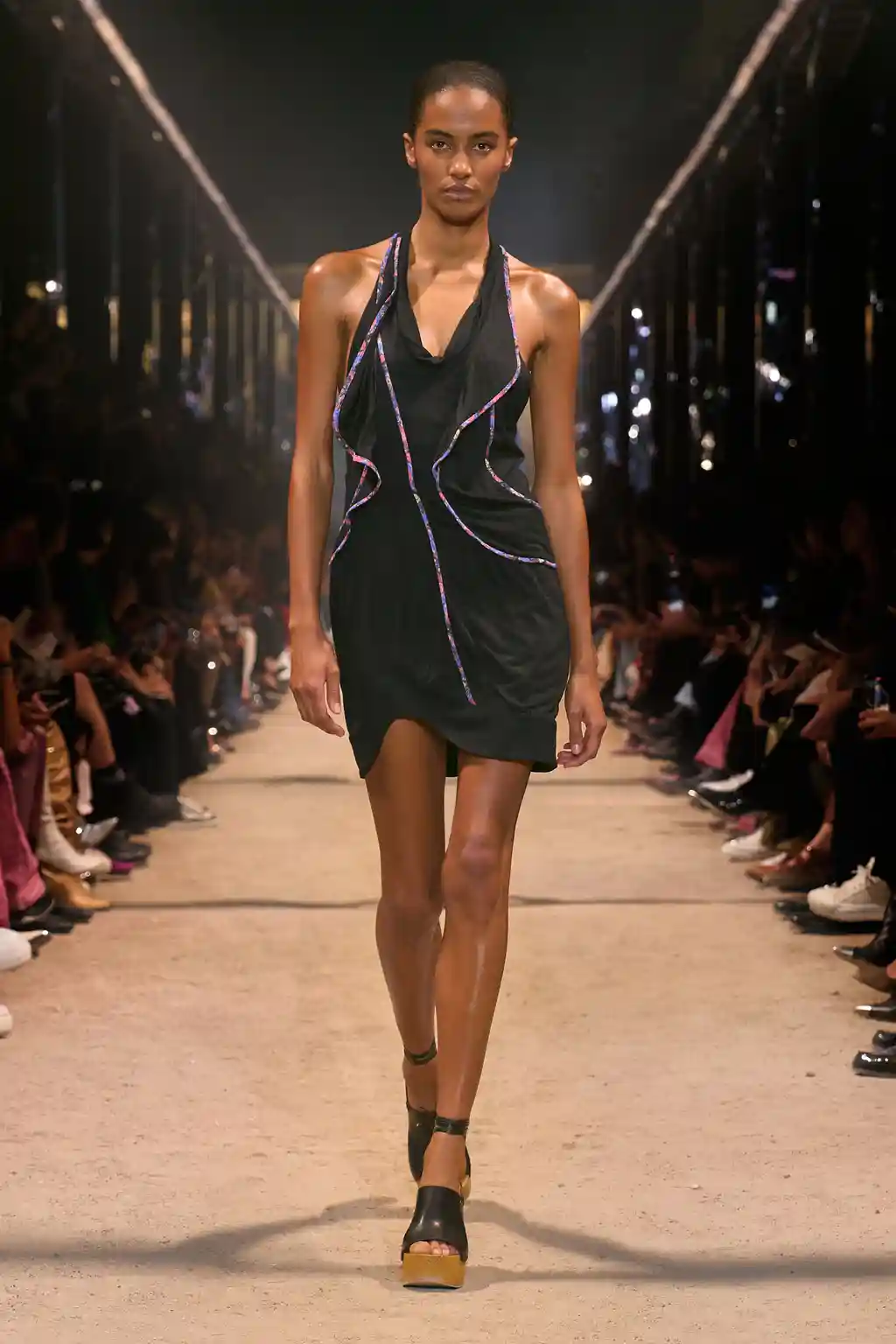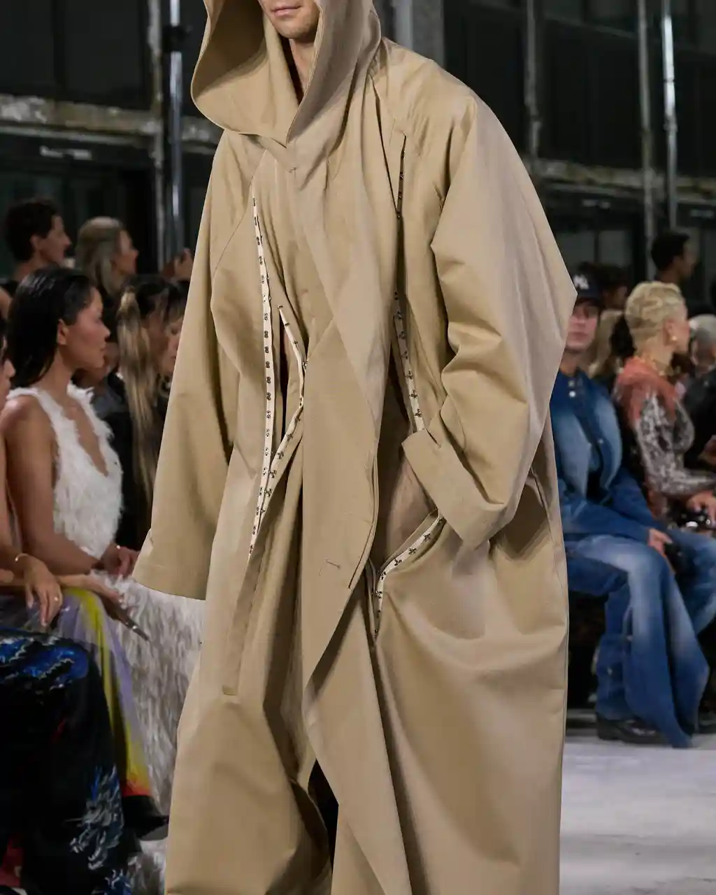 Paris may claim the title of the world’s fashion capital, but Belgium has produced some of the most celebrated fashion designers, from Martin Margiela to Raf Simons and, of course, the Antwerp Six. Glenn Martens grew up in Bruges, where he initially studied interior architecture, and this season he turned back to his hometown, drawing from its towering Gothic buildings as inspiration. The show opened with an imposing oversized hooded trench, featuring undone hook-and-eye details. Life-size snake necklaces curled across chests like breastplates. Shirts were intentionally scrunched up and logo T‑shirts came cropped and wildly twisted, paired with high-slit denim skirts. Hooded denim jackets engulfed the body while figure accentuating graphic dresses elongated silhouettes. There was a slow, almost funereal motion to the models’ walks, giving guests time to take in the details. “I really kind of envisioned it as Gothic towers in the middle of the Belgian fields,” Martens explained.