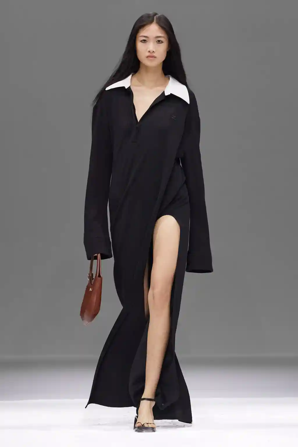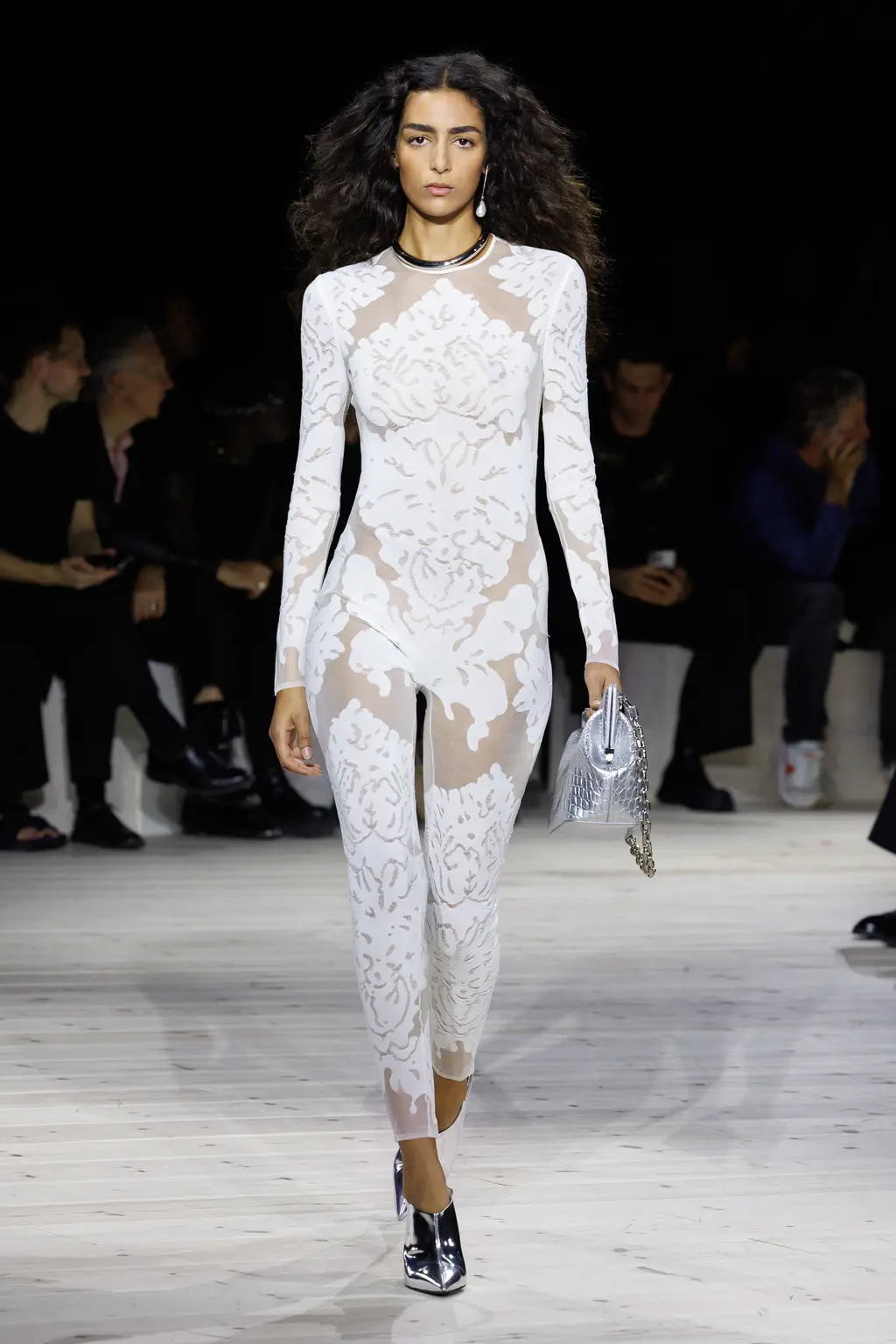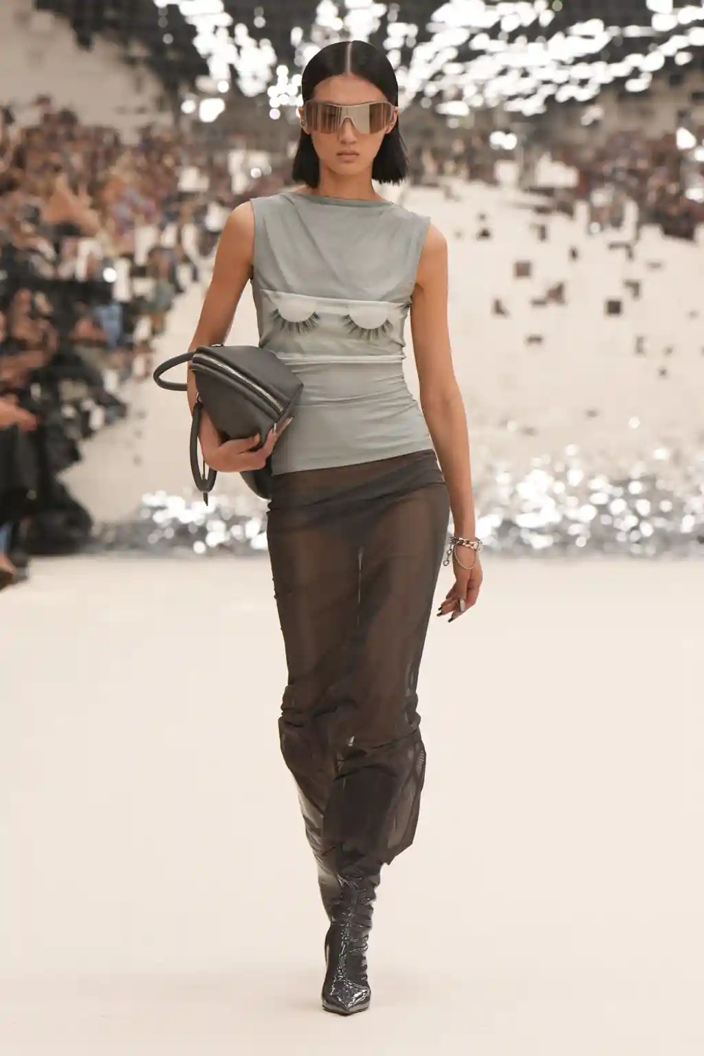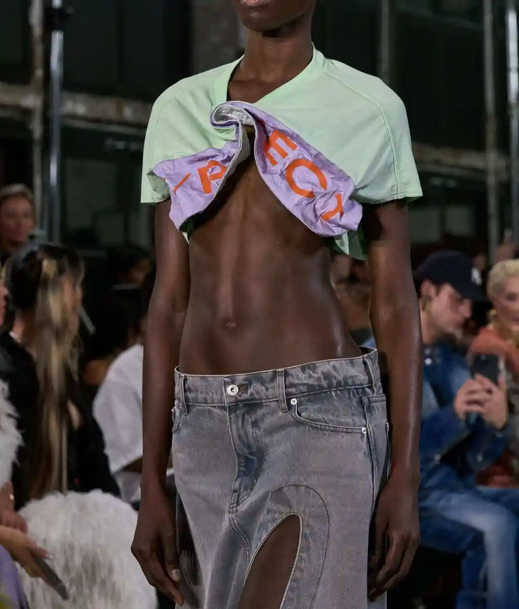 Paris may claim the title of the world’s fashion capital, but Belgium has produced some of the most celebrated fashion designers, from Martin Margiela to Raf Simons and, of course, the Antwerp Six. Glenn Martens grew up in Bruges, where he initially studied interior architecture, and this season he turned back to his hometown, drawing from its towering Gothic buildings as inspiration. The show opened with an imposing oversized hooded trench, featuring undone hook-and-eye details. Life-size snake necklaces curled across chests like breastplates. Shirts were intentionally scrunched up and logo T‑shirts came cropped and wildly twisted, paired with high-slit denim skirts. Hooded denim jackets engulfed the body while figure accentuating graphic dresses elongated silhouettes. There was a slow, almost funereal motion to the models’ walks, giving guests time to take in the details. “I really kind of envisioned it as Gothic towers in the middle of the Belgian fields,” Martens explained.