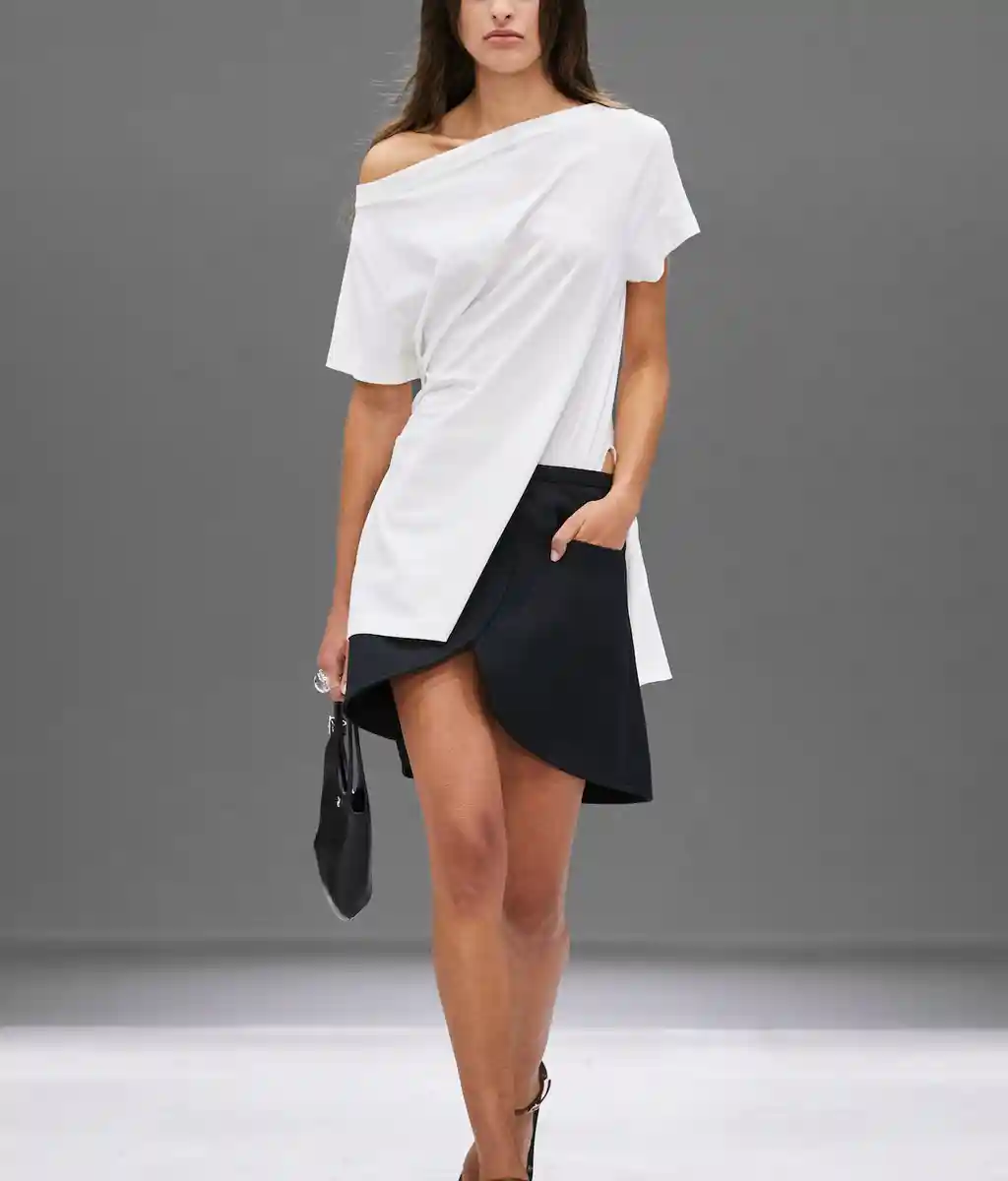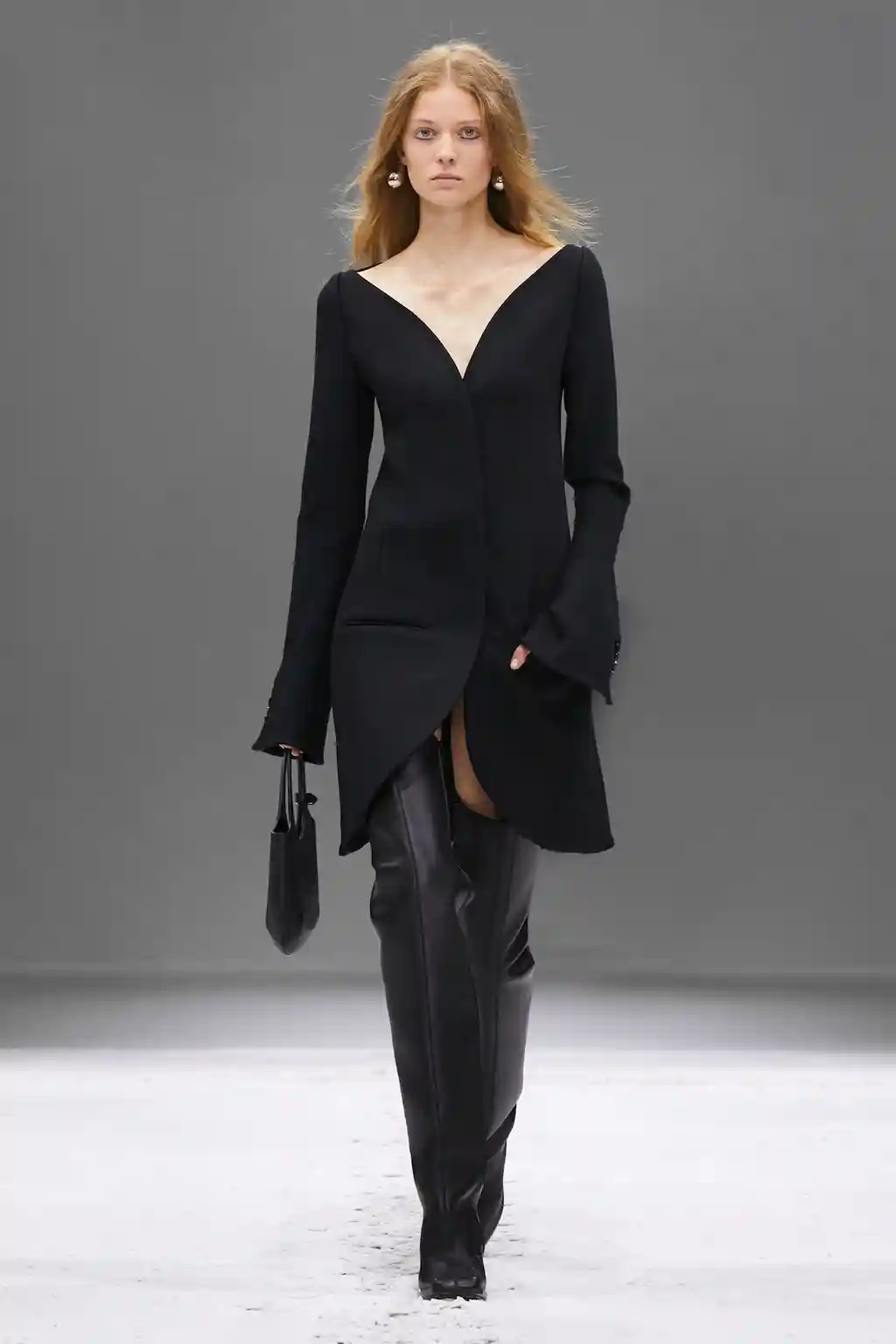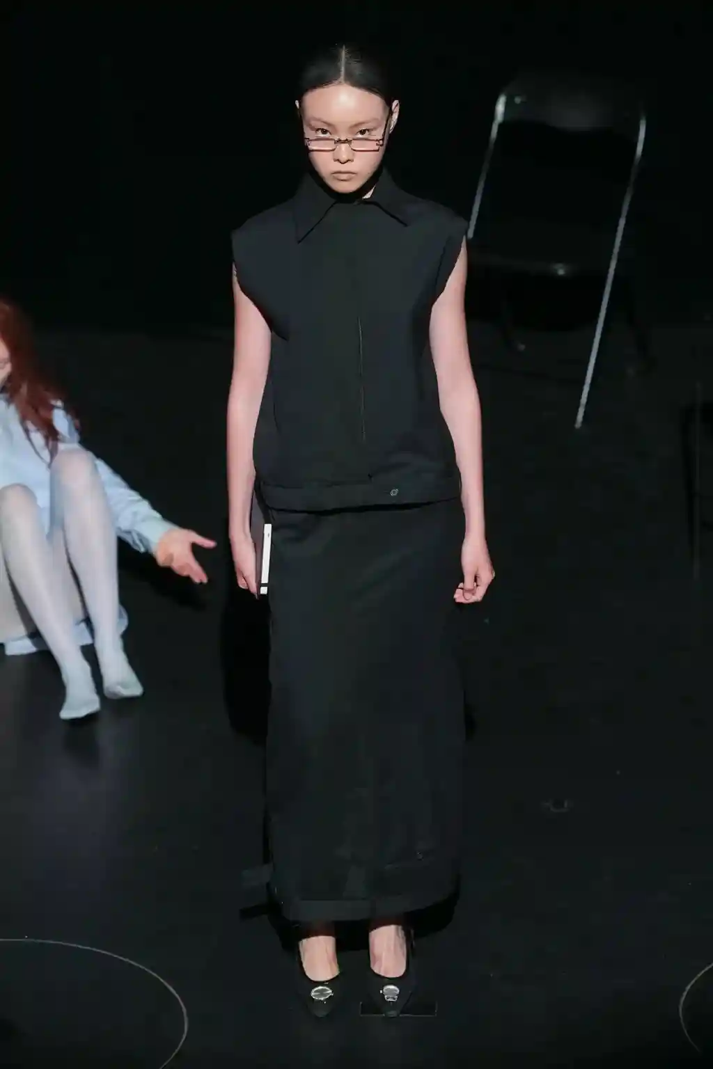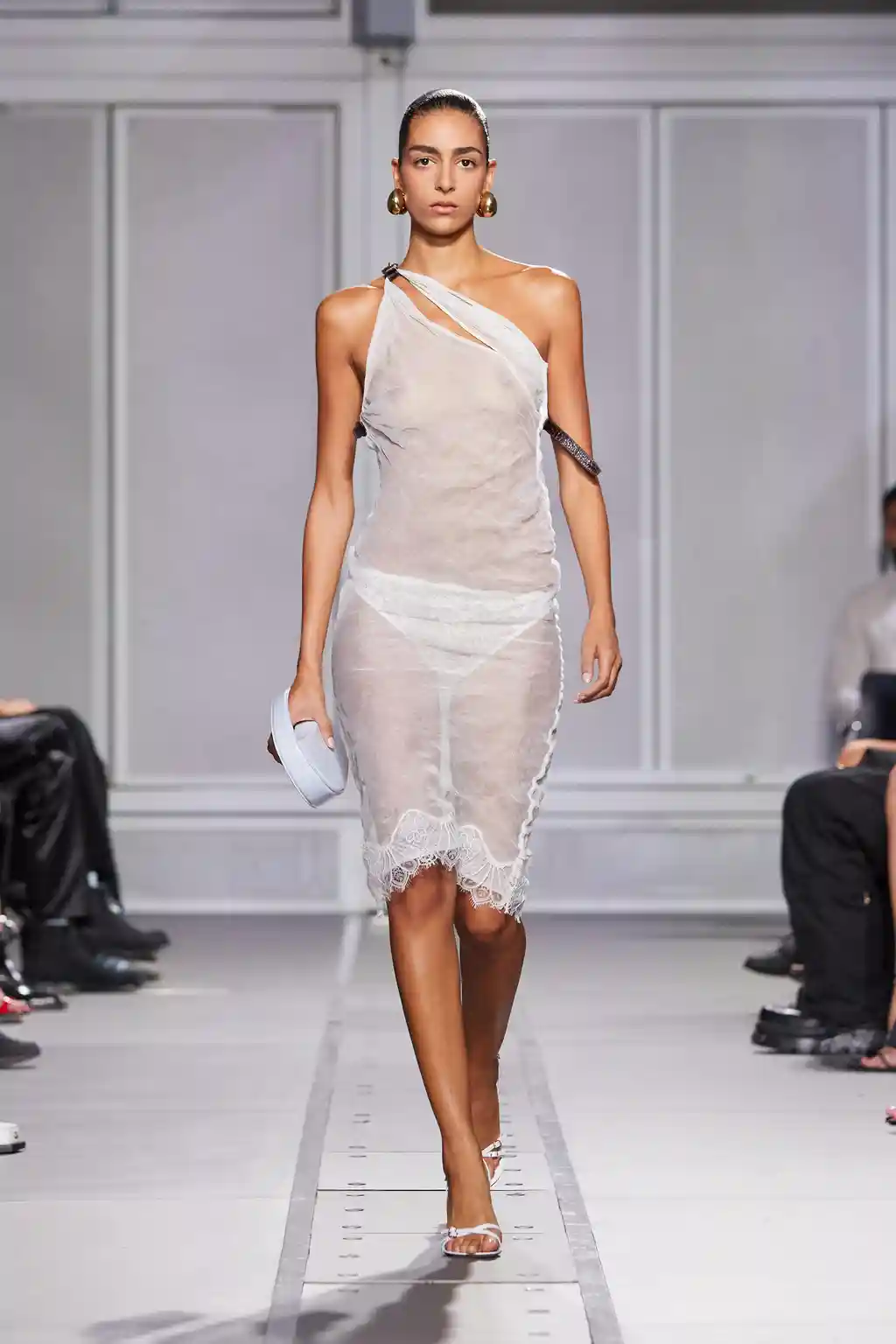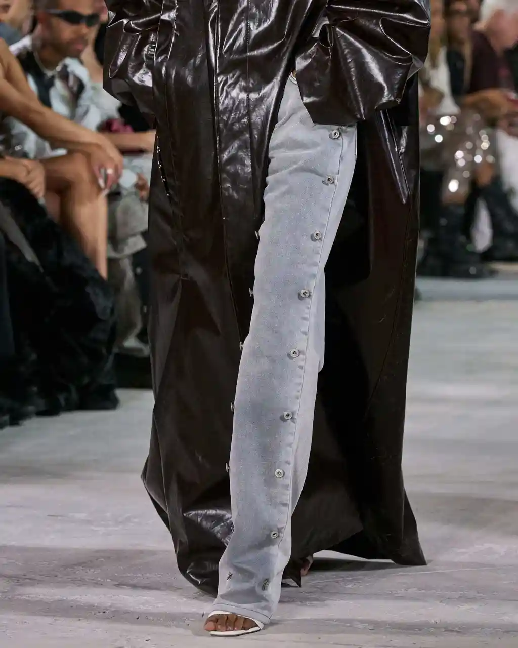 Paris may claim the title of the world’s fashion capital, but Belgium has produced some of the most celebrated fashion designers, from Martin Margiela to Raf Simons and, of course, the Antwerp Six. Glenn Martens grew up in Bruges, where he initially studied interior architecture, and this season he turned back to his hometown, drawing from its towering Gothic buildings as inspiration. The show opened with an imposing oversized hooded trench, featuring undone hook-and-eye details. Life-size snake necklaces curled across chests like breastplates. Shirts were intentionally scrunched up and logo T‑shirts came cropped and wildly twisted, paired with high-slit denim skirts. Hooded denim jackets engulfed the body while figure accentuating graphic dresses elongated silhouettes. There was a slow, almost funereal motion to the models’ walks, giving guests time to take in the details. “I really kind of envisioned it as Gothic towers in the middle of the Belgian fields,” Martens explained.