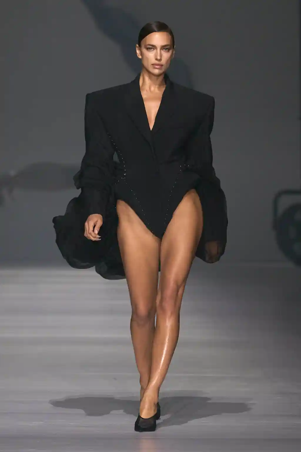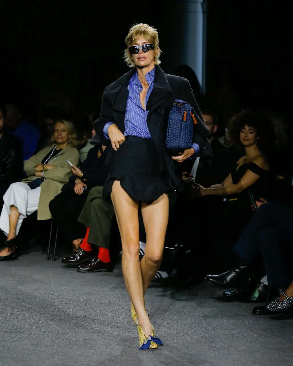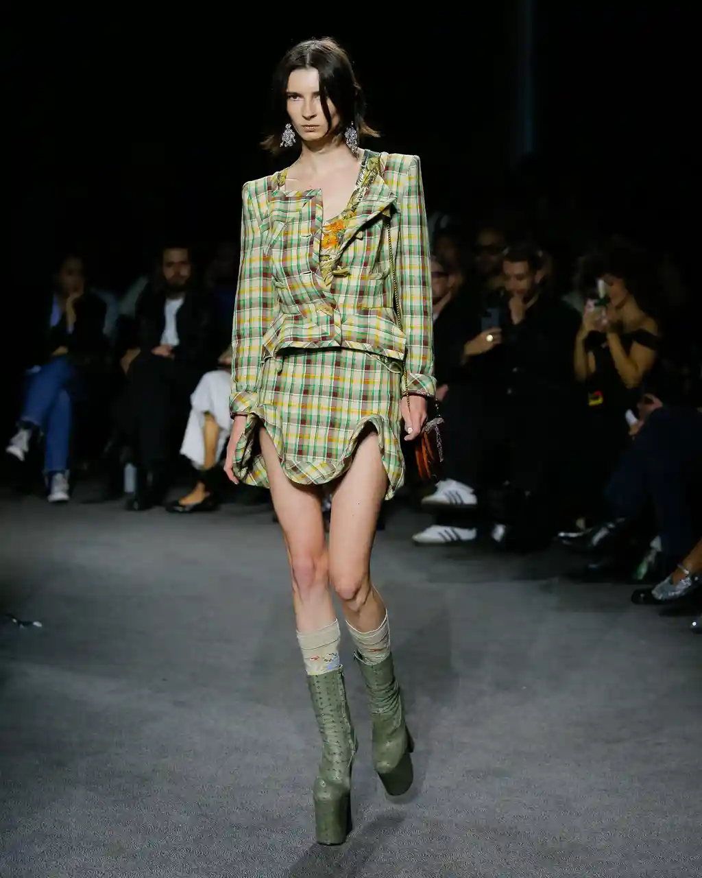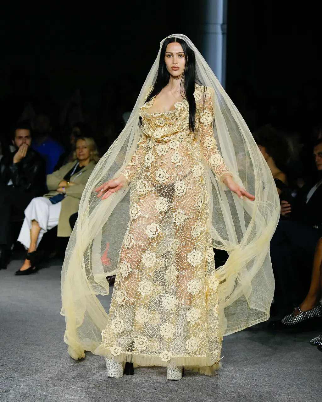 It felt like a greatest hits romp through Vivienne Westwood history: the plaid, the platforms, the punk of it all. But don’t call it a retrospective – according to Andreas, it’s a survey. There was ripped knitwear, capes, satin trousers and angular New Romantic tailoring. The opening look riffed on a rumpled suit from 2004 that Westwood wore day-to-day for almost two decades. Black sunglasses and red lipstick stains atop a ghostly hooded cape that covered the model’s face spooked the front row. The showstopper came in the form of a yellow crocheted gown and sky-high platforms worn by Amelia Gray and matrimonial crinoline gowns, like the one Westwood once wore to the opera, closed the show in style as seen on Irina Shayk and Westwood’s granddaughter Cora Corré. Overall, the collection was a fitting celebration of the designer’s broad intellectual curiosity and a testament to her radical personal style.