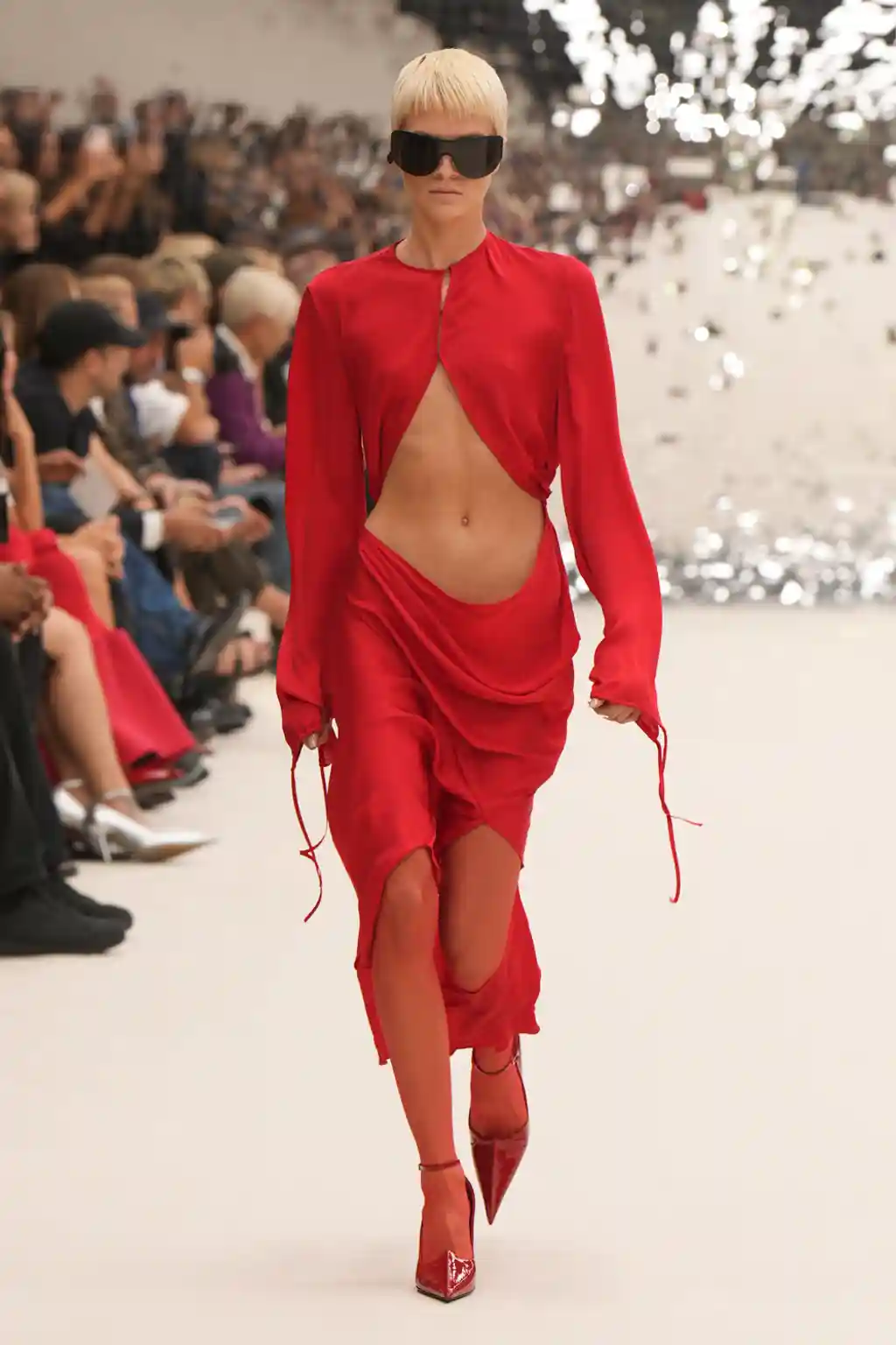 A golden thread ran through the collection, literally, as skirts and dresses were finished with iridescent embroidery that bounced as it caught the light. There was red thread, too, splashed across tailored garments like arteries. A crystal-encrusted bodysuit is sure to make its way into a pop star’s tour wardrobe. Meanwhile, red rose motifs found new definition through sculptural, flowering dresses folded like petals – or vulvas.