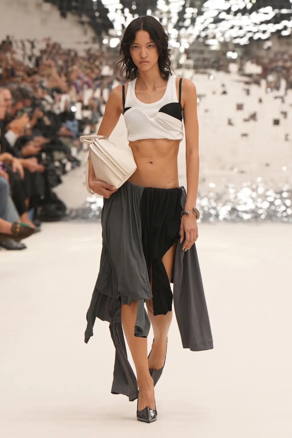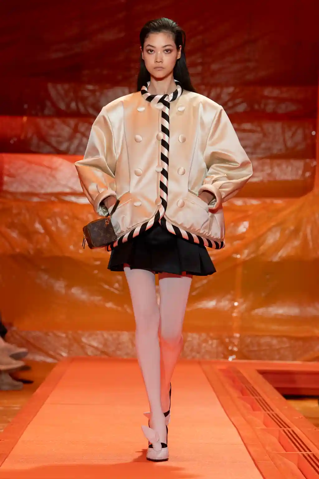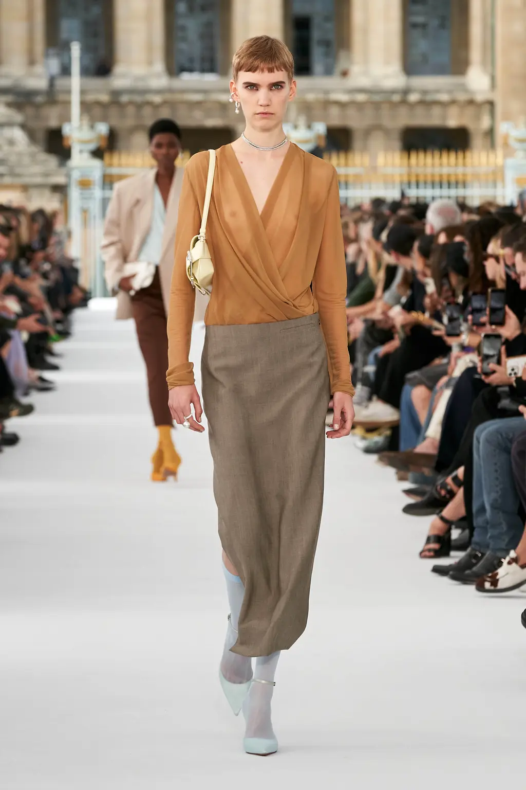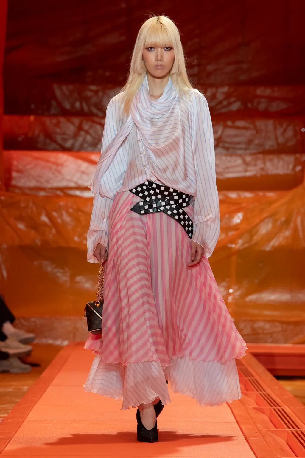 For his latest collection, Nicolas Ghesquière drew inspiration from travel. Louis Vuitton started in the mid 19th-century as a luggage brand, after all. The clothes were summery and light, with the first few looks featuring long flowing skirts worn with silk shirts and bomber jackets. For the most part, waists were low and chunky hip-slung belts cinched double-layer mousseline skirts, leather trousers and jeans. Thick pleated miniskirts in leather and satin were worn with balletcore white tights and roomy double-breasted jackets. Elsewhere, there were draped off-the-shoulder tops worn with ultra-high waisted trousers, held up by braces. There was a weird and wonderful curiosity here, one that evokes a desire to take flight, broaden our horizons and explore far away shores.