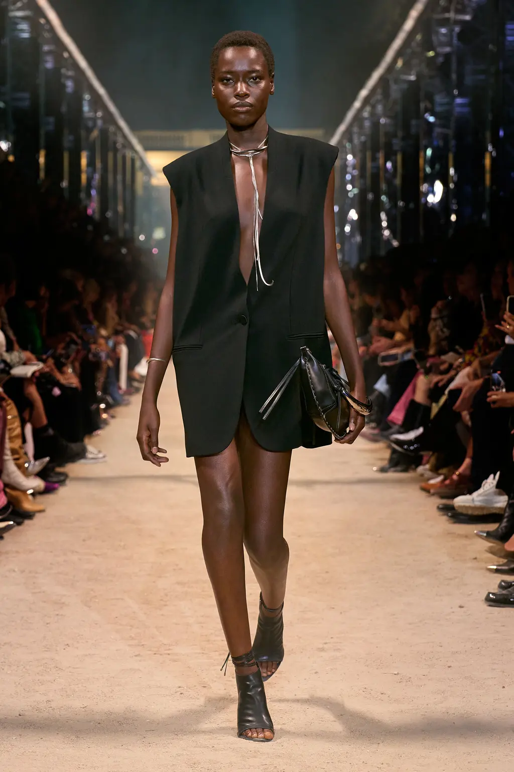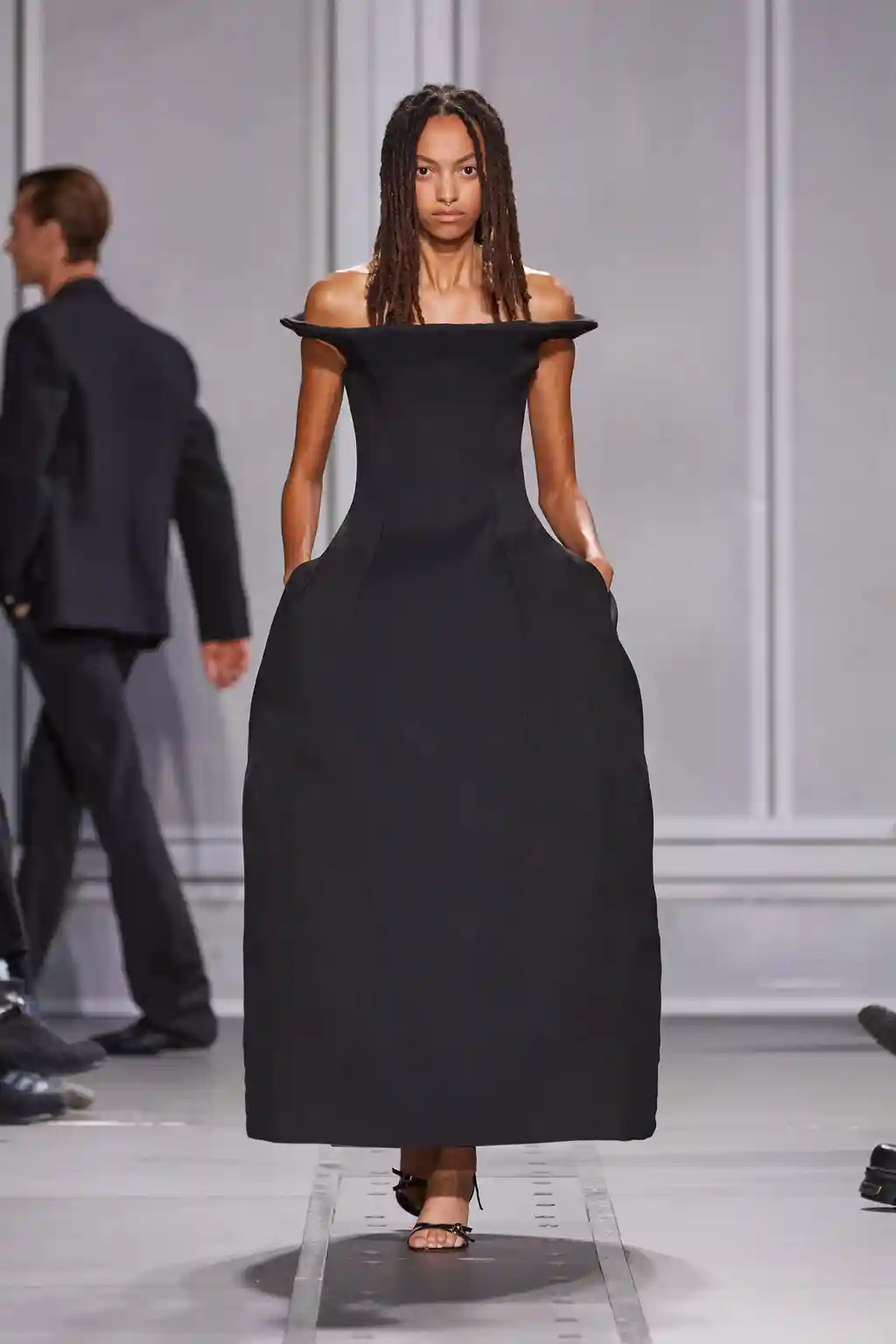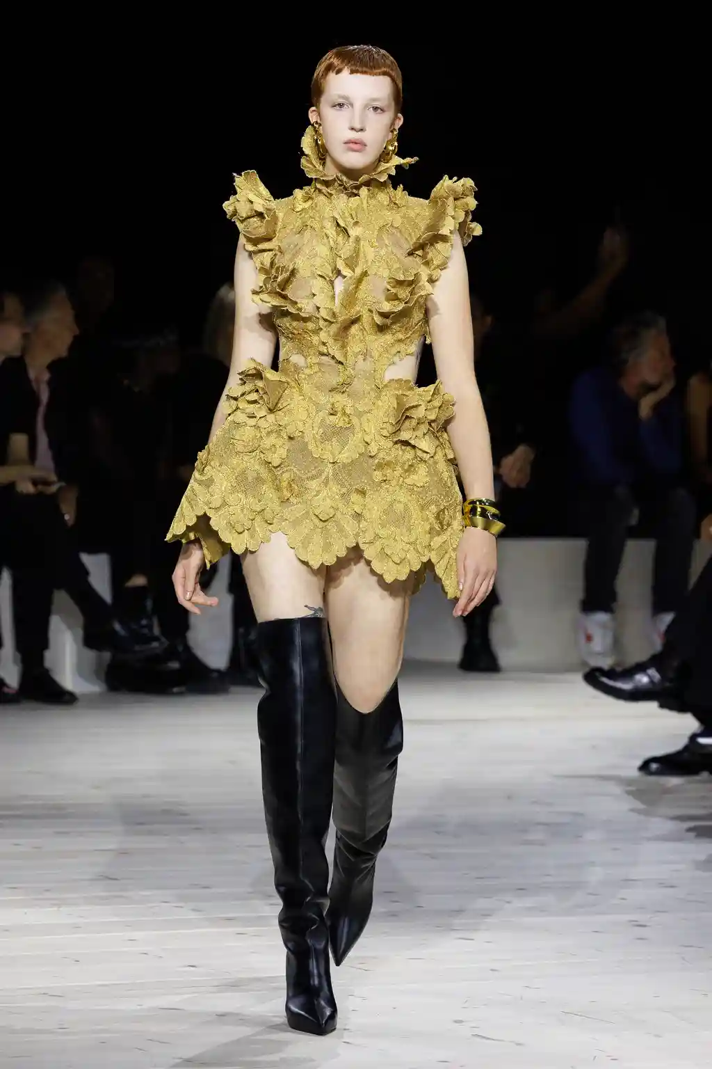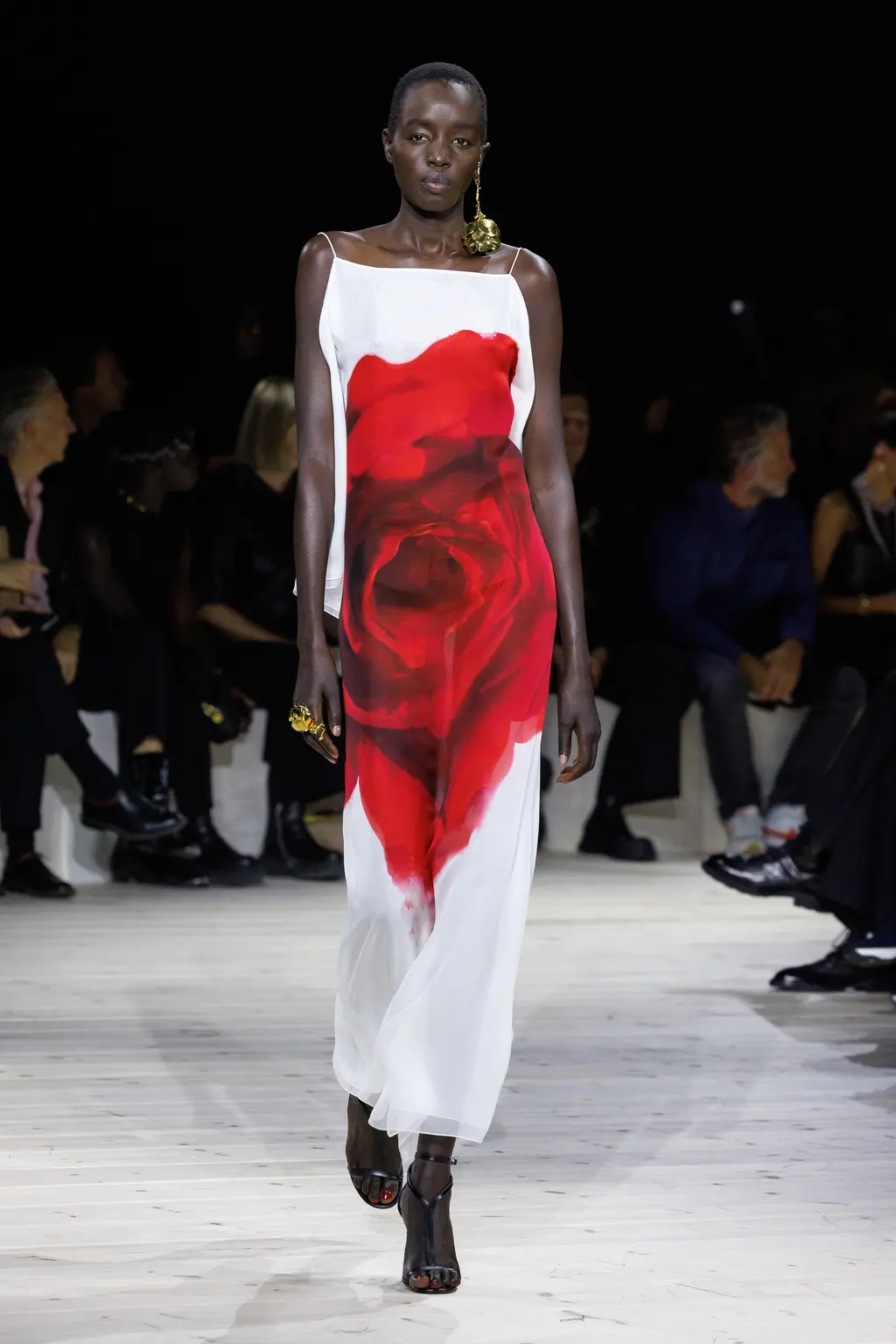 Kaia Gerber opened the show in a short black tailored dress with an opening at the bodice, directly referencing McQueen’s 1996 collection The Hunger. Romance is often at the heart of a McQueen collection under Burton’s hand. This season was a tribute to “female anatomy, Queen Elizabeth I, the blood rose, and Magdalena Abakanowicz, a transgressive and powerful artist”. The result is a story of England and feminine power told through clothes that find beauty in motion.