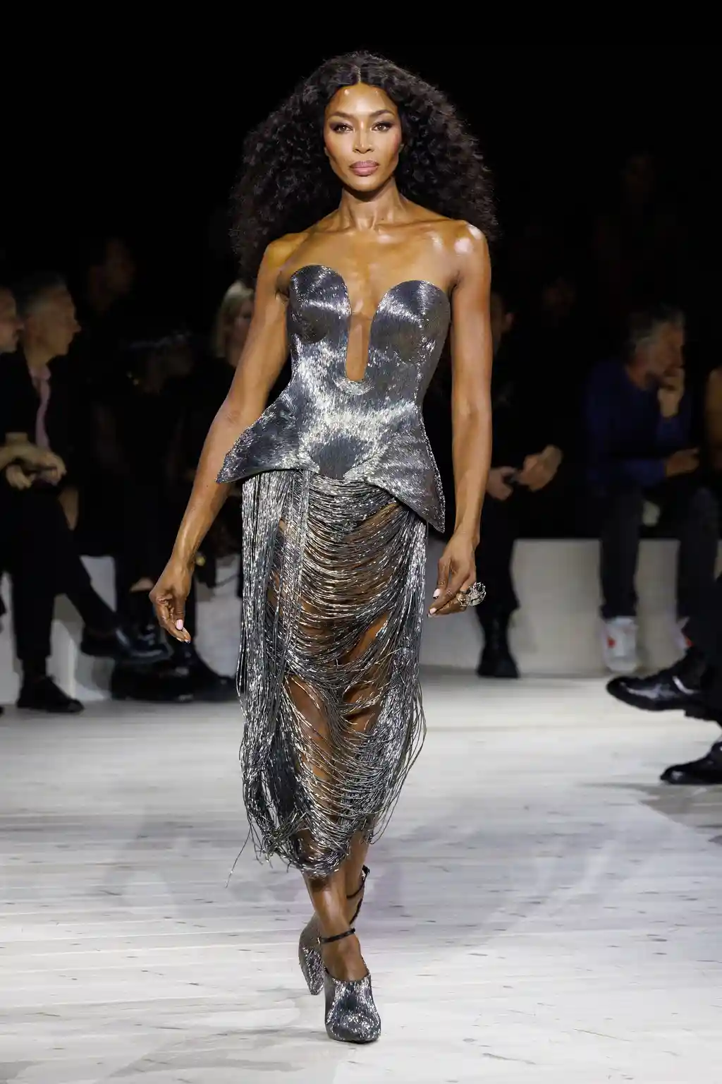 Naomi Campbell wiped tears from her eyes as she closed the show in a dress made from shimmering silver thread. Then Sarah Burton walked the full loop of the runway to applause, whistles and a standing ovation as David Bowie’s Heroes played. She stopped to hug friends and supporters on the front row, including Cate Blanchett, Elle Fanning, Cathy Horyn and Anna Wintour.