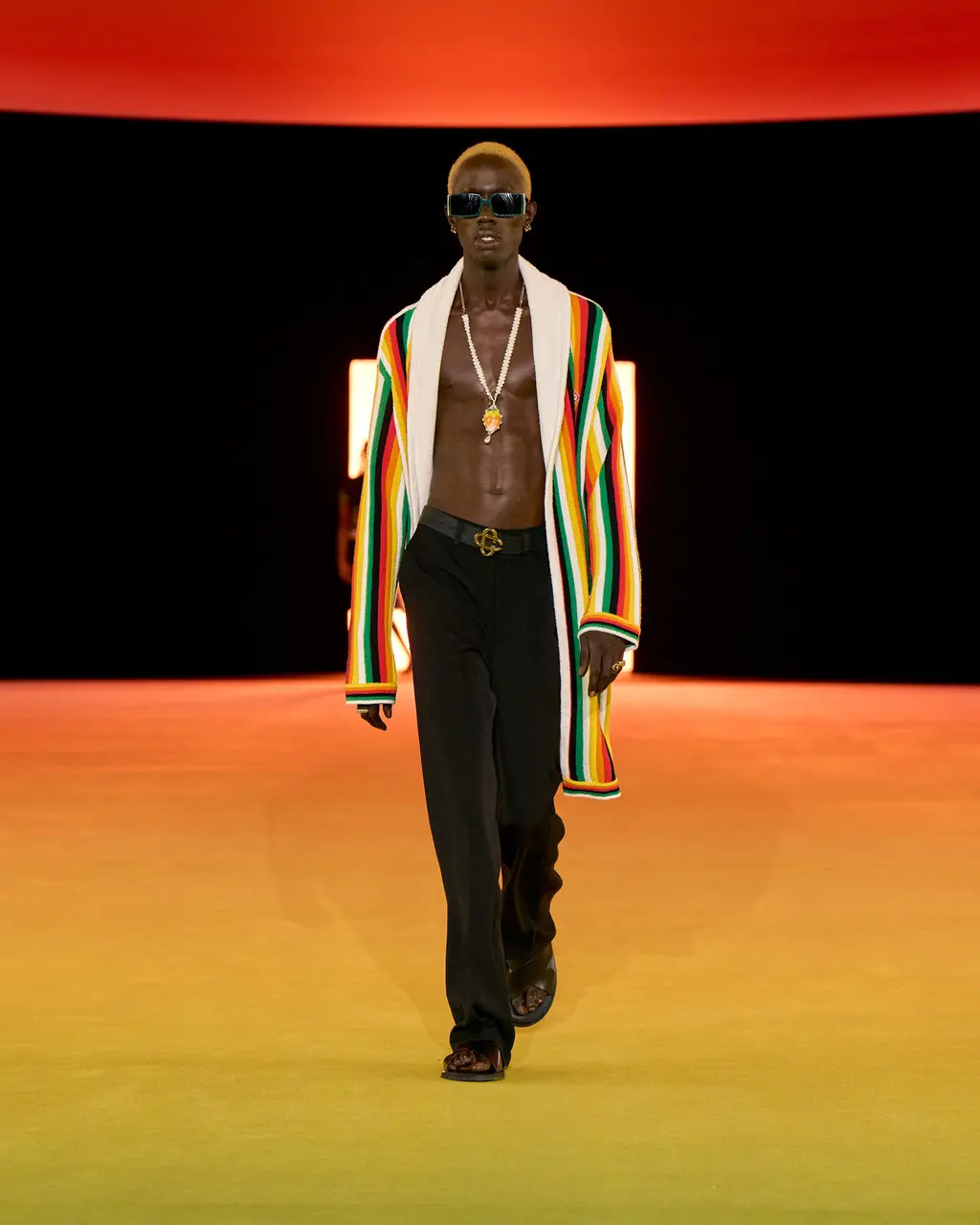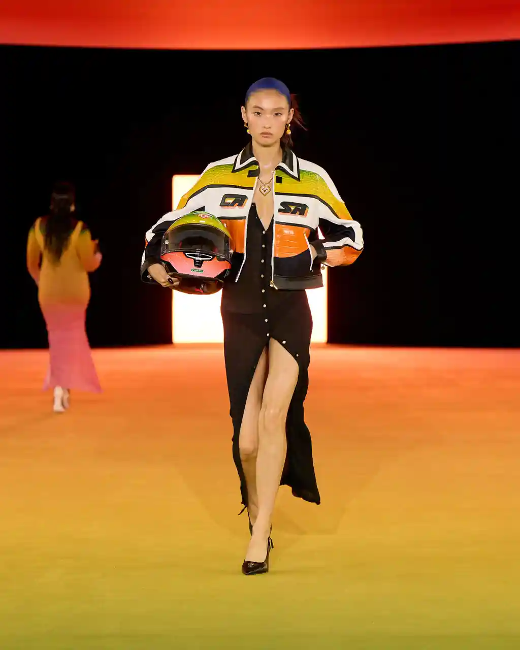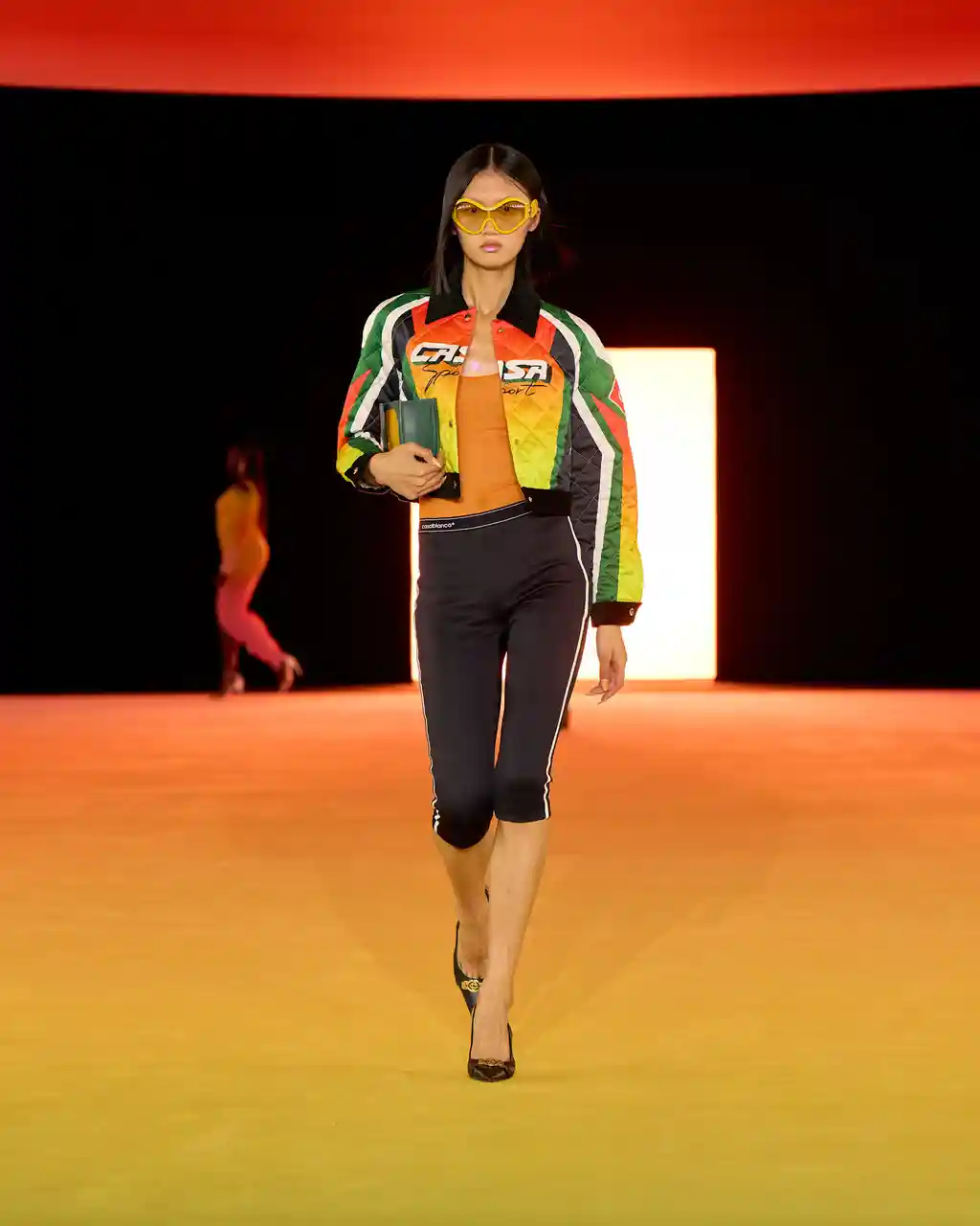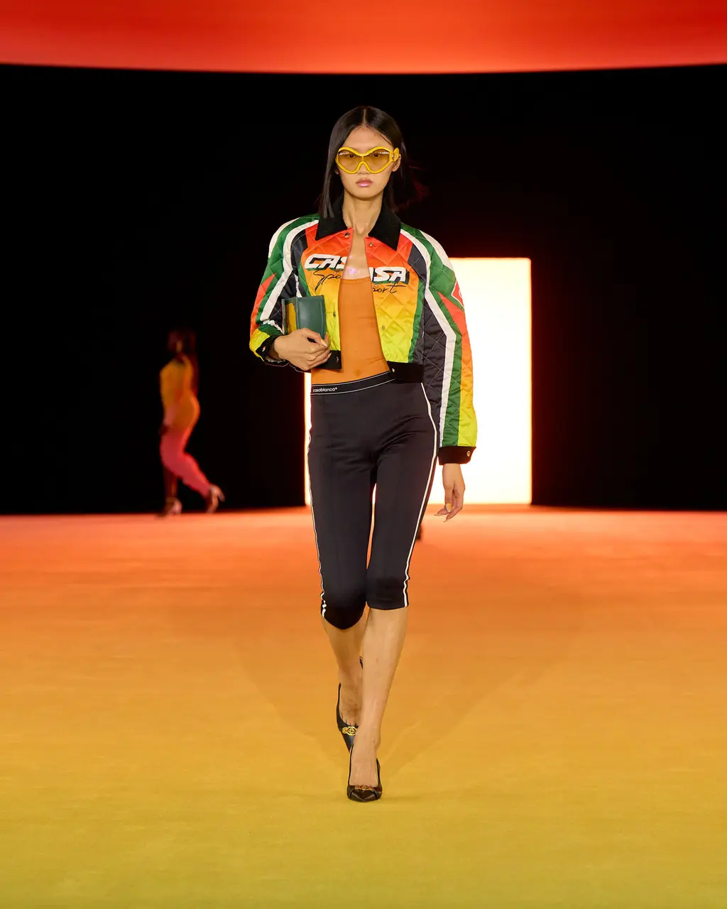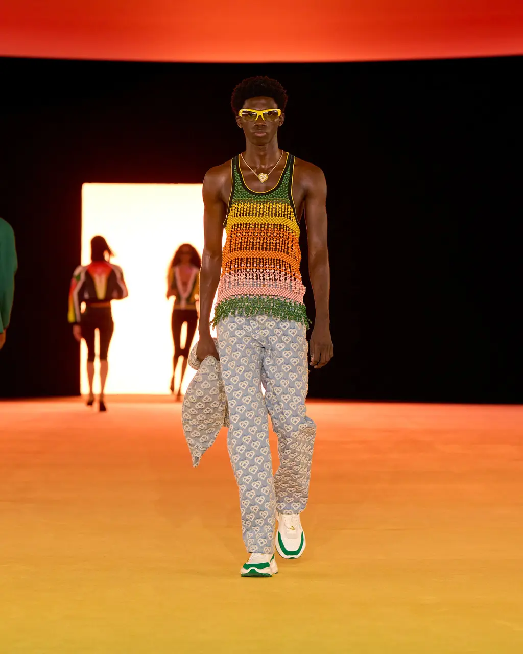Sleek and sporty, Casablanca’s SS24 collection was influenced by time that Charaf Tajer and his team recently spent in Lagos getting inspired by the city’s energy. From this starting point, they introduced sunset hued garments evoking dynamic summer days. These gave way to sport silhouettes like second skin tops and skintight leggings and jumpsuits. Some models carried motorcycle helmets to accessorise their hoodies and moto jackets while others held beach towels under their arms. Denim co-ords and sporty bomber jackets depicted tennis players using a colourful Post-Impressionist style and intricate beading was woven into vest tops and mini skirts. These are clothes to take you from the tennis court, to the beach, to bars to drink rum cocktails and take in the sunset.