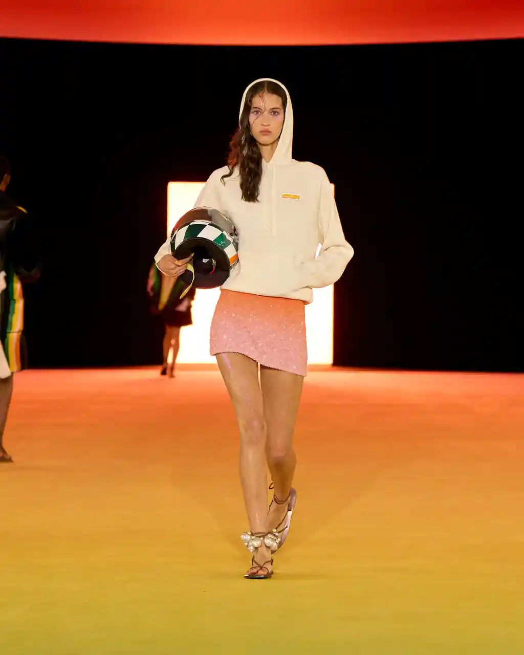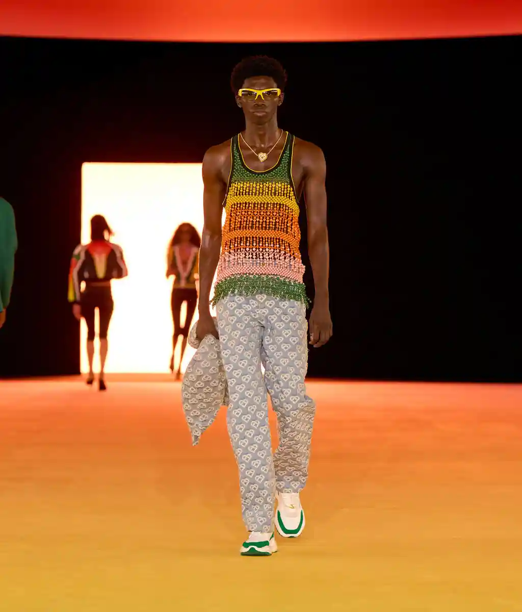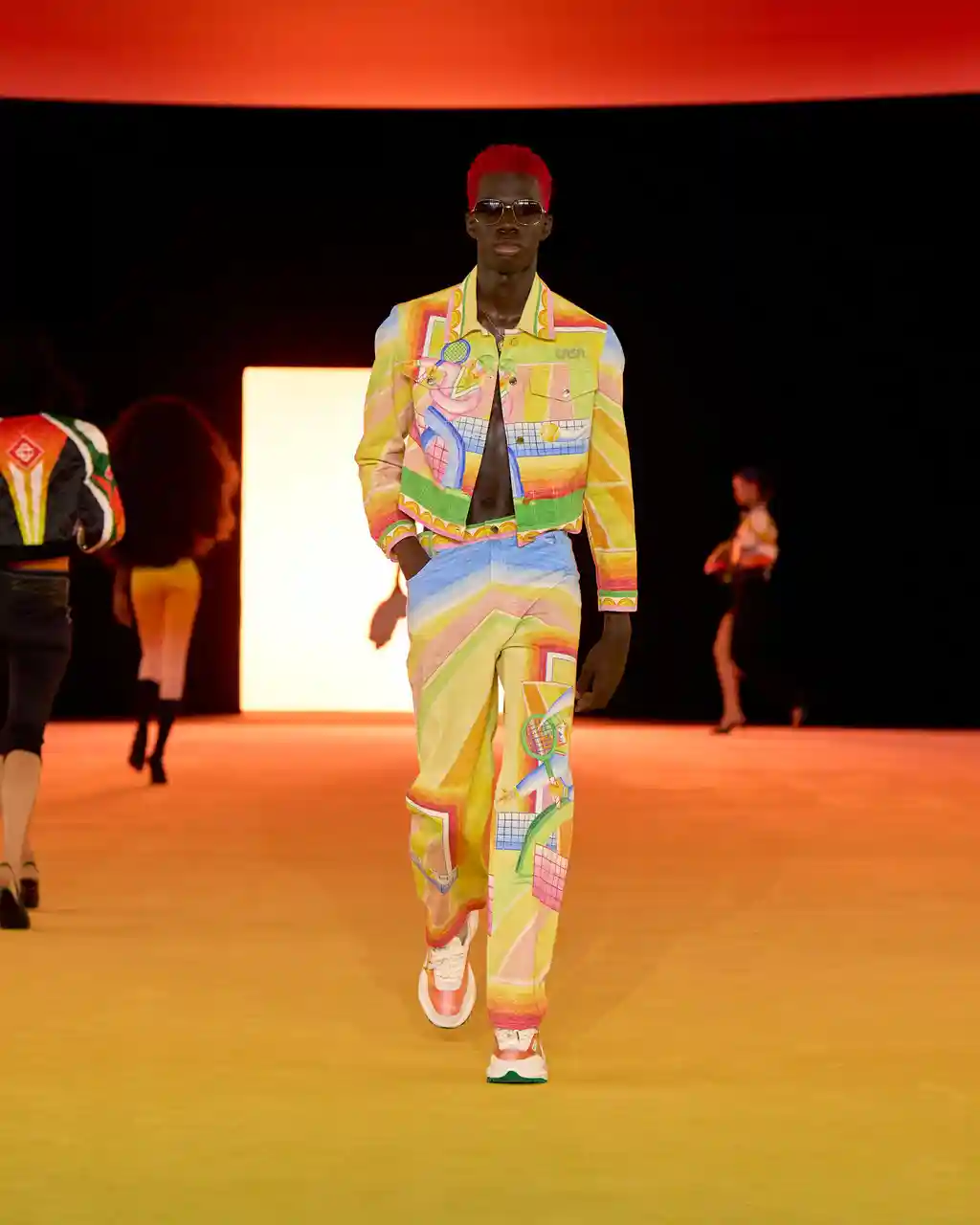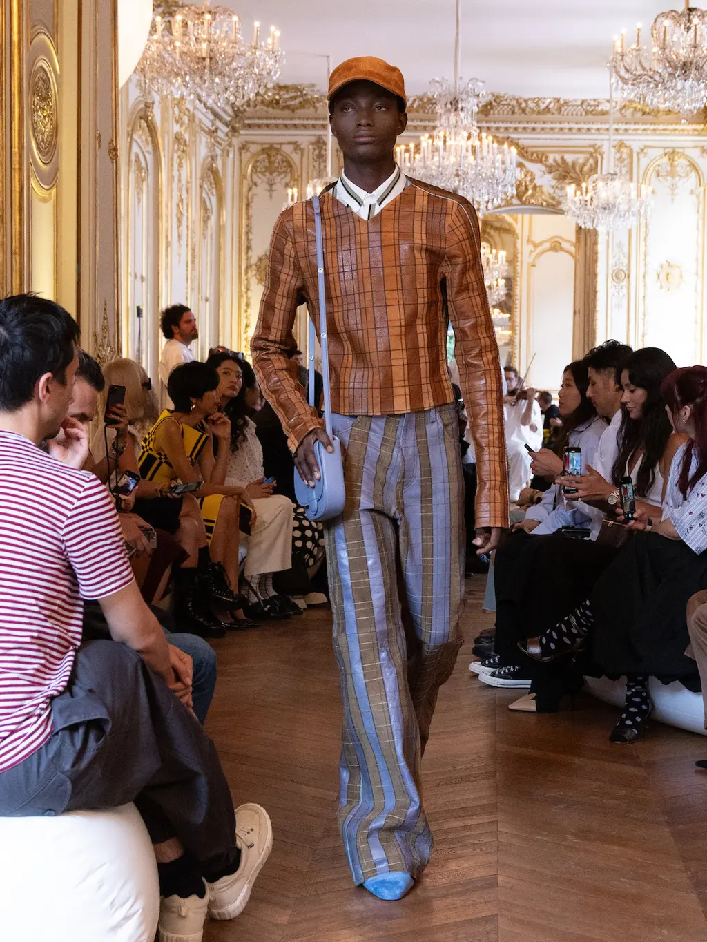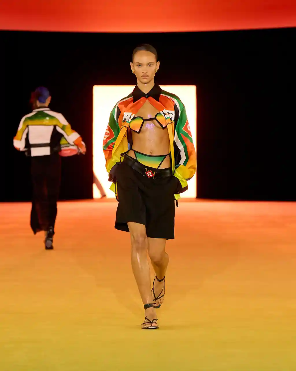 Sleek and sporty, Casablanca’s SS24 collection was influenced by time that Charaf Tajer and his team recently spent in Lagos getting inspired by the city’s energy. From this starting point, they introduced sunset hued garments evoking dynamic summer days. These gave way to sport silhouettes like second skin tops and skintight leggings and jumpsuits. Some models carried motorcycle helmets to accessorise their hoodies and moto jackets while others held beach towels under their arms. Denim co-ords and sporty bomber jackets depicted tennis players using a colourful Post-Impressionist style and intricate beading was woven into vest tops and mini skirts. These are clothes to take you from the tennis court, to the beach, to bars to drink rum cocktails and take in the sunset.