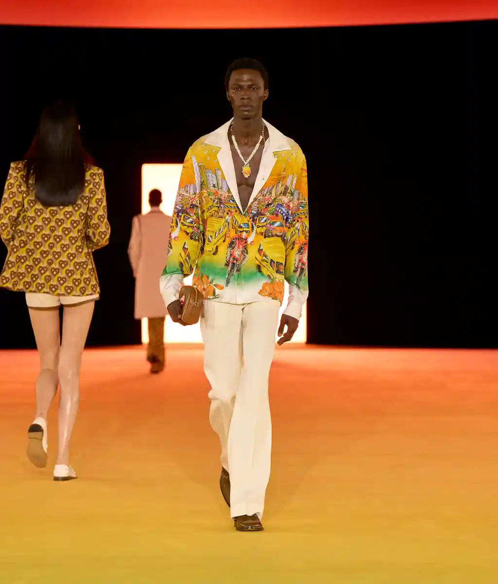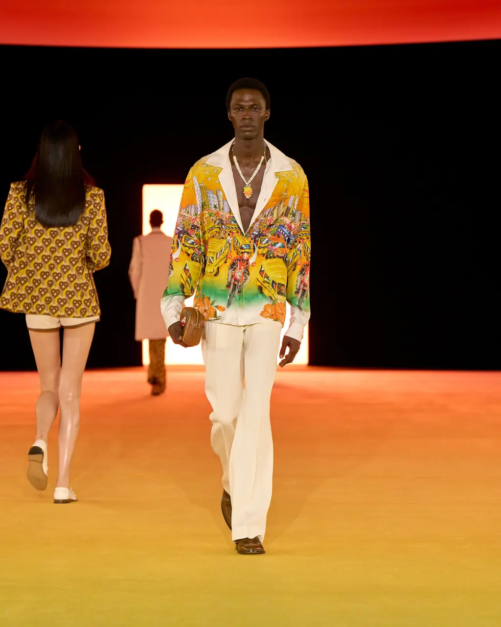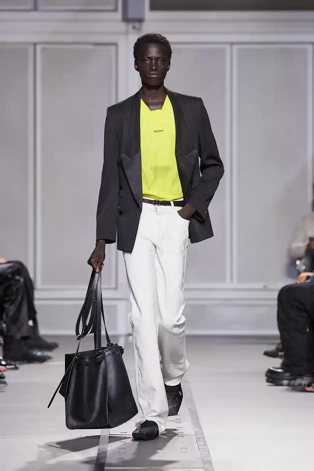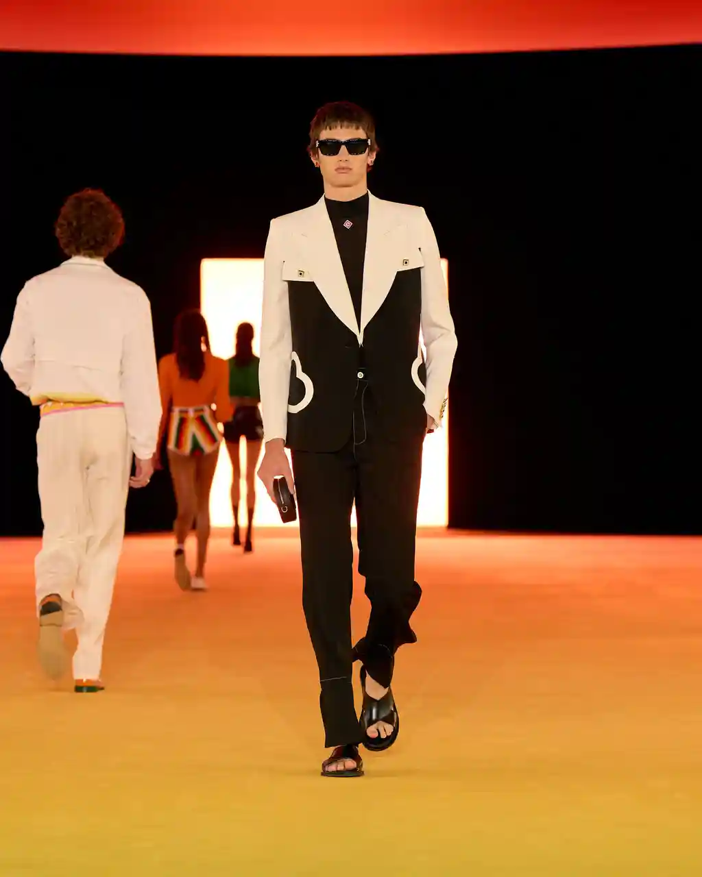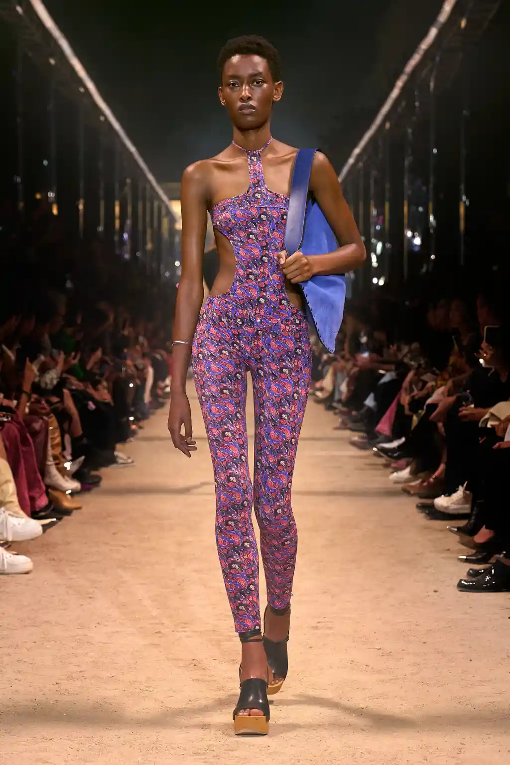 Sleek and sporty, Casablanca’s SS24 collection was influenced by time that Charaf Tajer and his team recently spent in Lagos getting inspired by the city’s energy. From this starting point, they introduced sunset hued garments evoking dynamic summer days. These gave way to sport silhouettes like second skin tops and skintight leggings and jumpsuits. Some models carried motorcycle helmets to accessorise their hoodies and moto jackets while others held beach towels under their arms. Denim co-ords and sporty bomber jackets depicted tennis players using a colourful Post-Impressionist style and intricate beading was woven into vest tops and mini skirts. These are clothes to take you from the tennis court, to the beach, to bars to drink rum cocktails and take in the sunset.