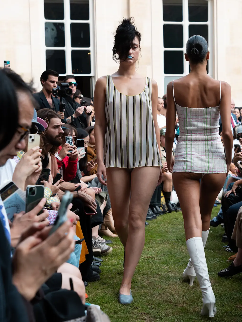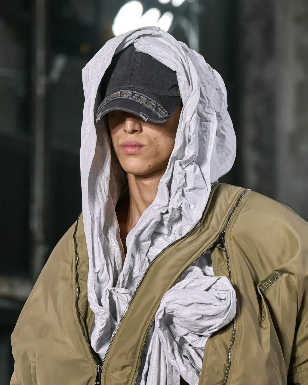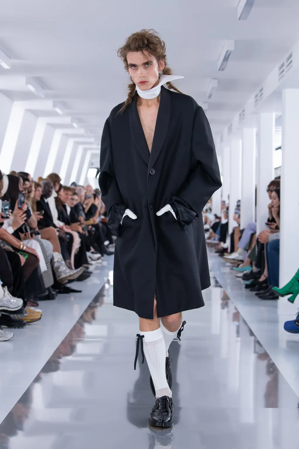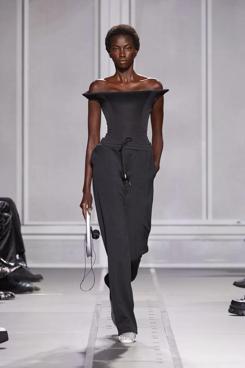 This was Coperni without the spray-on dress or Boston Dynamics robo-dogs. Instead, Sébastien Meyer and Arnaud Vaillant presented a stripped back, tech-focused collection exploring the interaction between clothing and sound.