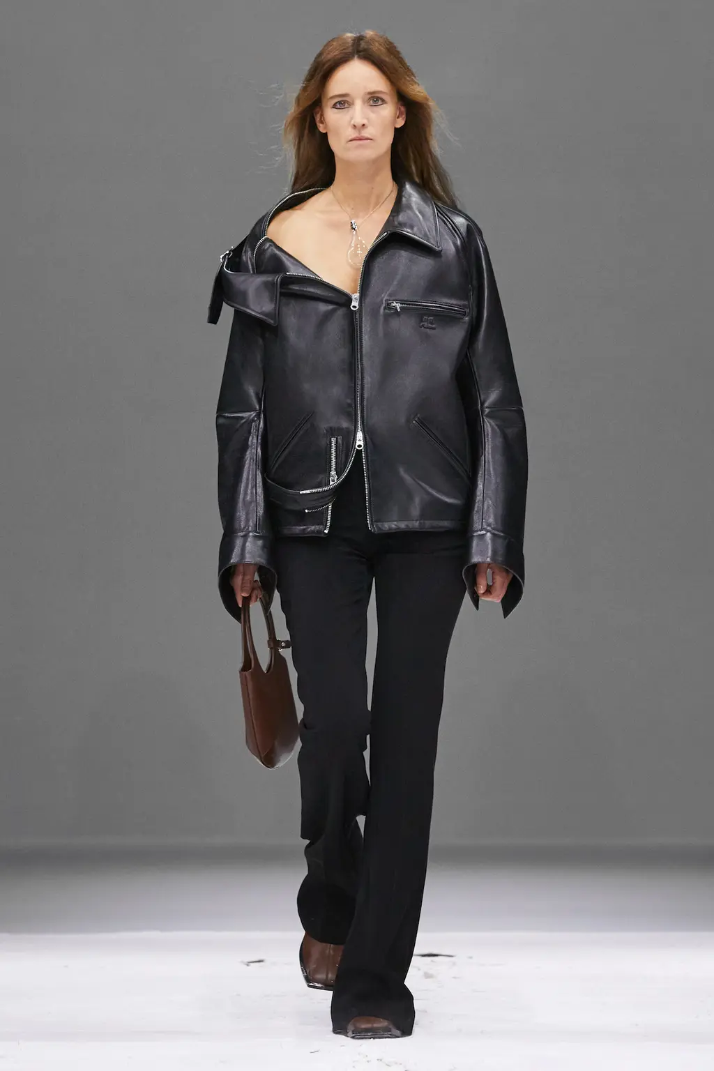 The collection was all about ordinary, everyday clothes with a subversive twist. Take the two opening chunky knit cardigans, for instance. Instead of being predictably twee, they were blown up into humorous proportions, cocooning the body and restricting arm movement, drawn together with giant shiny gold buttons. Leather trench coats were pinned up on one side while leather T‑shirts and shorts combos riffed on the glitchy garments from the SS23 collection.