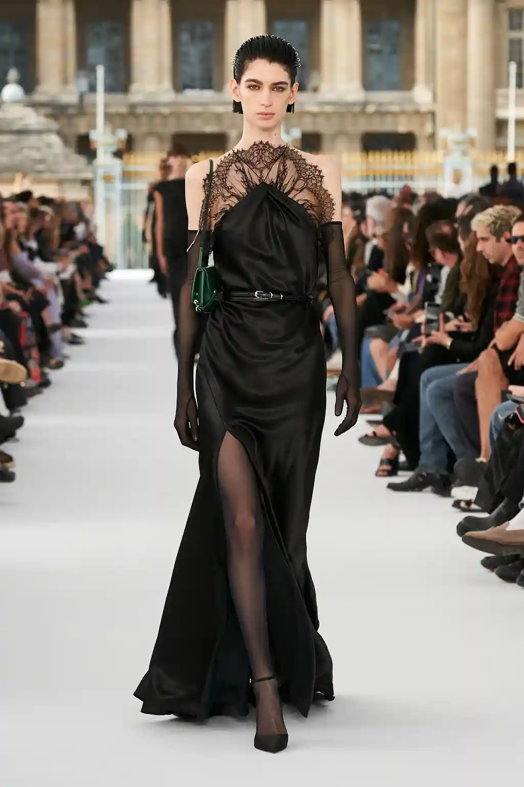 Wide tailored coats came in wool and satin, layered over diaphanous chiffon dresses, forming silhouettes that balanced the macho and the feminine. Dresses were mid-length and demure while sheer chiffon skirts with side slits were gathered at the waist. At other points, the collection incorporated black leather in dresses, shirts and skirts. Conversation starting evening-wear encompassed mid-century elegance, complete with romantic opera gloves à la Holly Golightly in Breakfast at Tiffany’s, sans cigarette holder. Following on from last season’s train of thought, the offering paid homage to Givenchy’s rich history, reinterpreting codes that are so timeless they still feel modern, much like the wardrobe of Audrey Hepburn herself.
