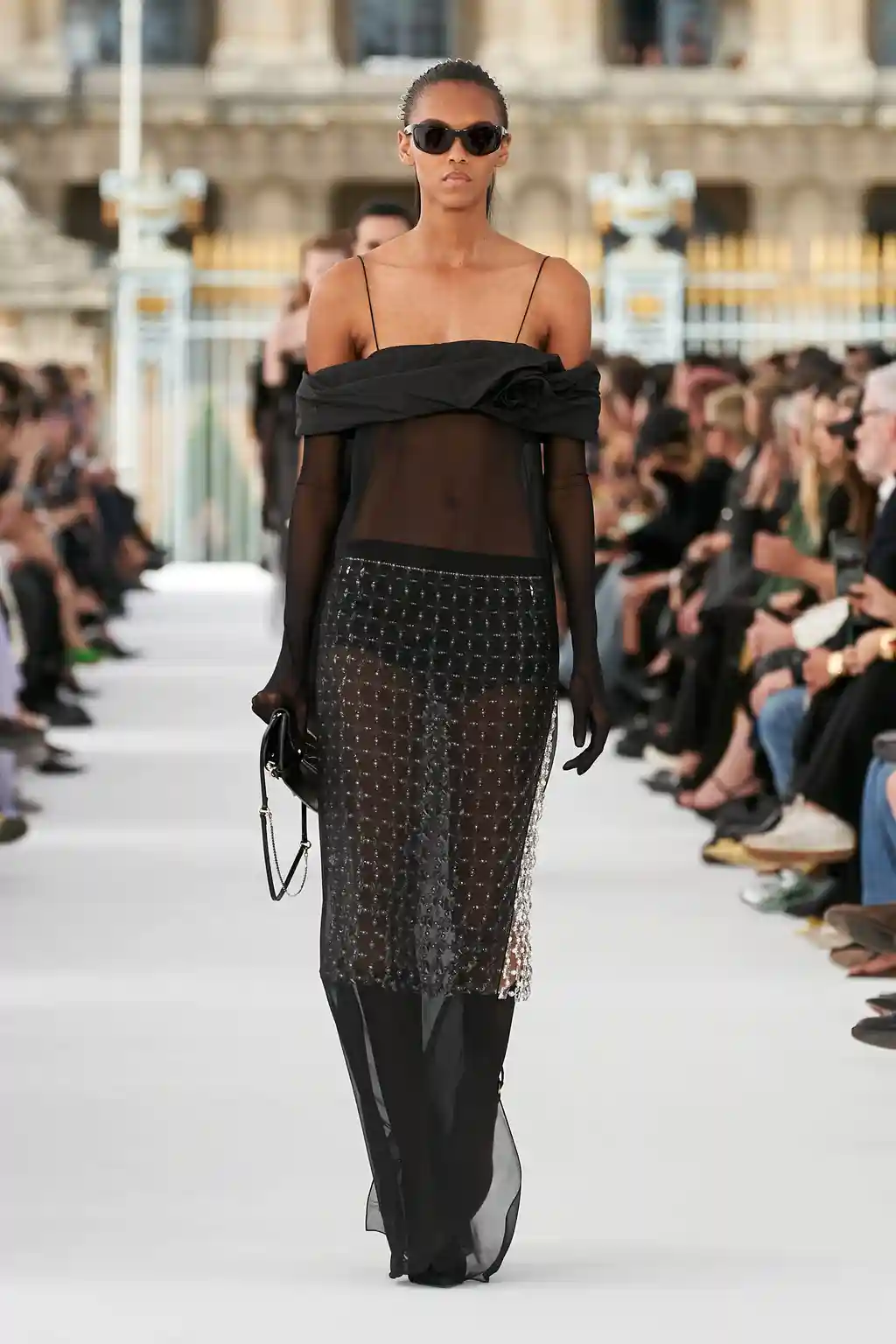Beneath the Louvre, inside Les Salles du Carrousel, large industrial fans created a theatrical wind tunnel so that chiffon trailed behind models like tentacles under the sea.