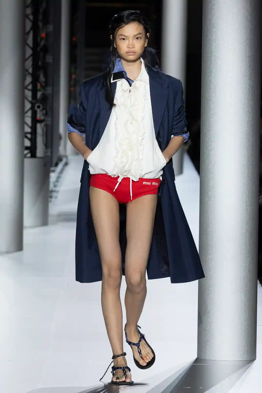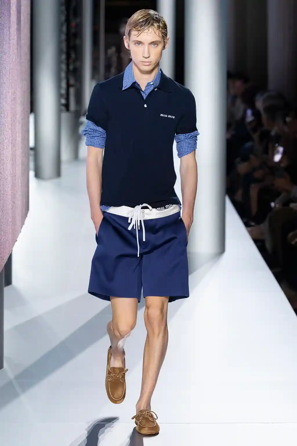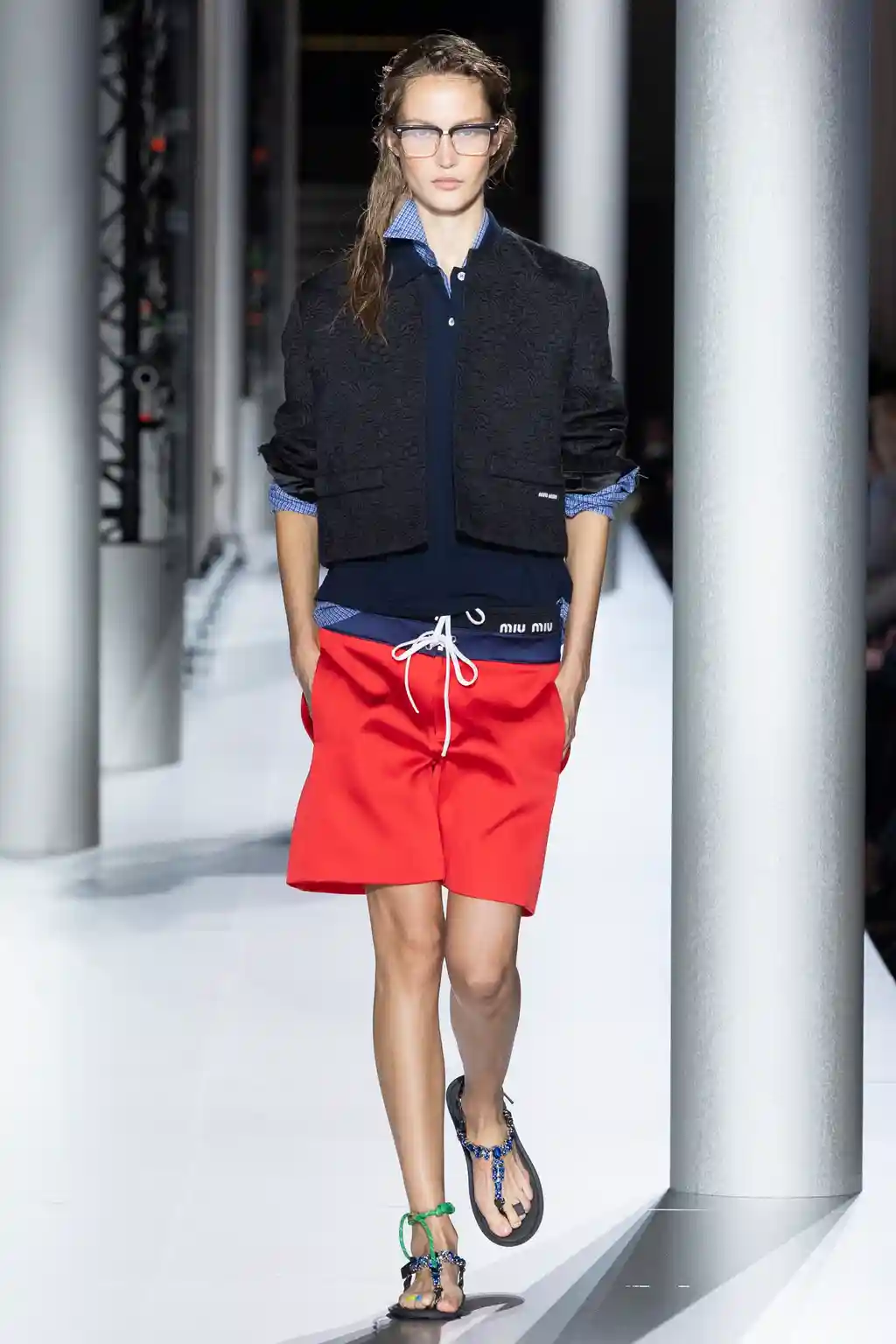 Brilliantly unconventional. The opening looks were a uniform of haphazard blazers, polo shirts worn over regular shirts, boyish silk shorts and flip flops accessorised with fluorescent blister plasters. It felt like a tribute to the creative fashion accidents we might make when we’re in a rush. According to the show notes, this irregular styling was about the “embracing of unique characters, the joy of life.”
