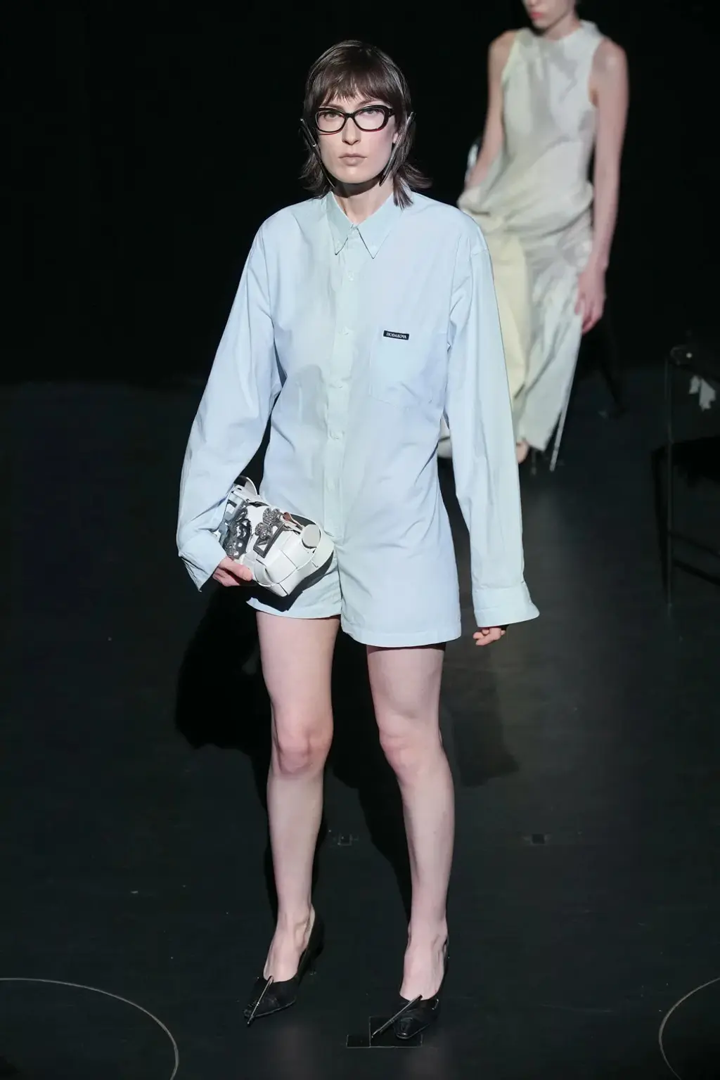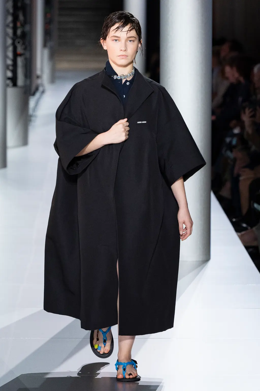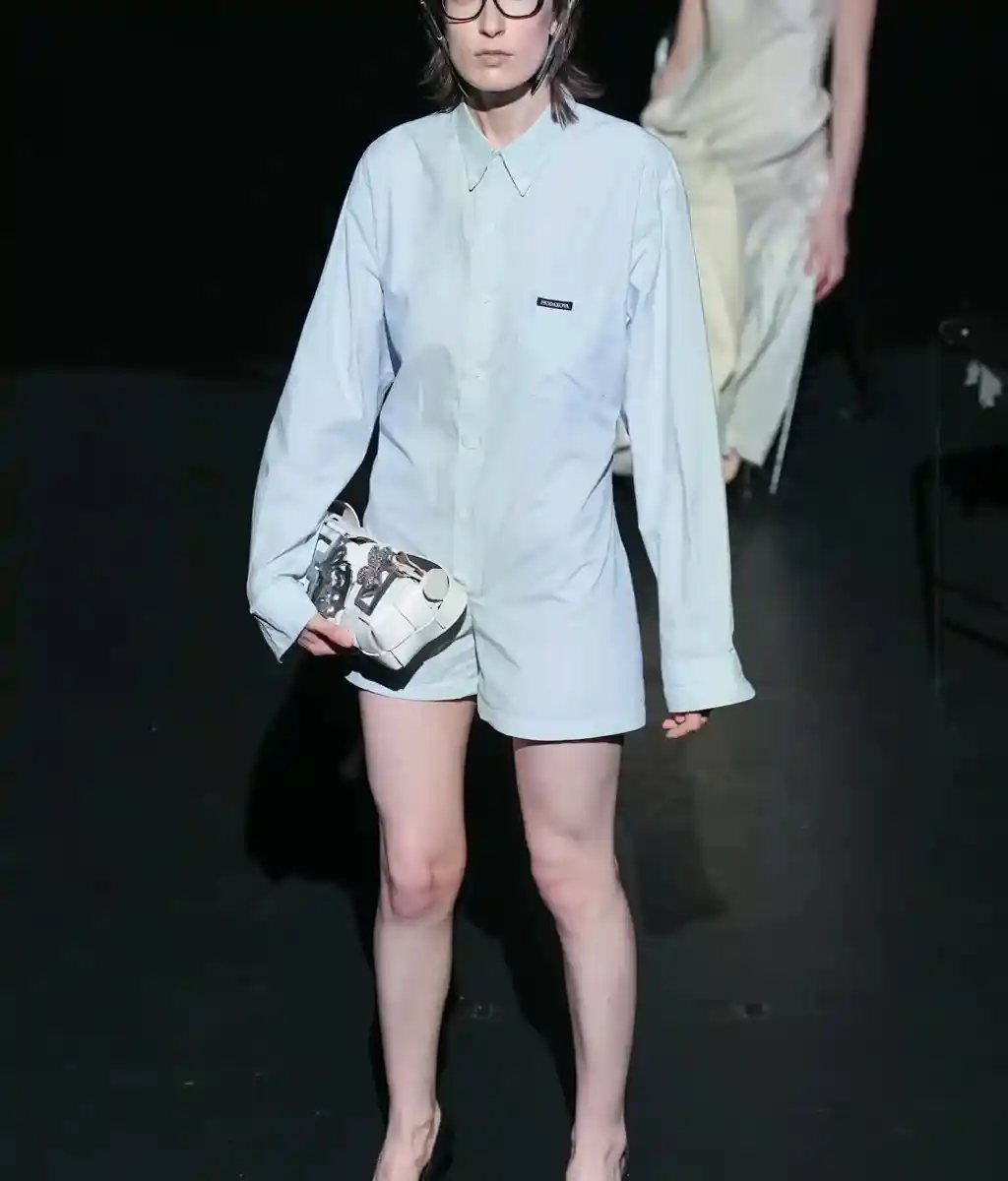 Brilliantly unconventional. The opening looks were a uniform of haphazard blazers, polo shirts worn over regular shirts, boyish silk shorts and flip flops accessorised with fluorescent blister plasters. It felt like a tribute to the creative fashion accidents we might make when we’re in a rush. According to the show notes, this irregular styling was about the “embracing of unique characters, the joy of life.”