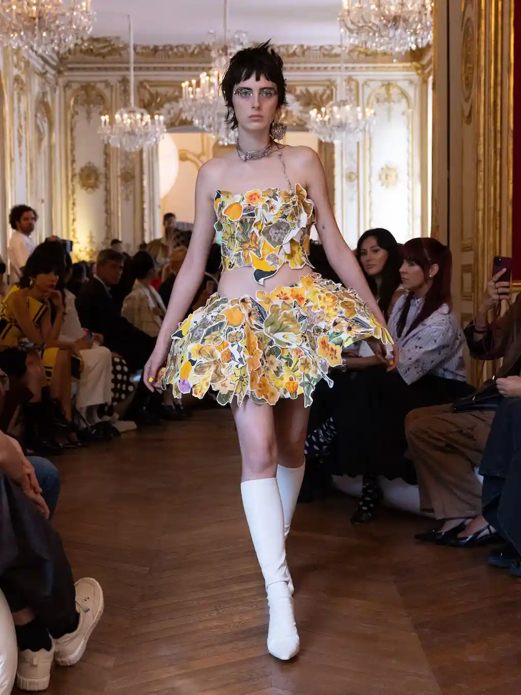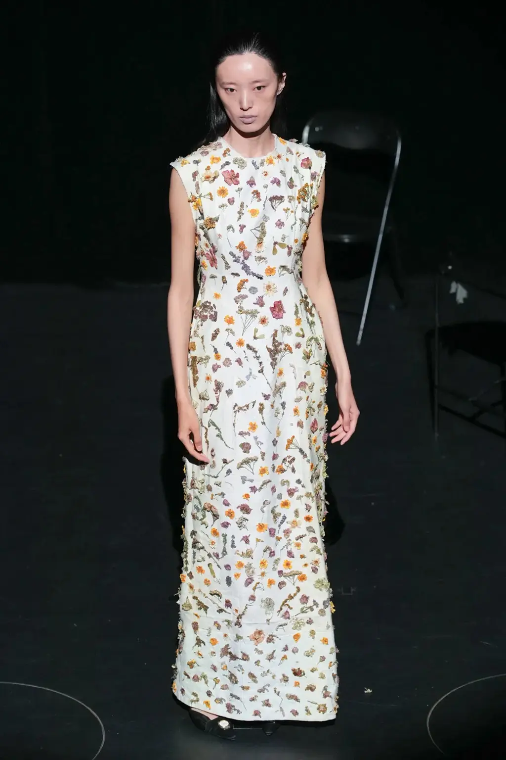 Smart, elegant, and very playful. The collection took inspiration from Risso’s adolescent memories of Paris, like the afternoons he spent with a friend, obsessively spying on Lagerfeld as he to’d and fro’d from his apartment. Or the time he met a beautiful woman at a party who disappeared as soon as she arrived, leaving behind a waft of perfume. This nostalgia, steeped in romance, was most poignantly felt through dresses made from collaged images of flowers sourced from antique botanical almanacks.