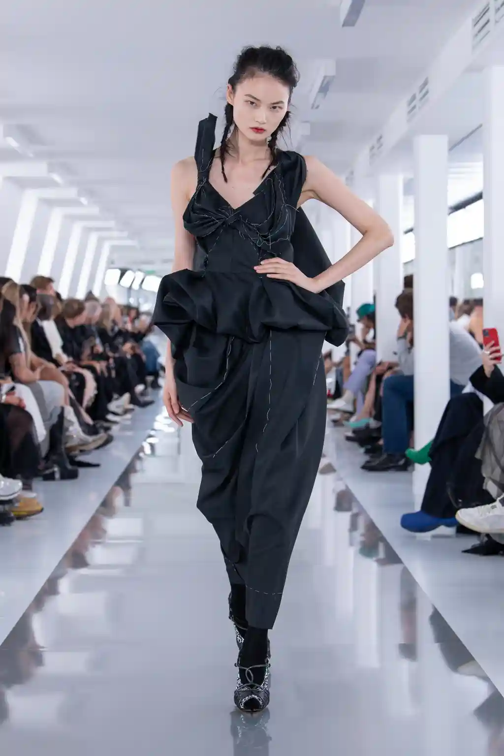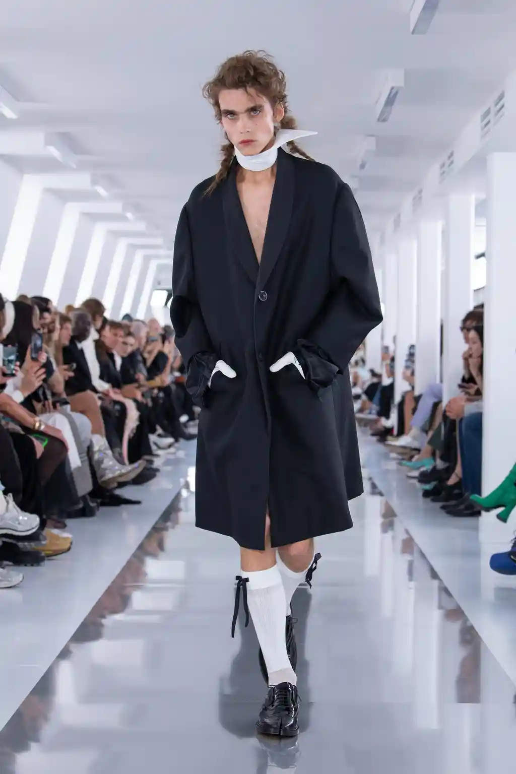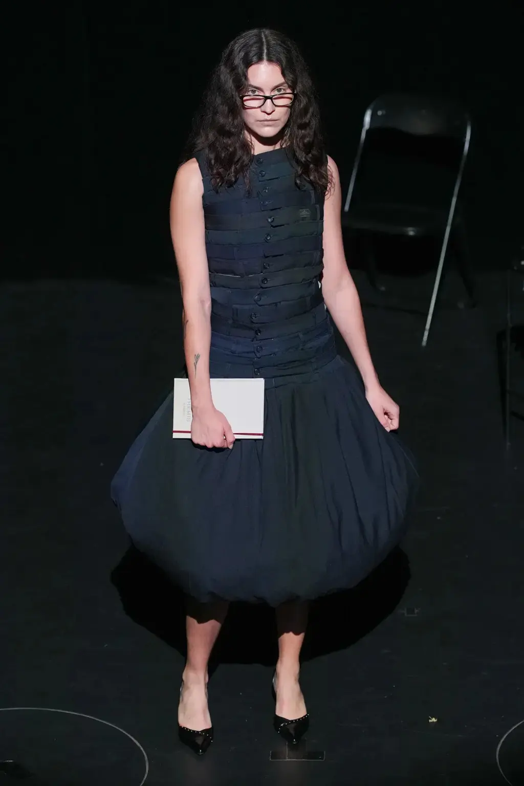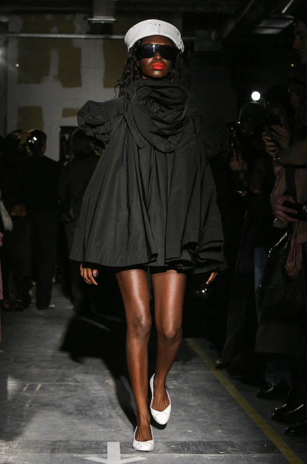 The show kicked off with voluminous black tailored coats, worn with oversized white shirt collars and Tabi brogues. These soon gave way to certain Galliano-isms, such as 1950s cropped ball gowns and eccentric wonky hats. A DIY fashion school spirit came through bin bag dresses, lampshade hats and exposed stitching, balanced with smart tailoring and coquettish knee-high socks. Each model became a character, adding a fresh dimension to each look and proving that storytelling can help strike a balance between commerciality and creativity.